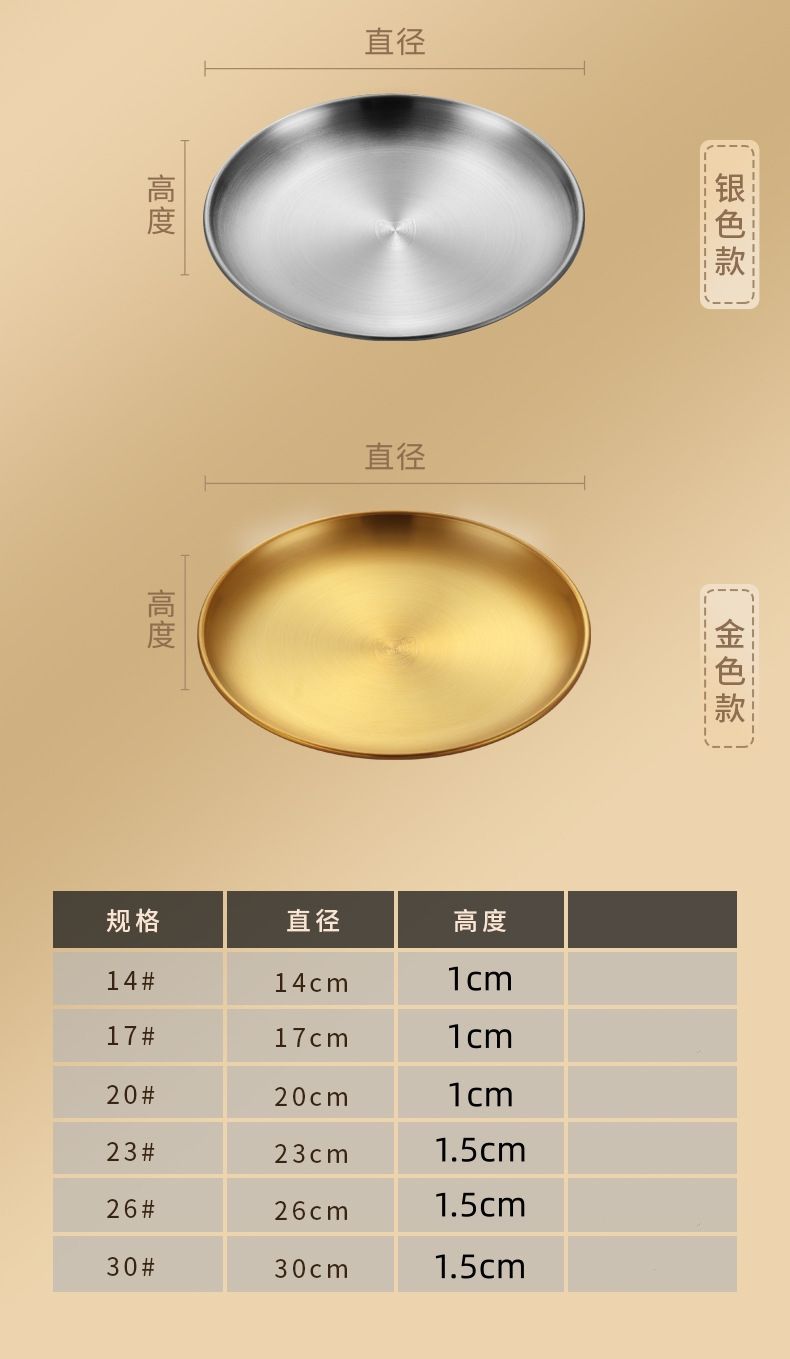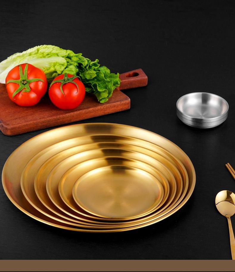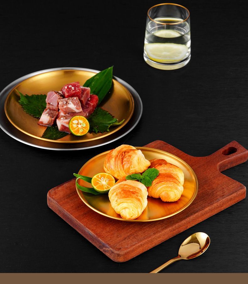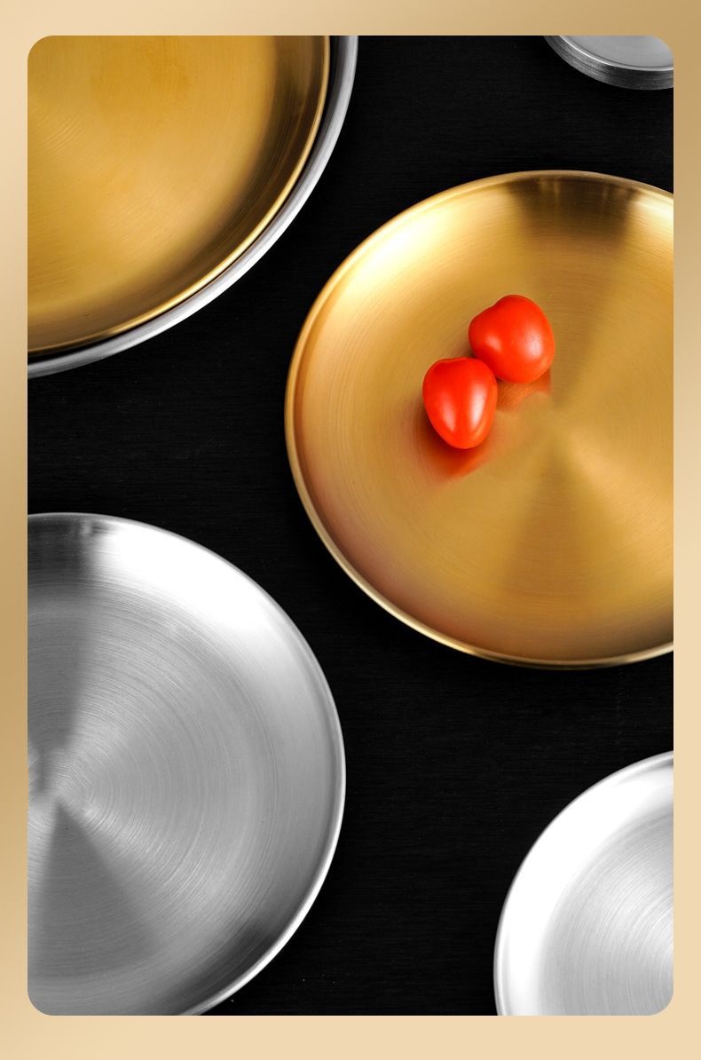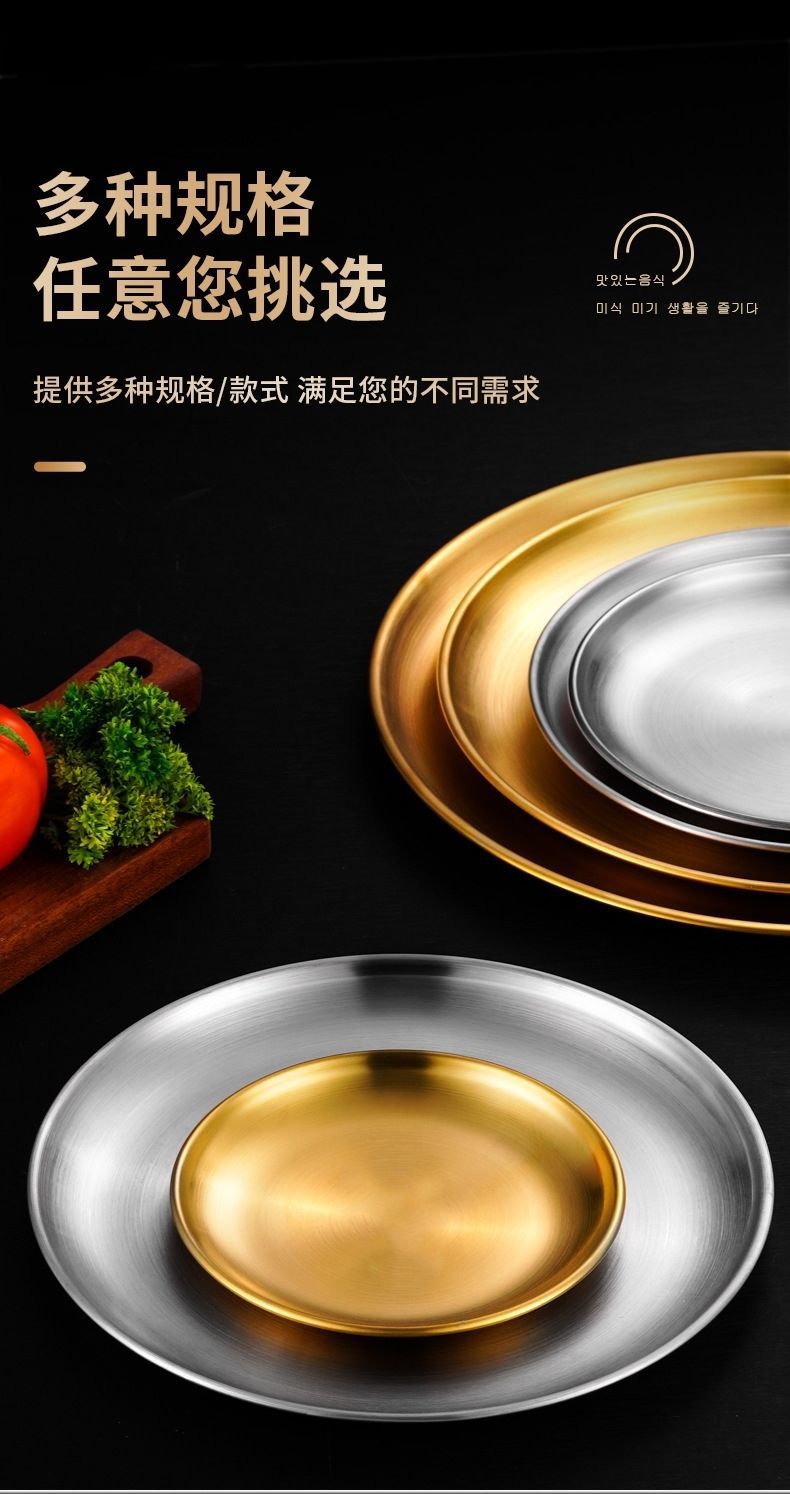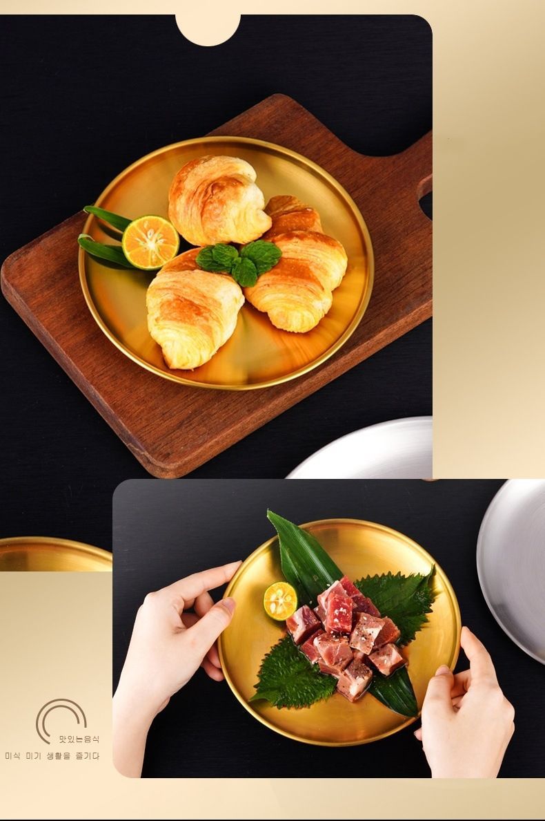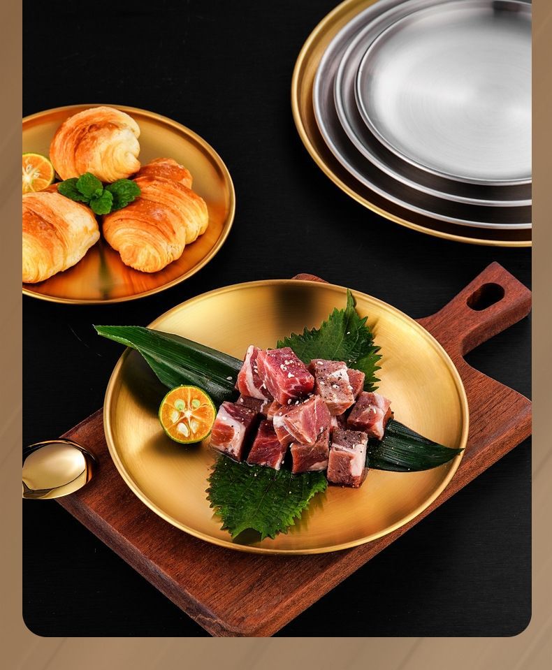두꺼운 스테인레스 스틸 접시 한국 레스토랑 바베큐 접시 서양 음식 접시 라운드 케이크 디저트 과일 접시 바베큐 접시