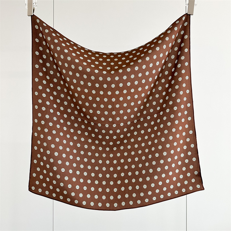 • 크레이프 드 신 브라운 그린 폴카 도트 스퀘어 스카프