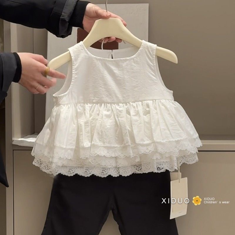 아동복 소녀 여름 달콤한 케이크 조끼 2025 새로운 여성 보물 틈새 레이스 레이스 퍼프 메쉬 셔츠스토어 가기