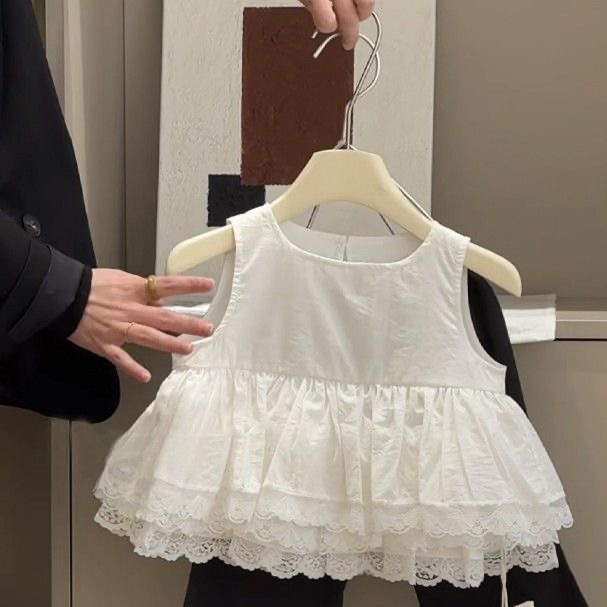 아동복 소녀 여름 달콤한 케이크 조끼 2025 새로운 여성 보물 틈새 레이스 레이스 퍼프 메쉬 셔츠