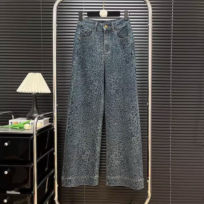 봄, 가을 여성용 유럽 스타일 핫 다이아몬드 레오파드 프린트 하이 웨이스트 레트로 워싱 청바지, 다재다능하고 패셔너블하며 루즈한 스트레이트 바닥 길이 바지스토어 가기