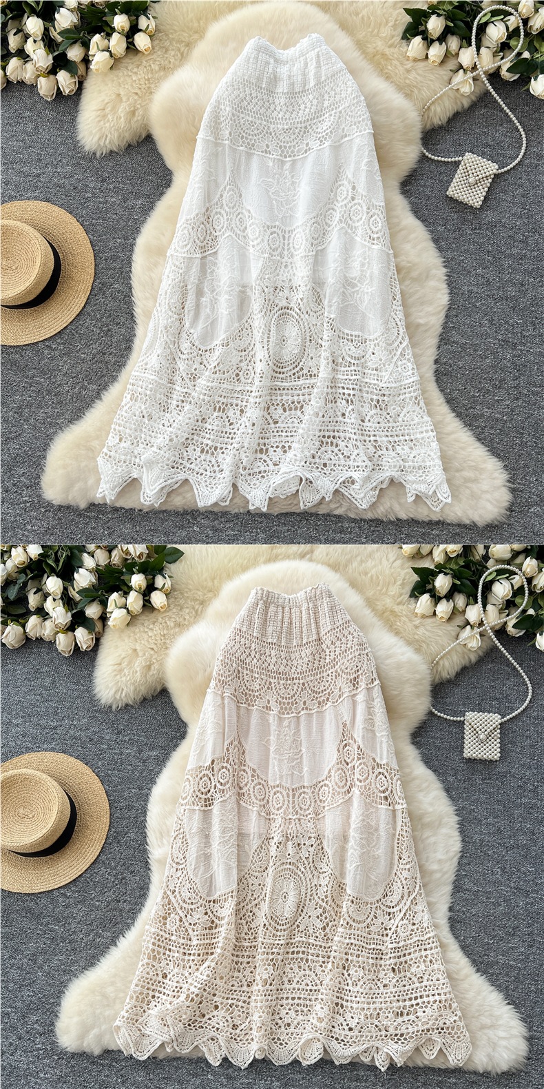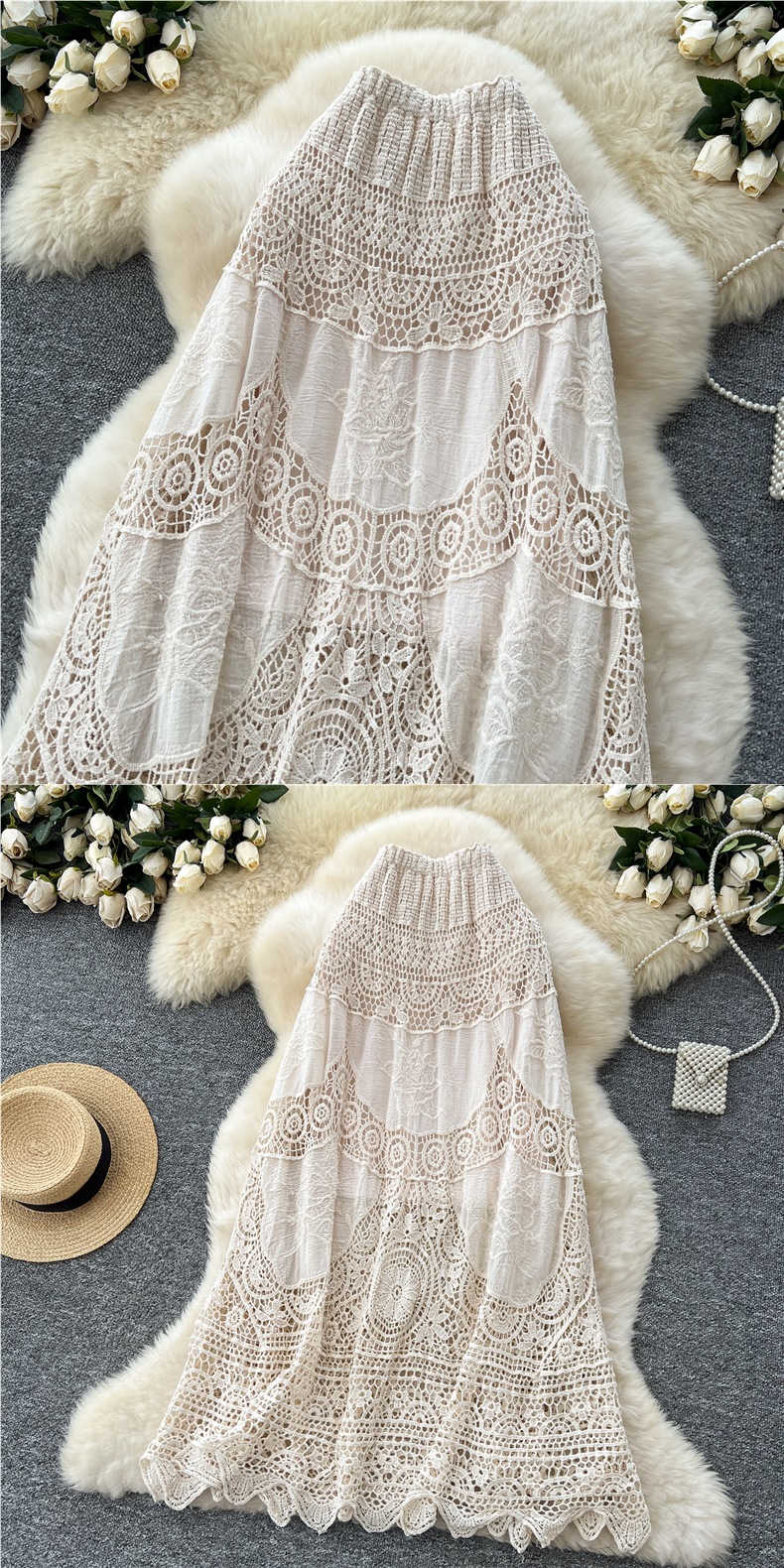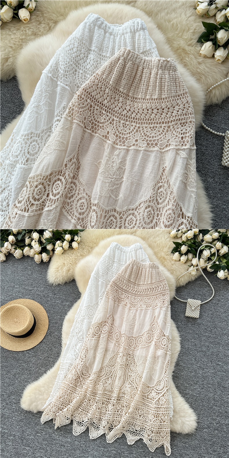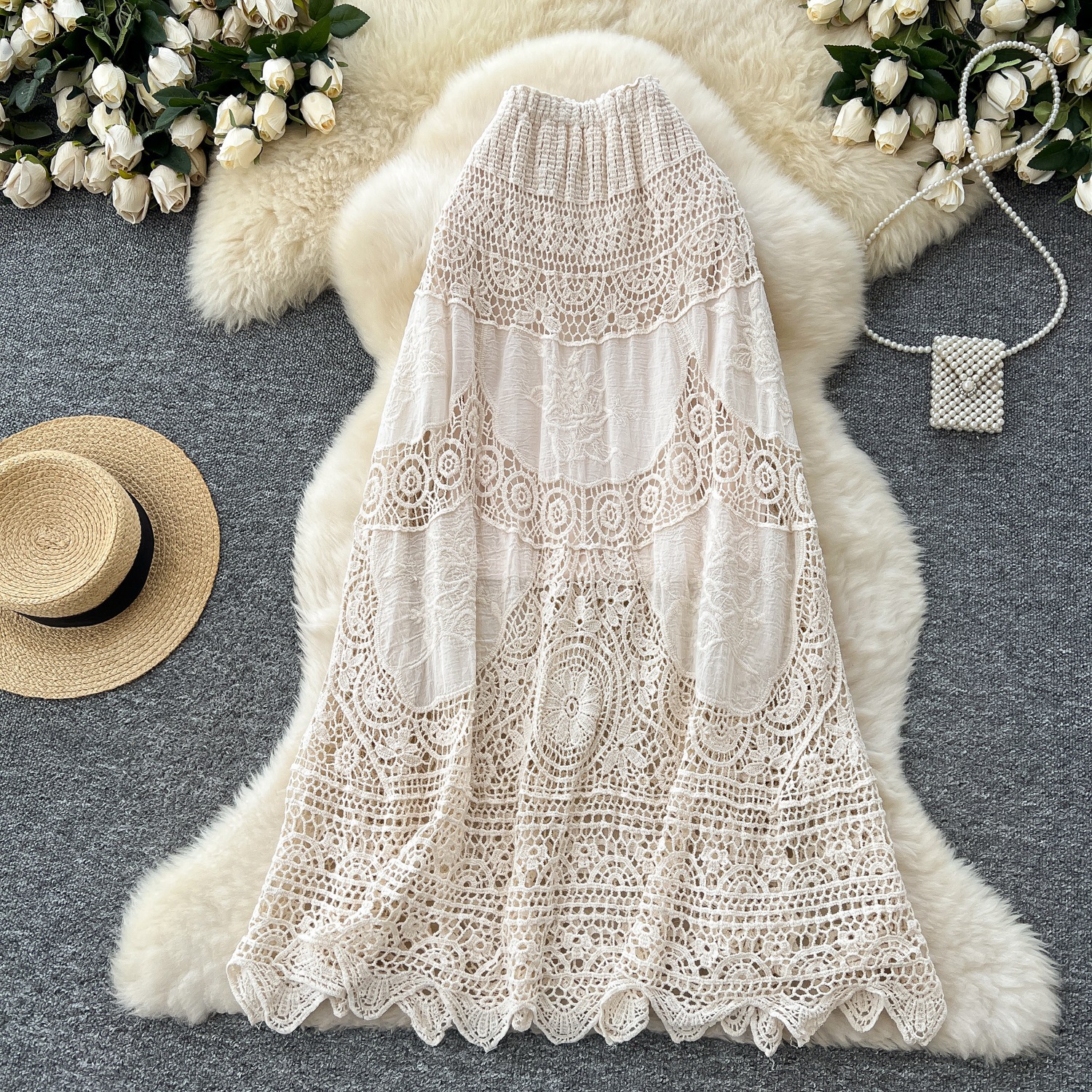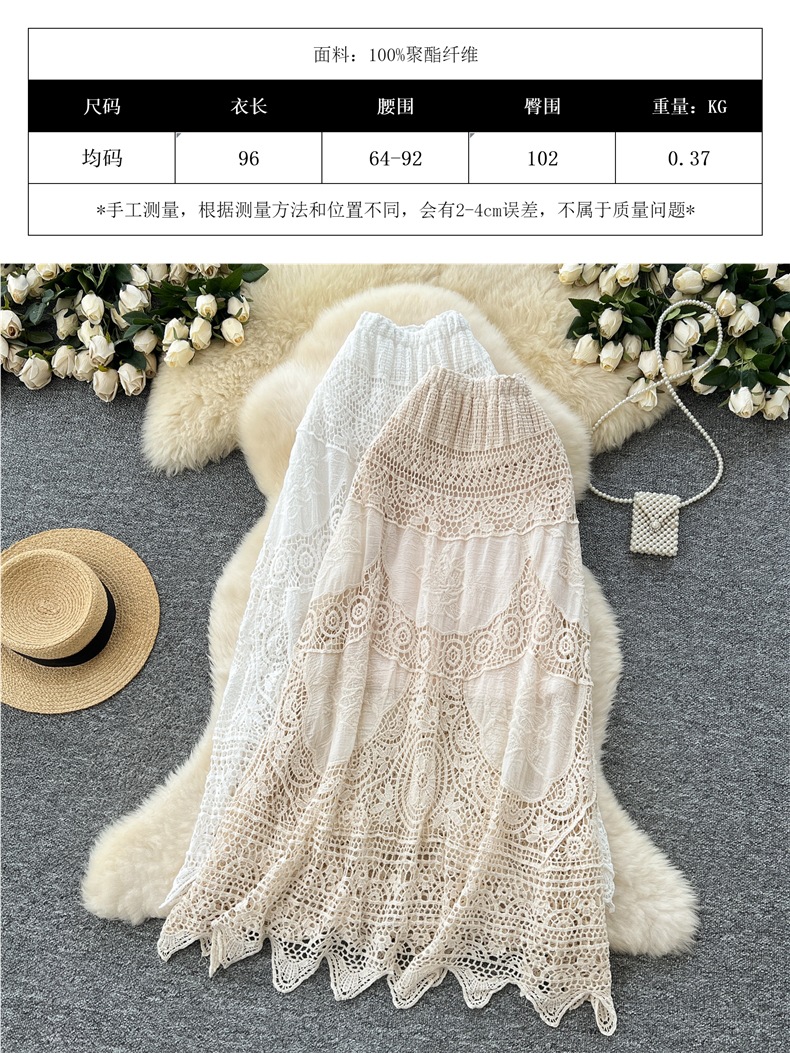 보헤미안 스타일 니트 스커트 여성 여름 중공 크로 셰 뜨개질 자수 슬림 타이트 허리 디자인 긴 스커트