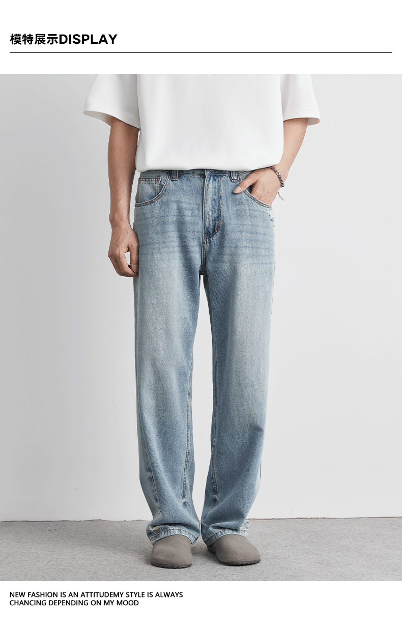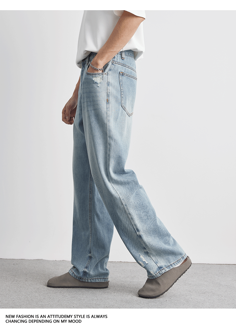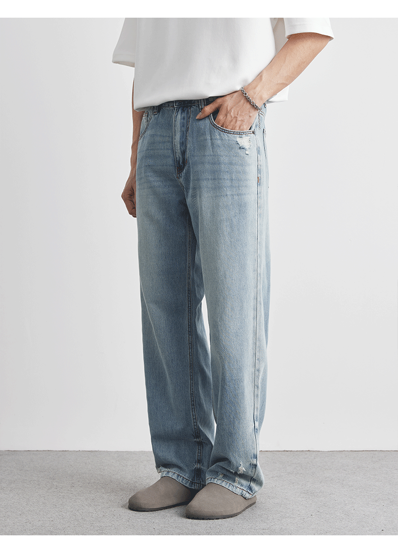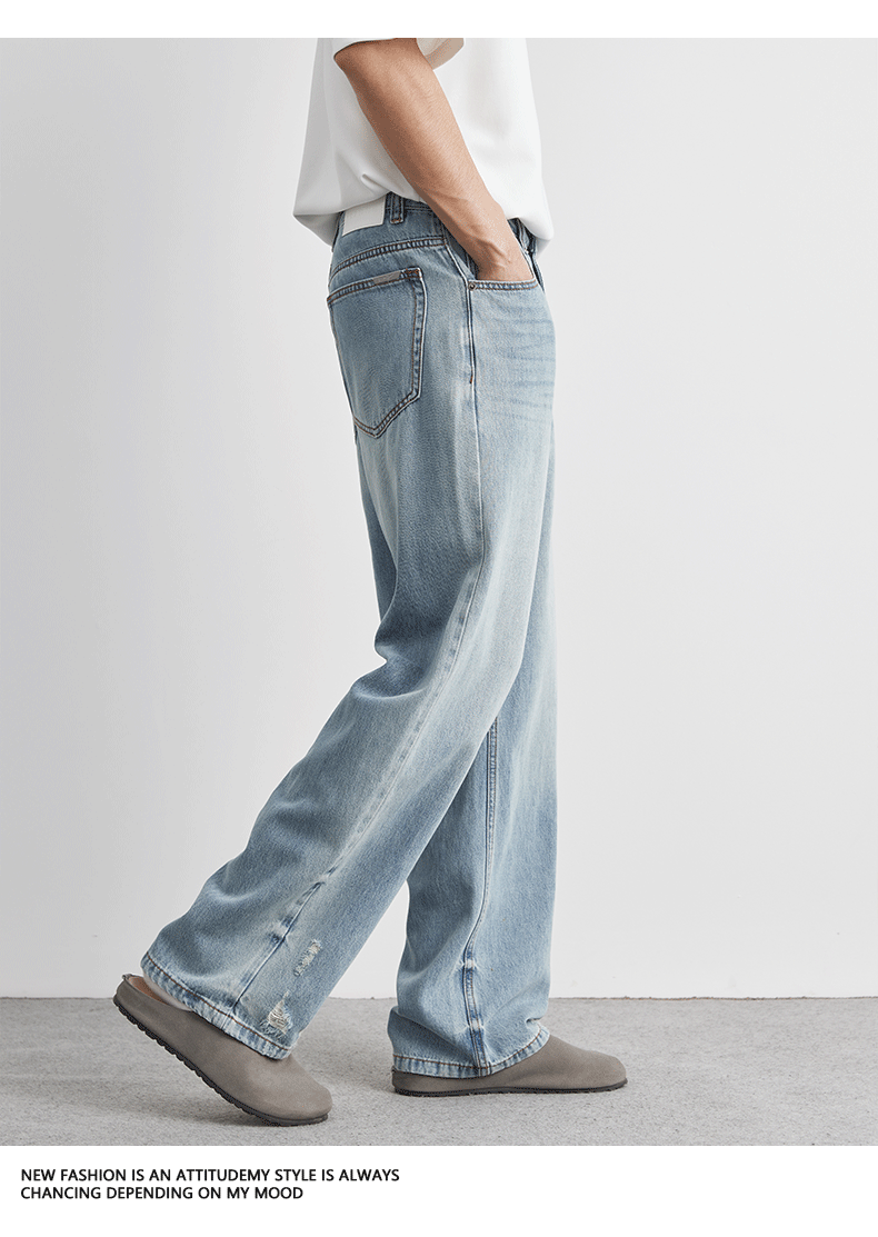 또한 클린 핏 씻은 밝은 색 청바지 남성 여름 새로운 찢어진 스트레이트 바지 얇은 남성 바지스토어 가기