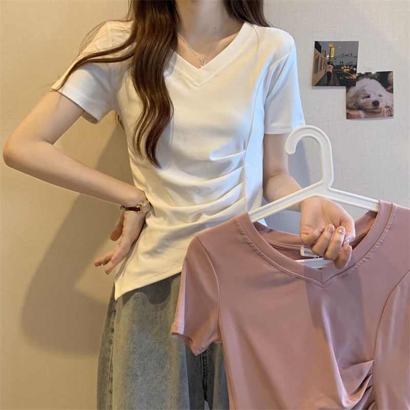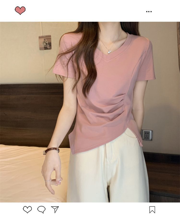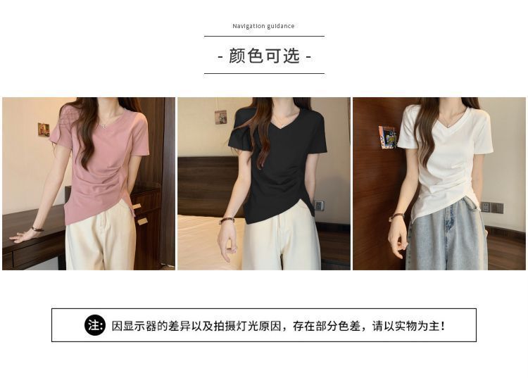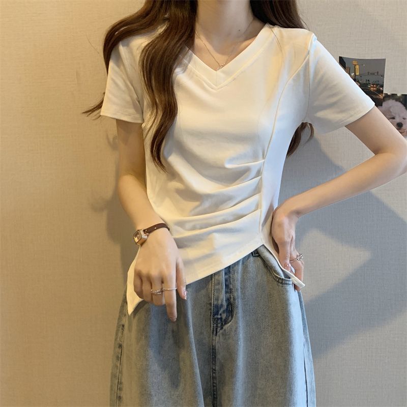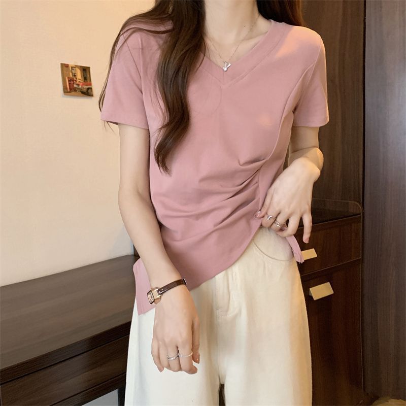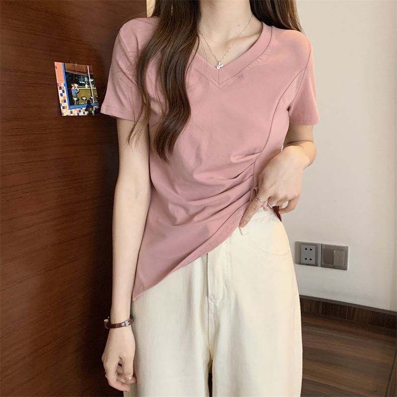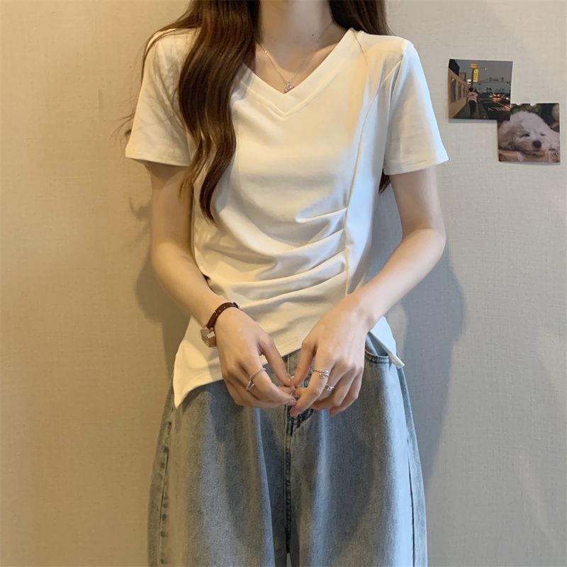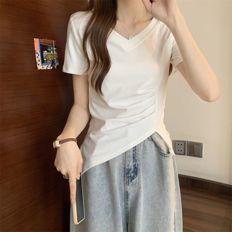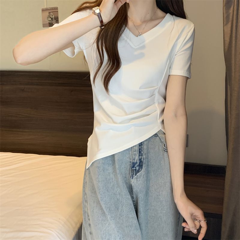 플러스 사이즈 여성용 불규칙한 V 넥 어깨 반팔 티셔츠 여름 슬리밍 디자인 탑스토어 가기