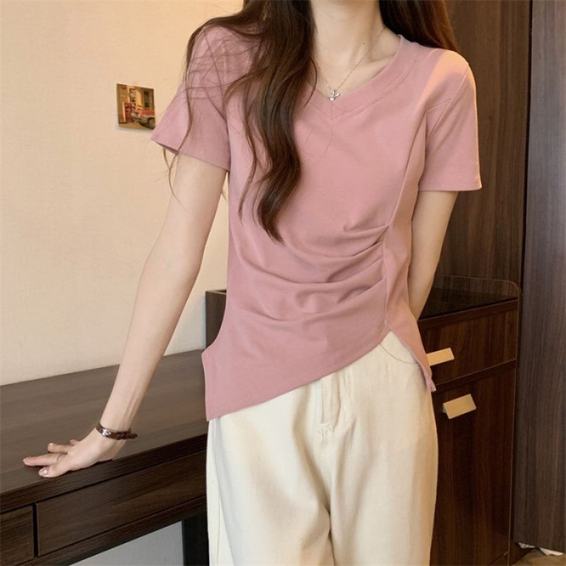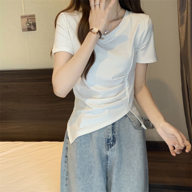 플러스 사이즈 여성용 불규칙한 V 넥 어깨 반팔 티셔츠 여름 슬리밍 디자인 탑