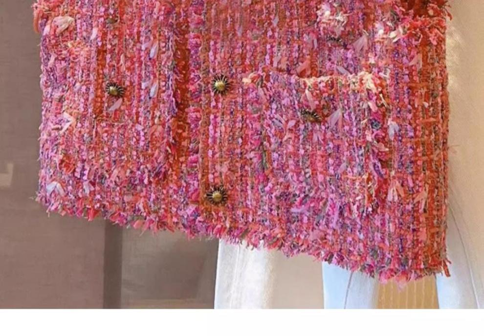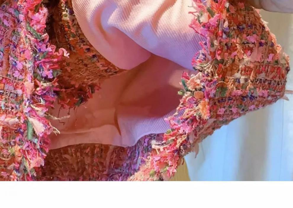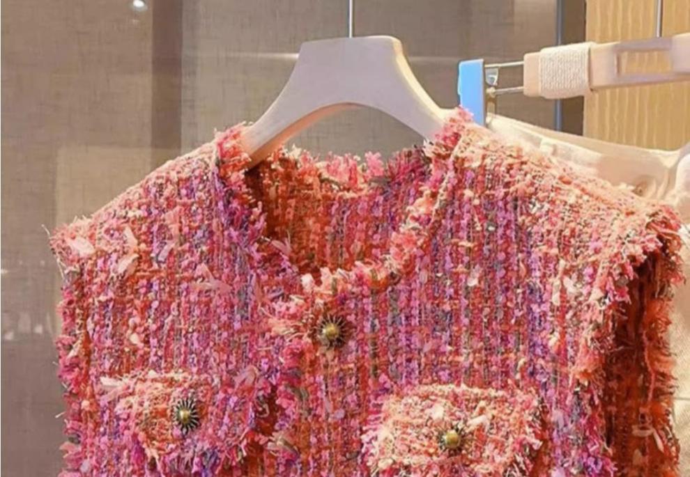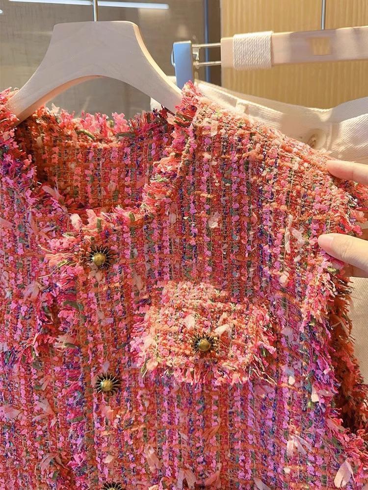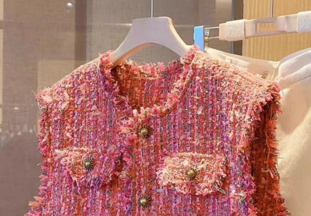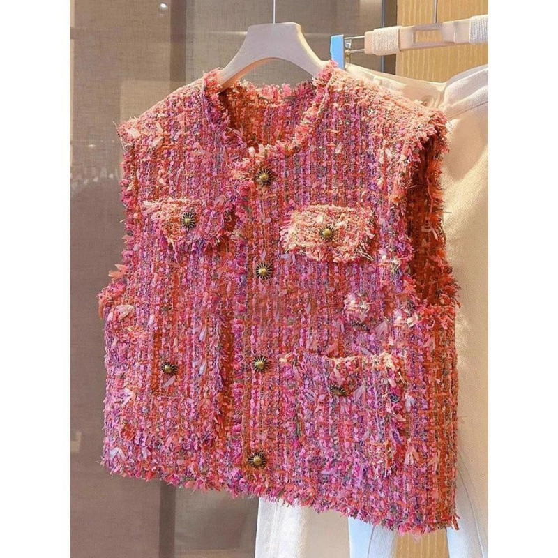 여성을위한 핑크 트위드 작은 향기로운 조끼 2024 봄, 여름 새로운 스타일 하이 엔드 독특한 재킷 슈퍼 멋진 탑스토어 가기