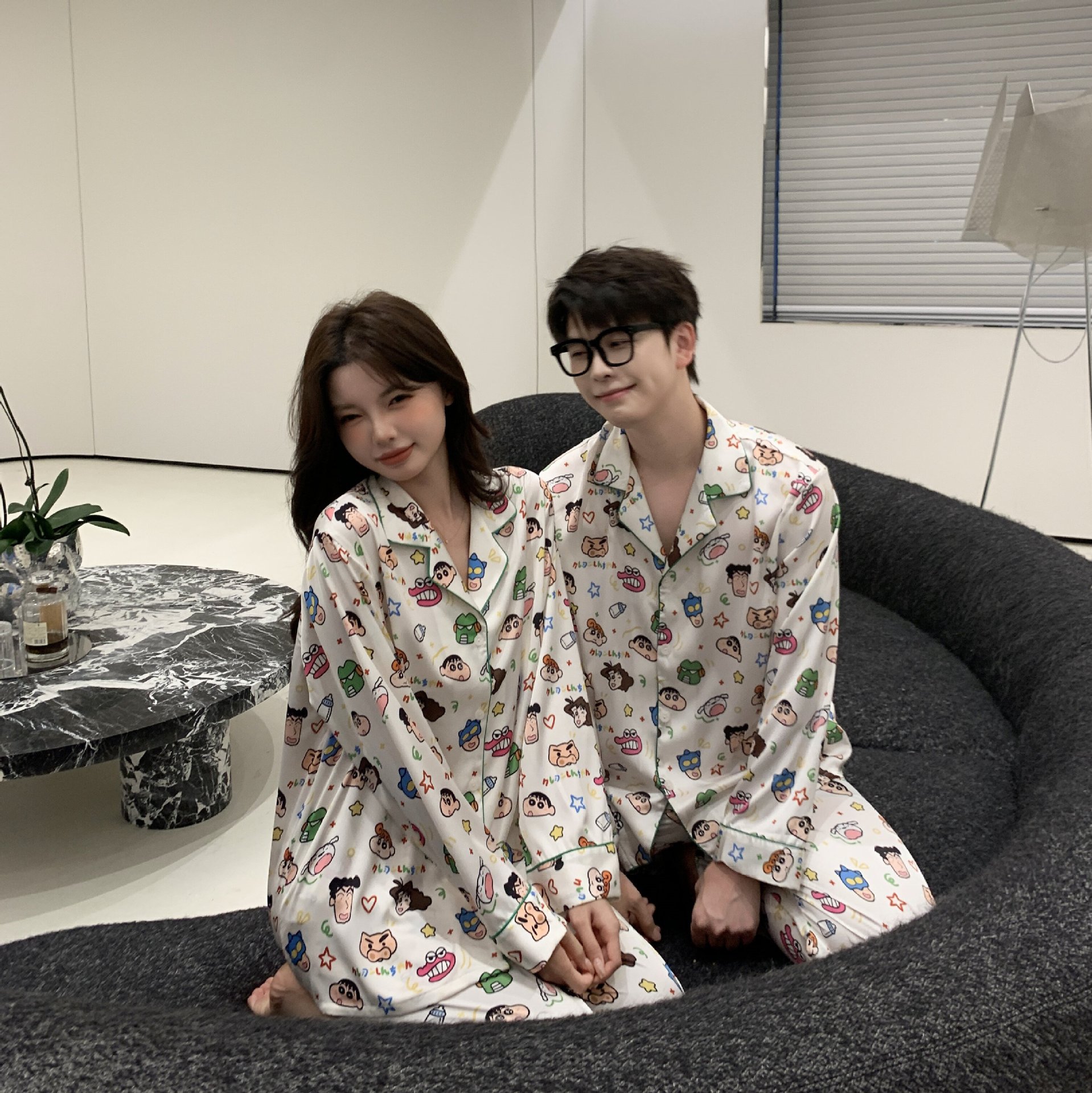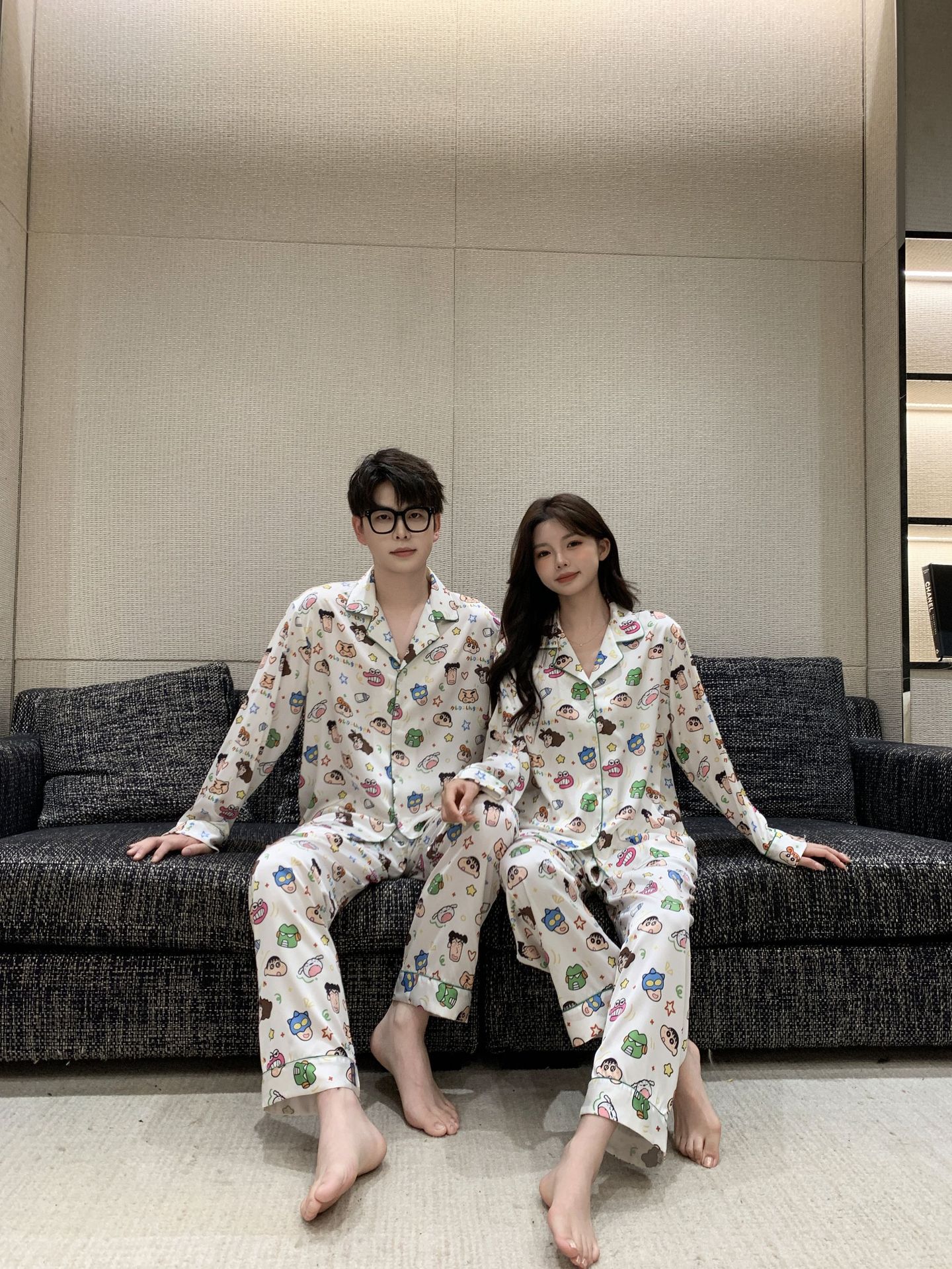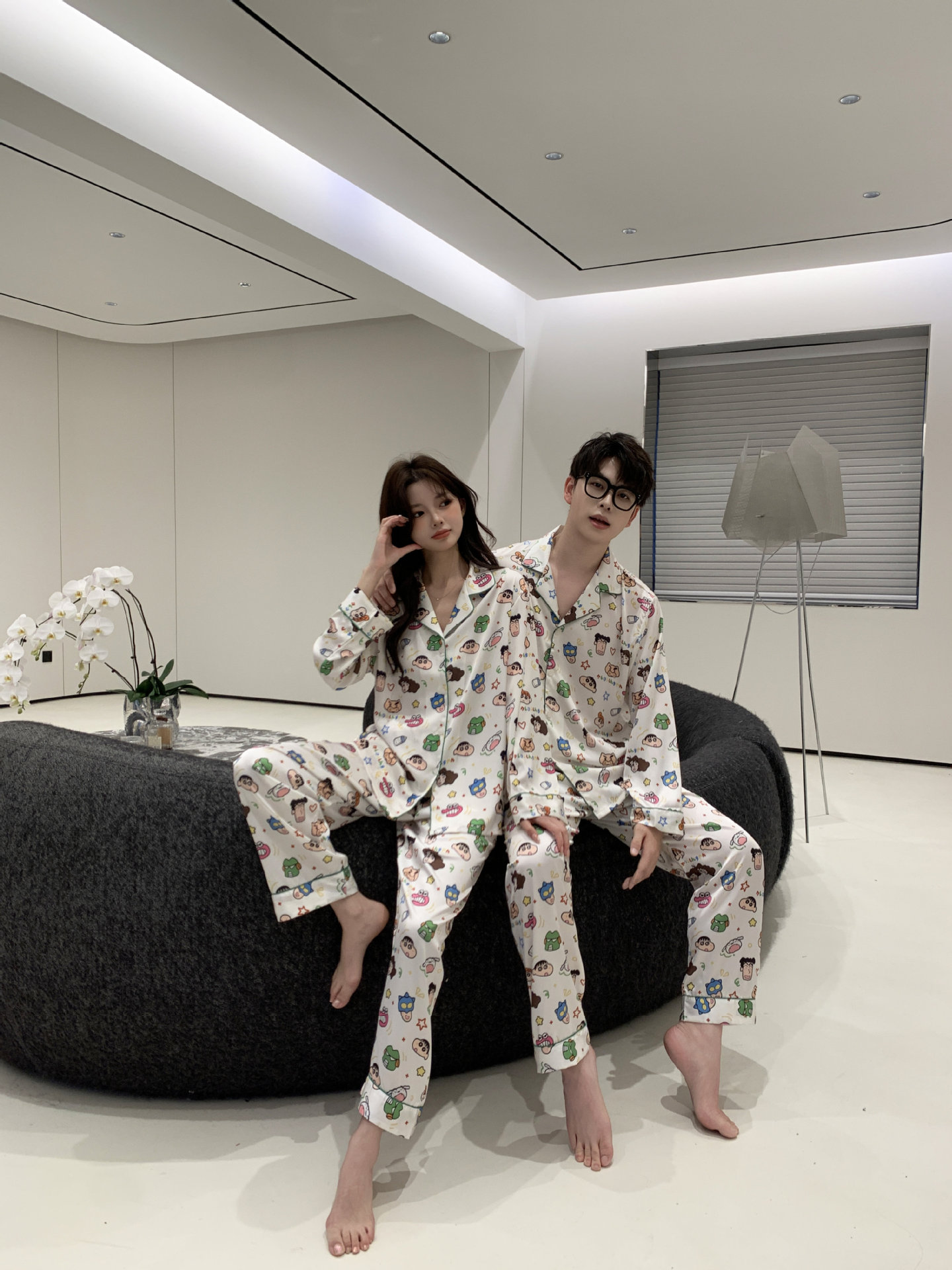 [커플] 샤오 신 커플 파자마 여성 아이스 실크 긴 소매 귀여운 만화 실크 하이 엔드 새틴 홈 옷 남성
