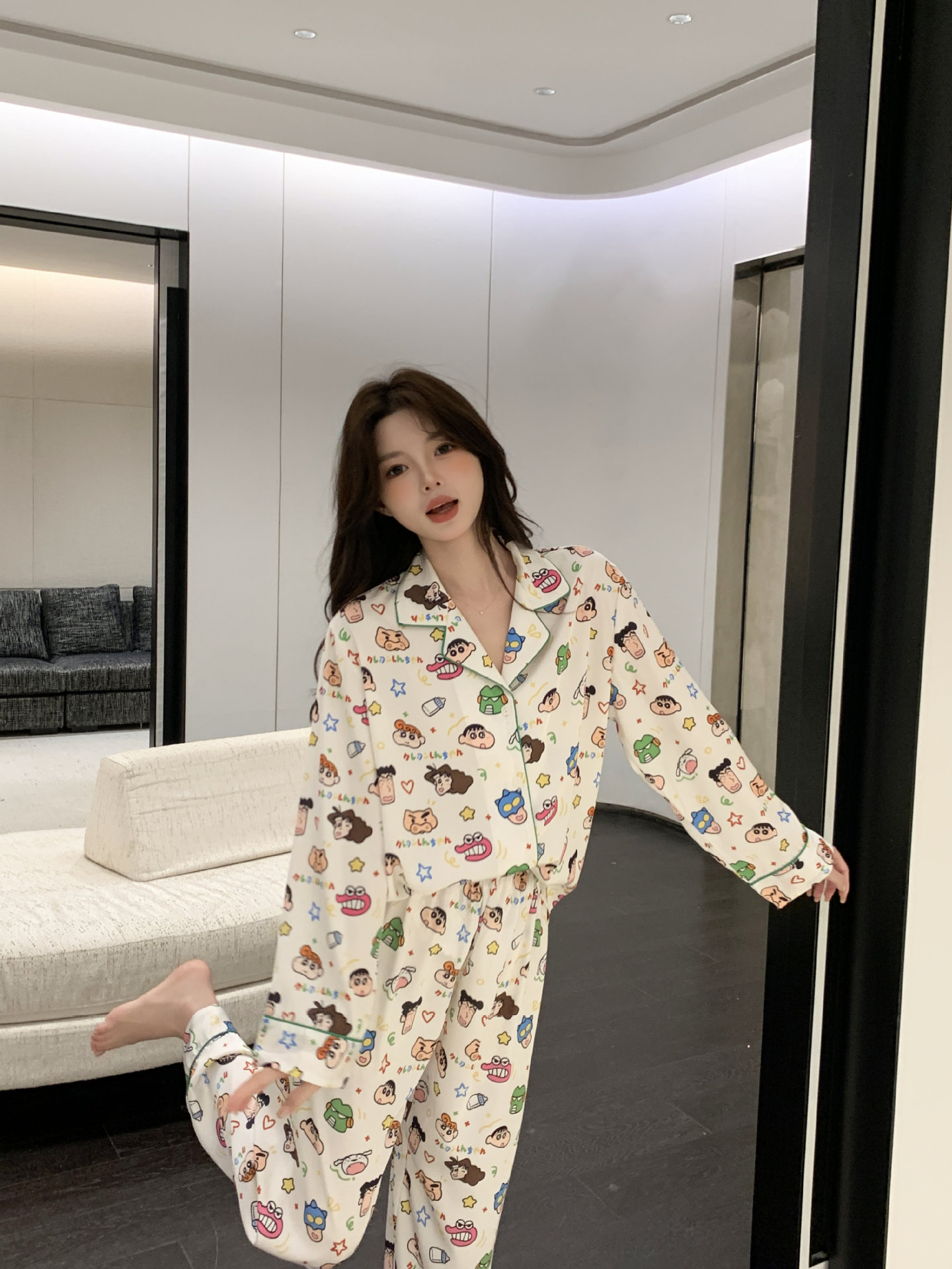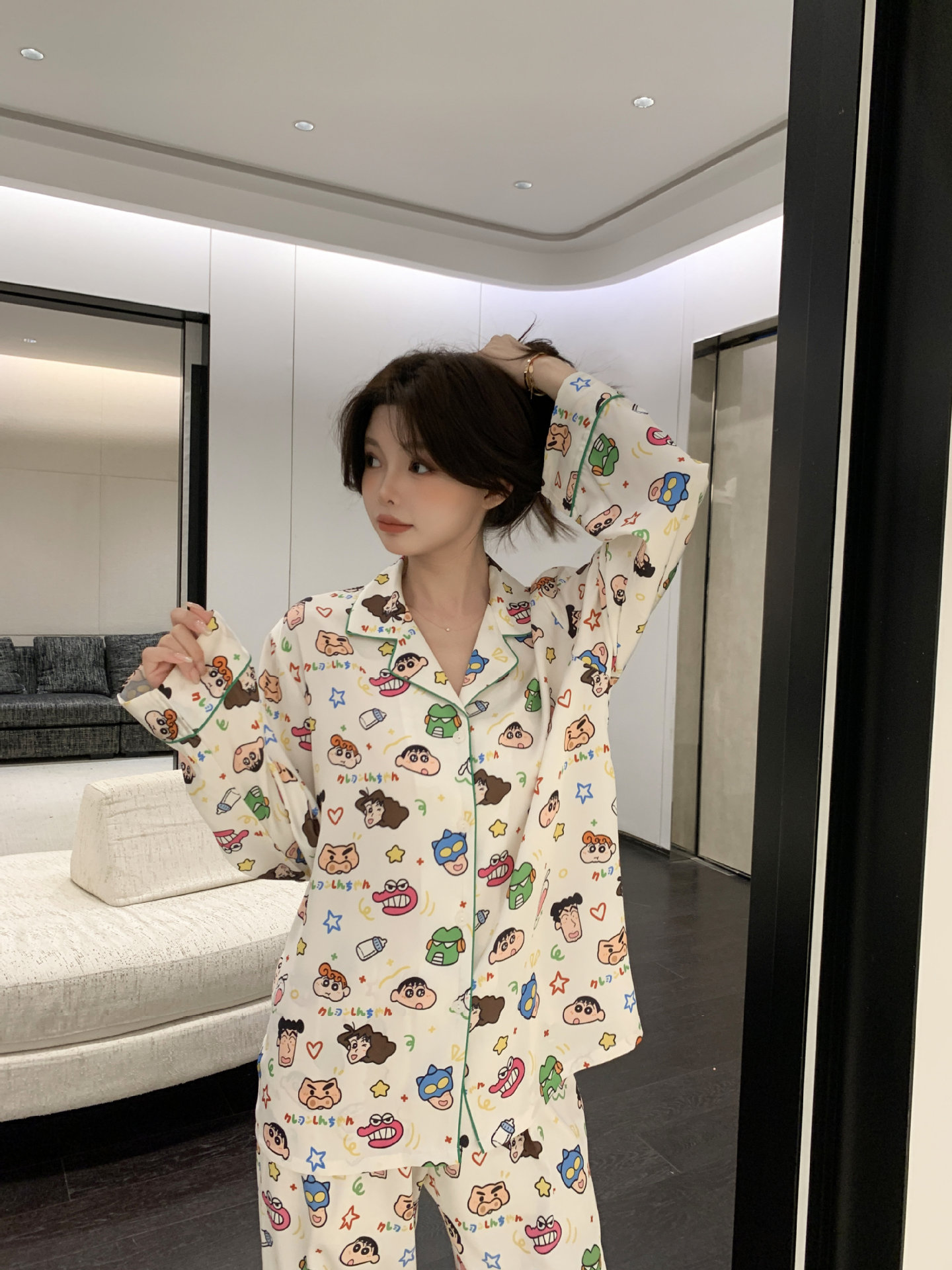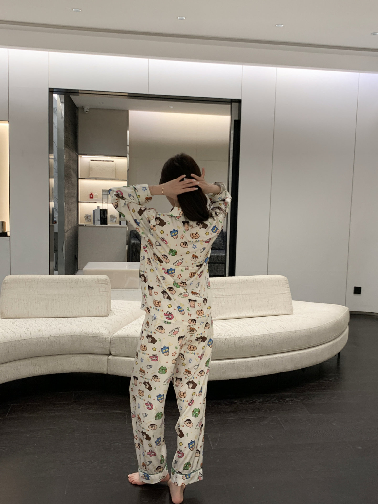 [커플] 샤오 신 커플 파자마 여성 아이스 실크 긴 소매 귀여운 만화 실크 하이 엔드 새틴 홈 옷 남성스토어 가기