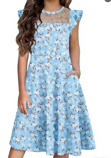 소녀의 원피스 여름 접힌 소매 메쉬 A 라인 캐주얼 파티 원피스 벨트 원피스 원피스 포켓스토어 가기