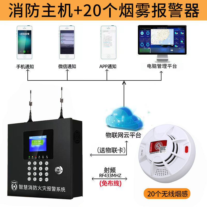 • 공장 호텔 병원 학교 상점 화재 연기 시스템 - 고급 4G 화재 호스트 + 연기 감지기 20개