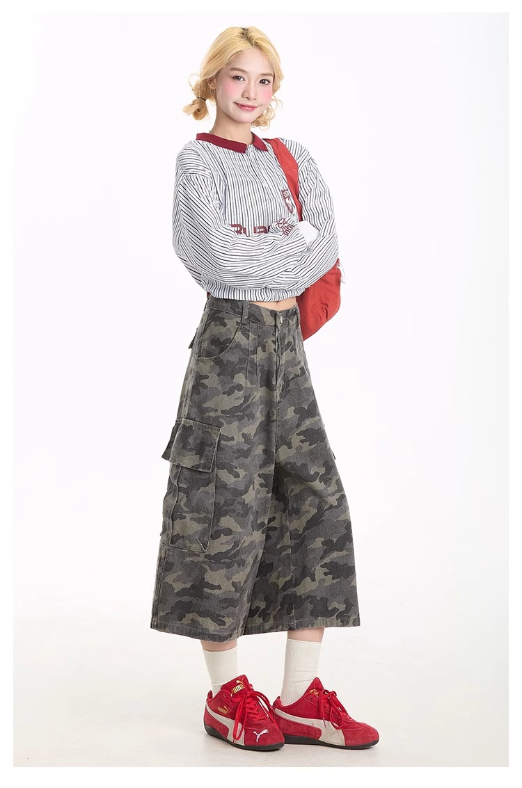 미국 위장 데님 카프리 바지 여자 2025 년 여름 새로운 넓은 다리 큰 포켓 느슨한 스트레이트 툴링 반바지