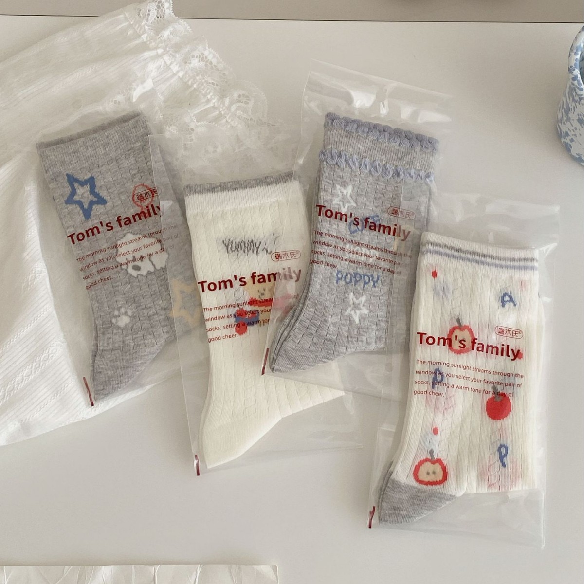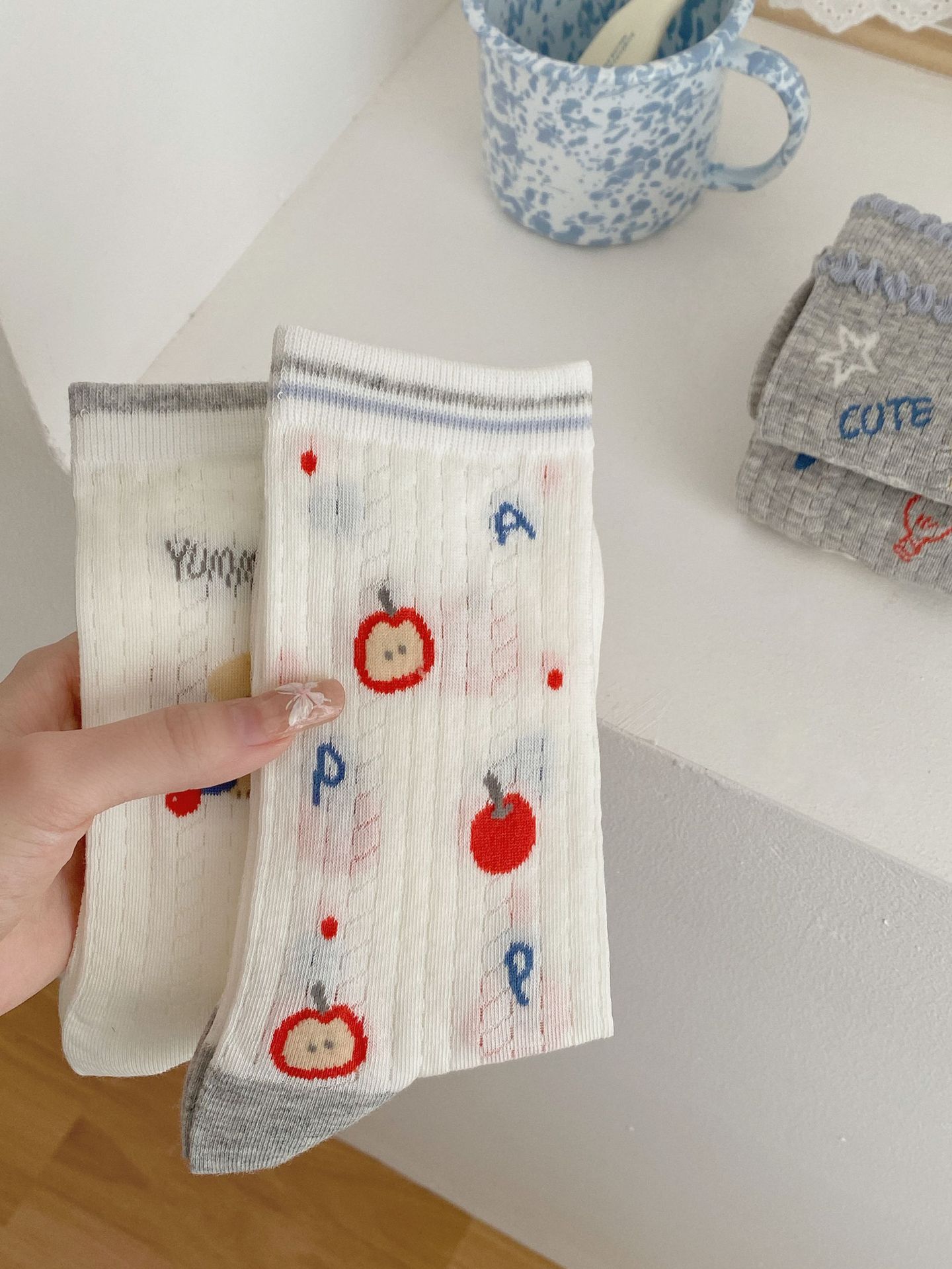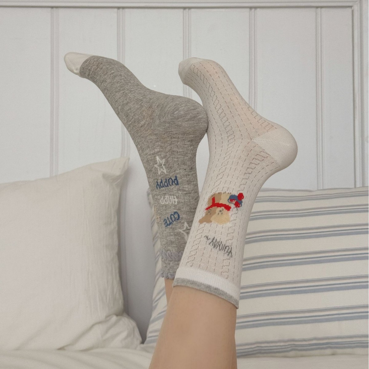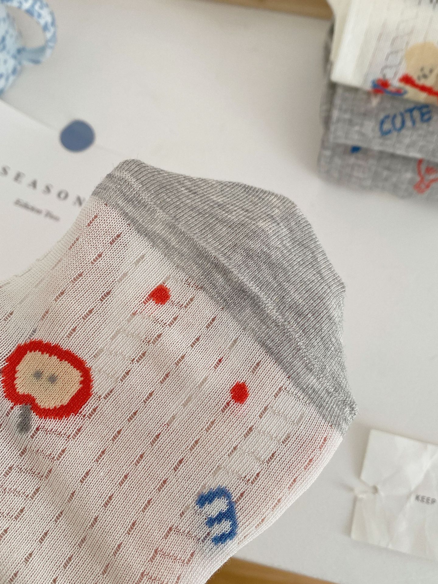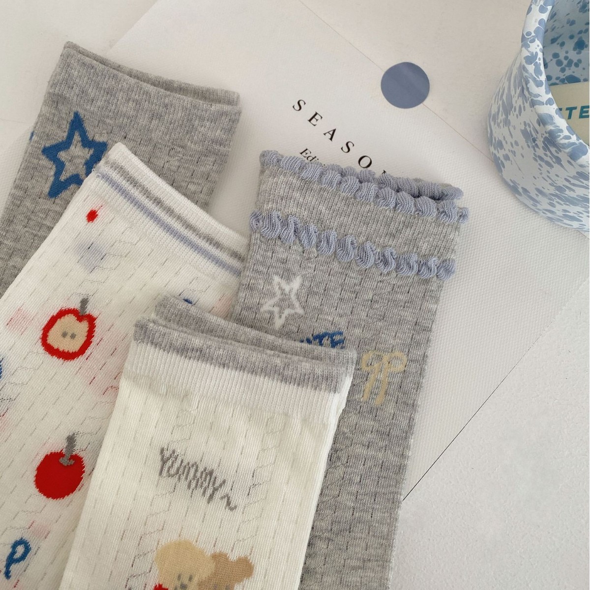 여성용 양말 여름 얇은 메쉬 통기성 귀여운 만화 소녀 스타일 종아리 양말 캐주얼 다용도 회색 및 흰색 양말