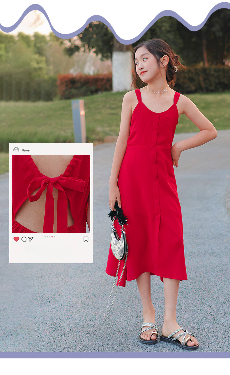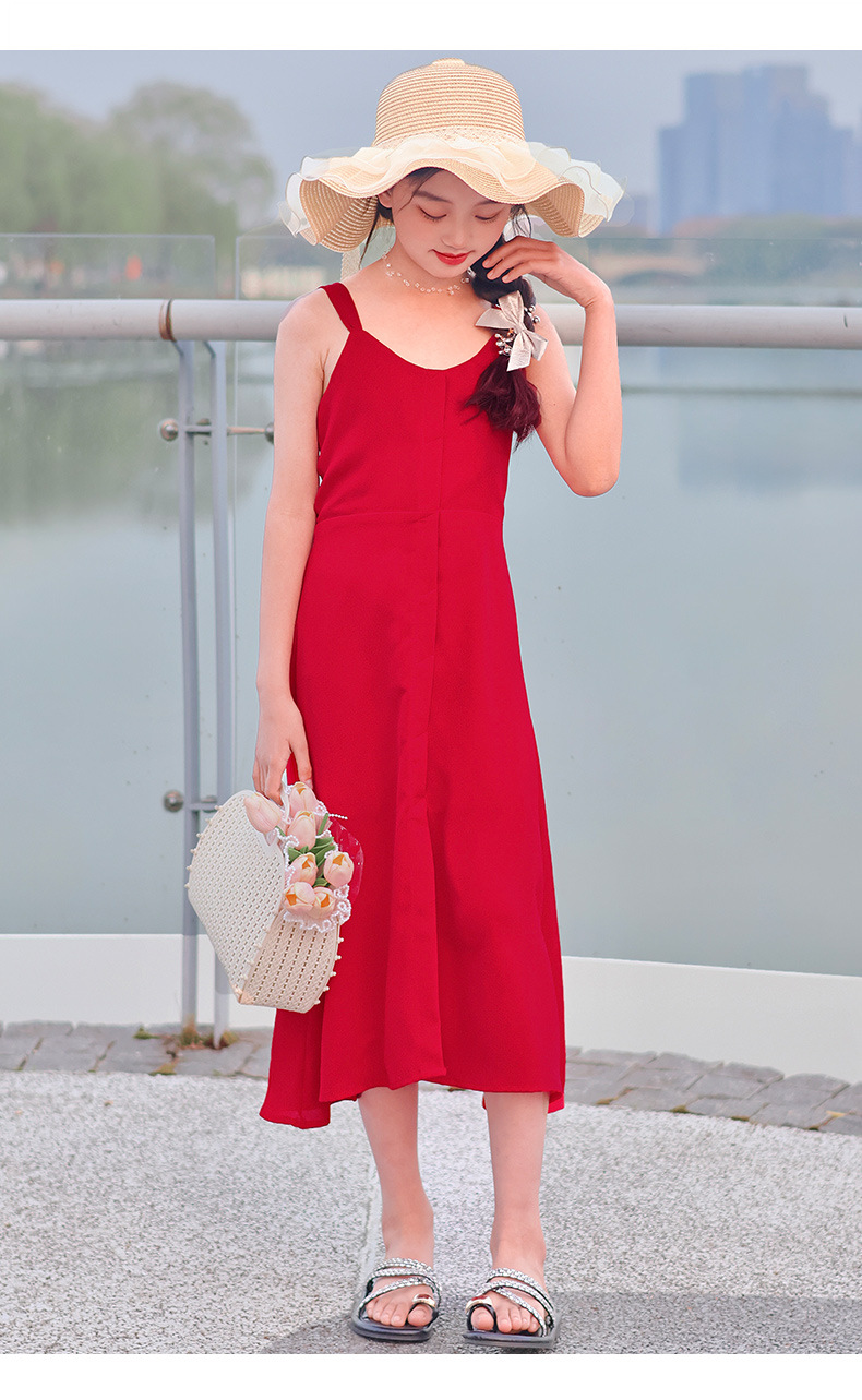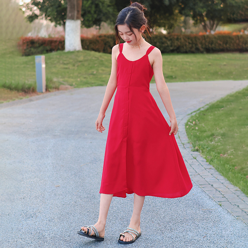 소녀 해변 휴일 해변 원피스 2025 년 여름 새 어린이 슬링 원피스 걸스 레드 롱 원피스
