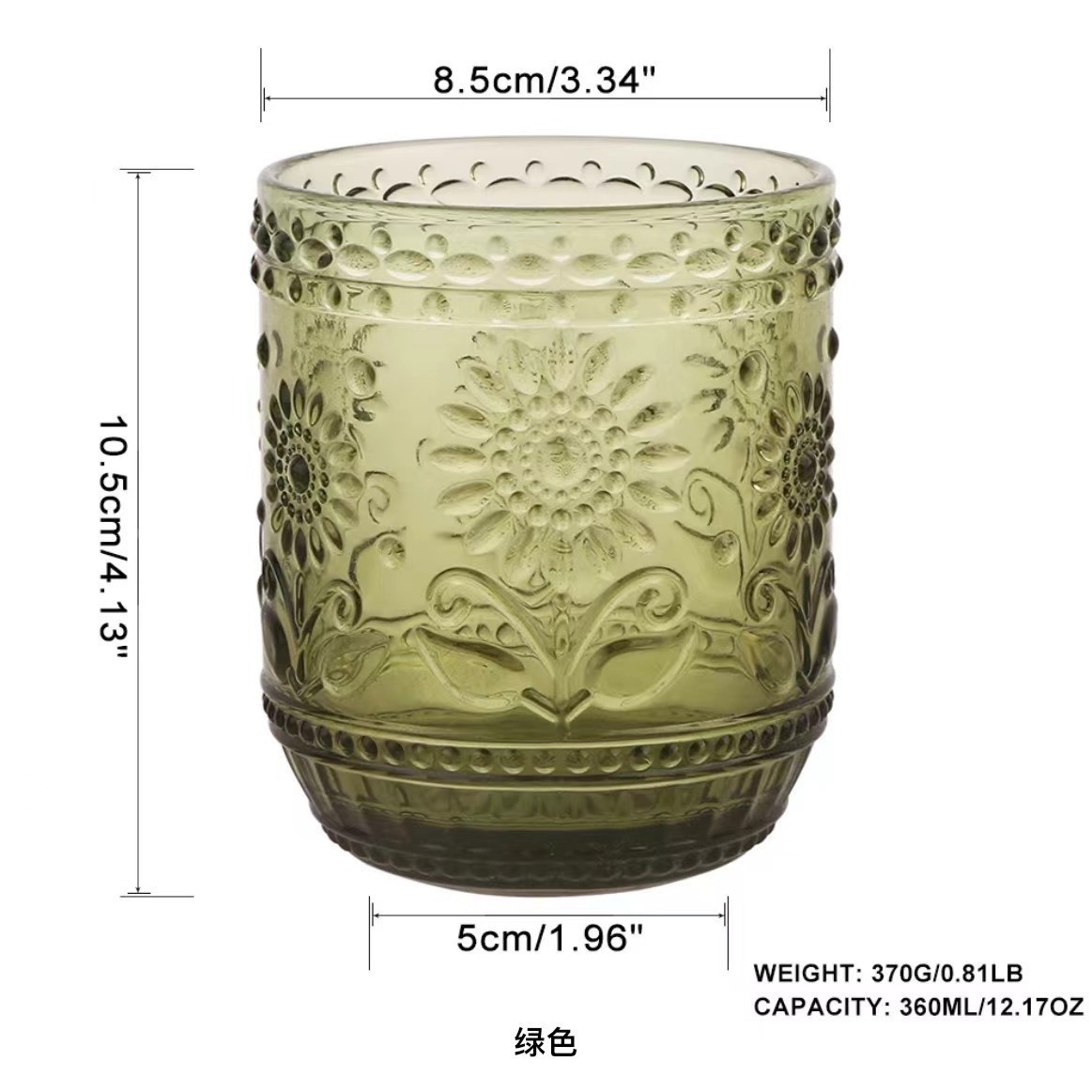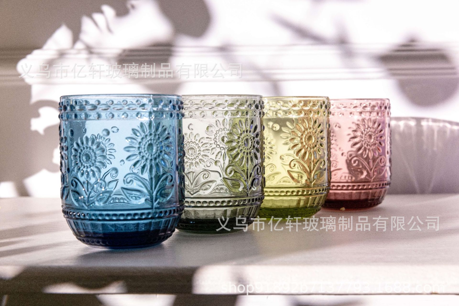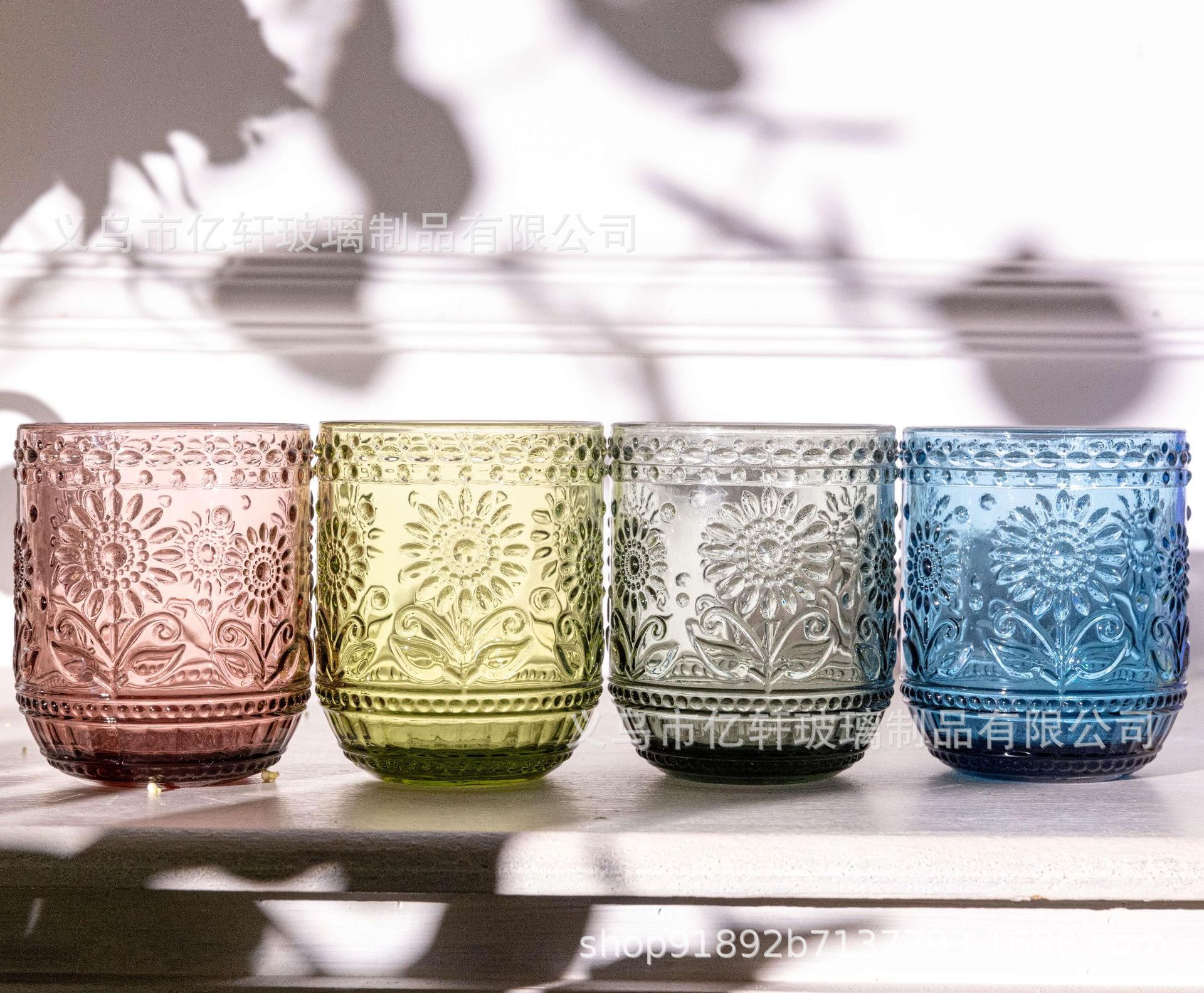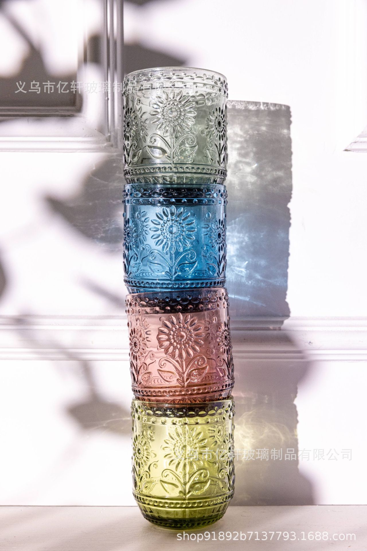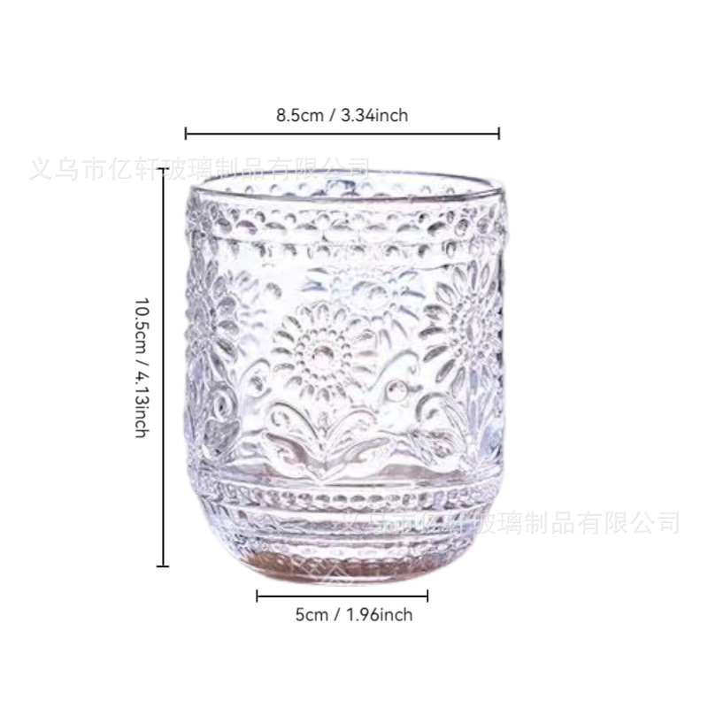 공장 도매 복고풍 양각 해바라기 컬러 유리 워터 컵 해바라기 가정용 우유 주스 컵 차가운 음료 컵