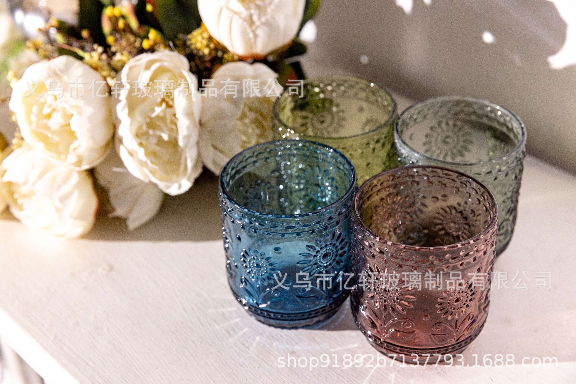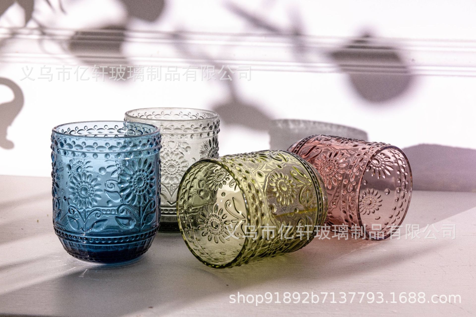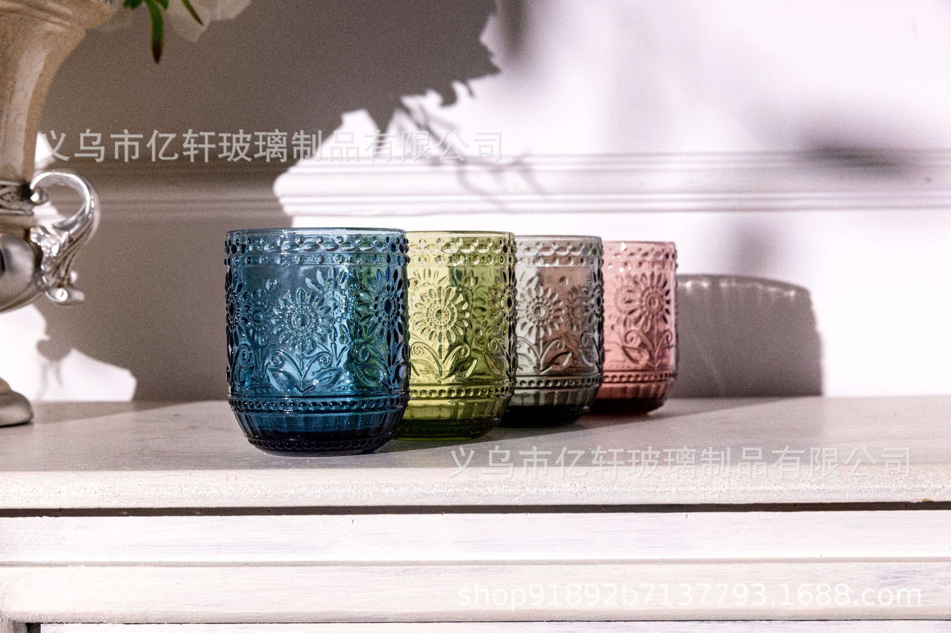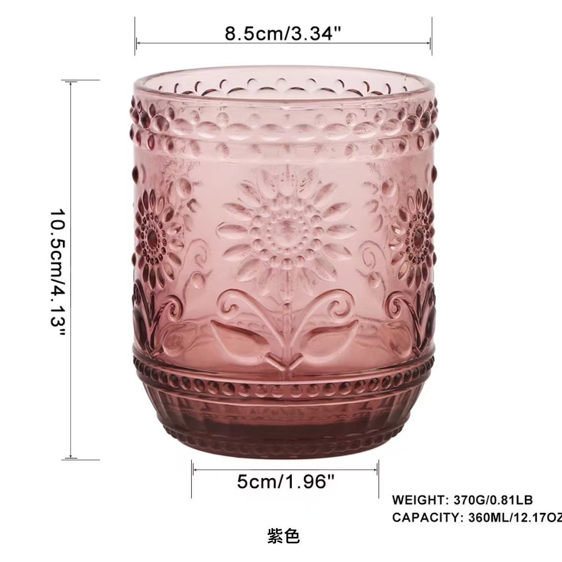 공장 도매 복고풍 양각 해바라기 컬러 유리 워터 컵 해바라기 가정용 우유 주스 컵 차가운 음료 컵