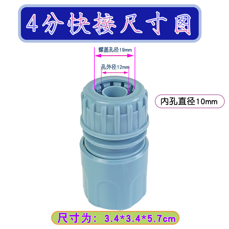 4分快接,重17.7克,尺寸为3.4*3.4*5.7cm,散装,每个麻袋有1000个,袋重约18kg,采用pp塑料材质,结实耐用,连接方便,不漏水,可用于连接4分水管(内直径12mm,外直径16mm)使用,也可以连接奶嘴接,欢迎大家的购买!支持定做颜色,款式等。