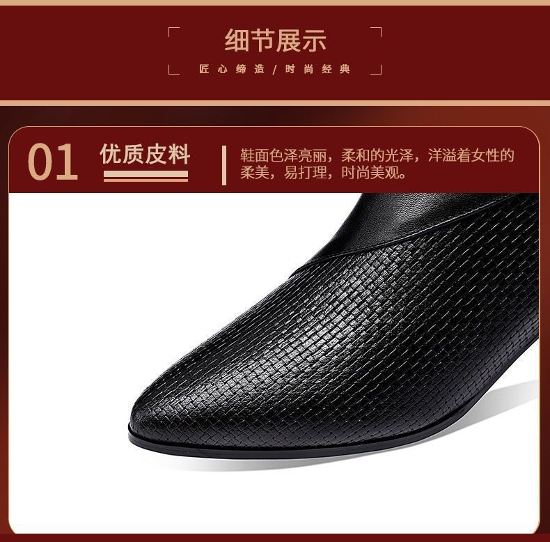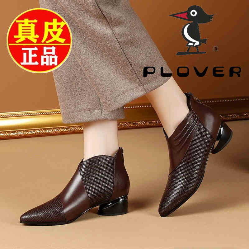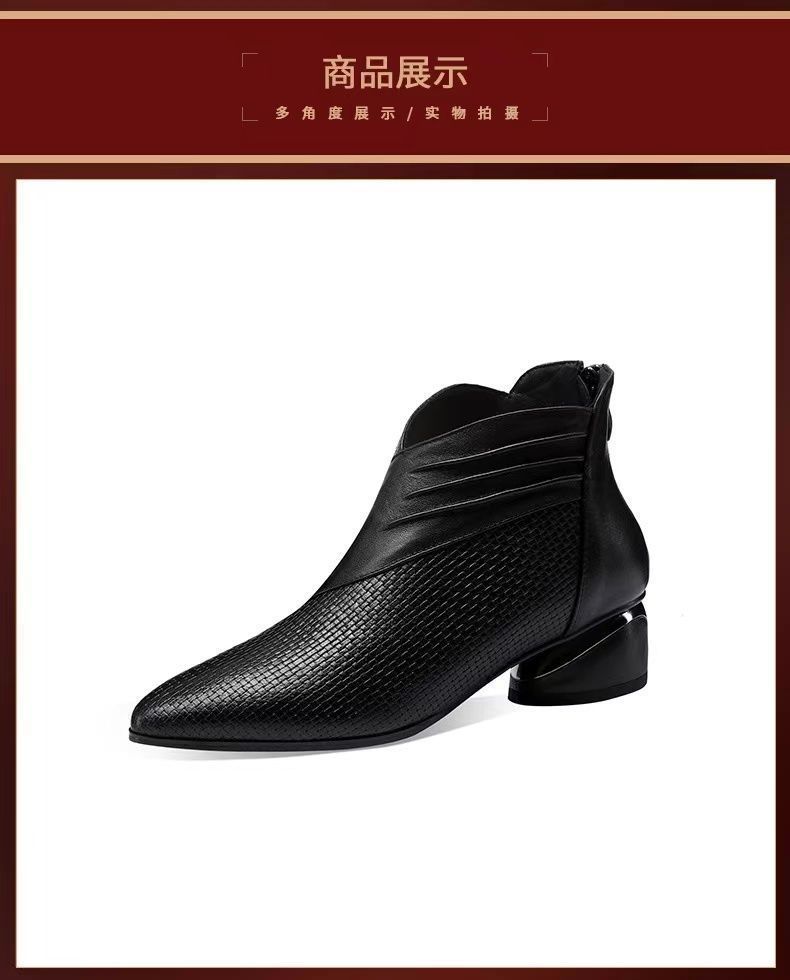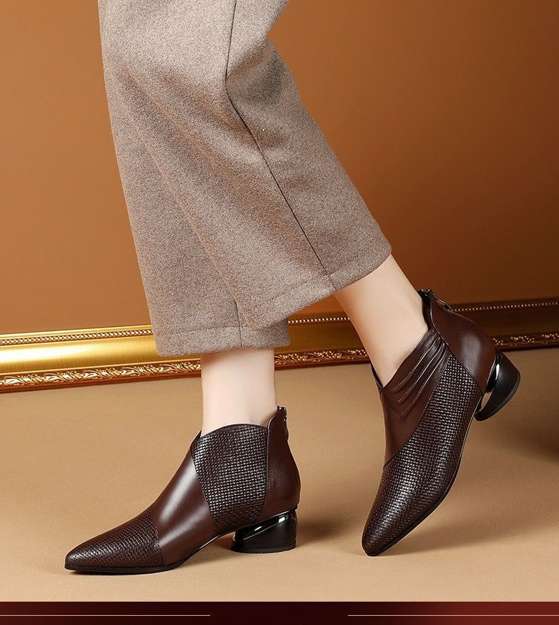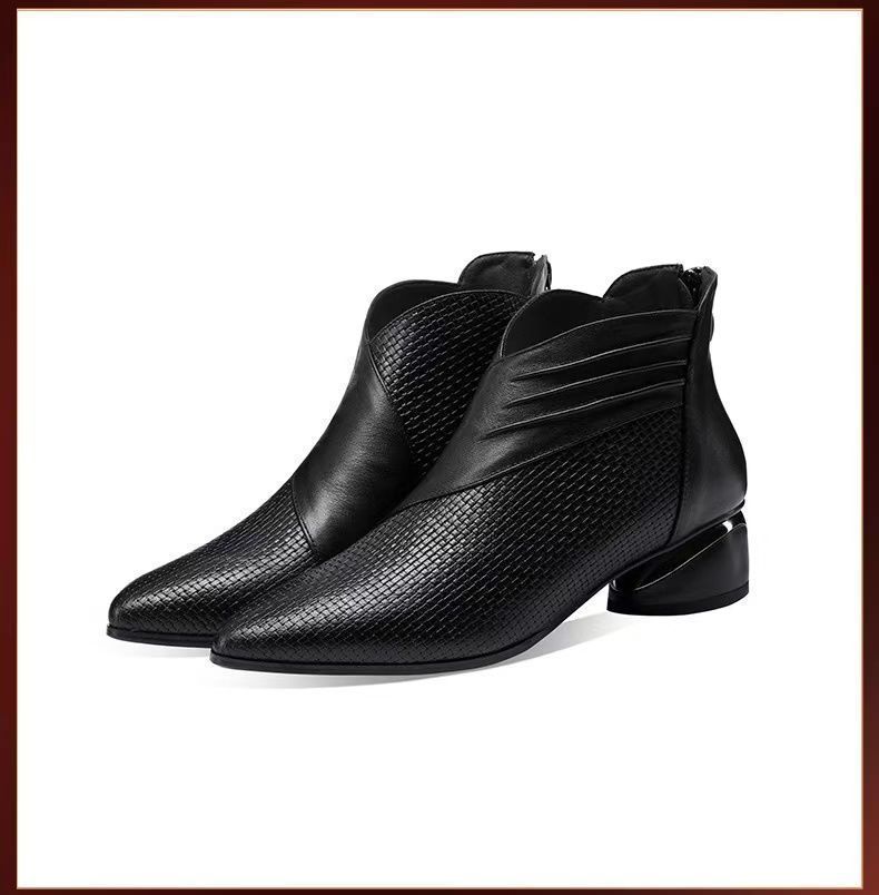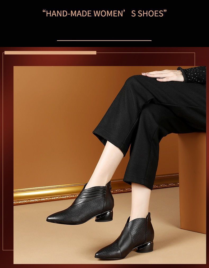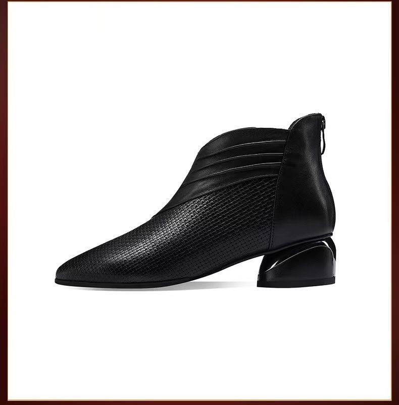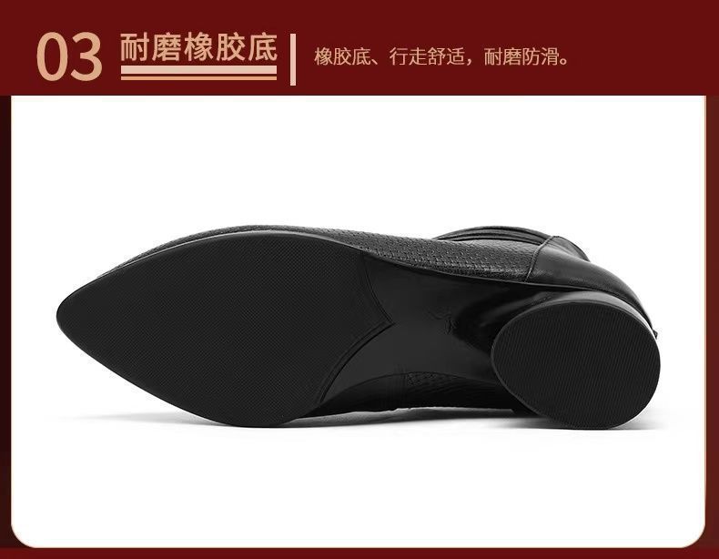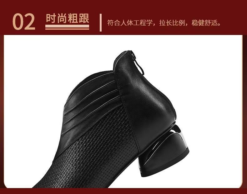 여성을 위한 진짜 부드러운 가죽 짧은 부츠, 세련된 두꺼운 굽, 2023 새로운 스타일의 뒷지퍼 포인티드 가죽 부츠, 벨벳 기질, 엄마 하이힐스토어 가기