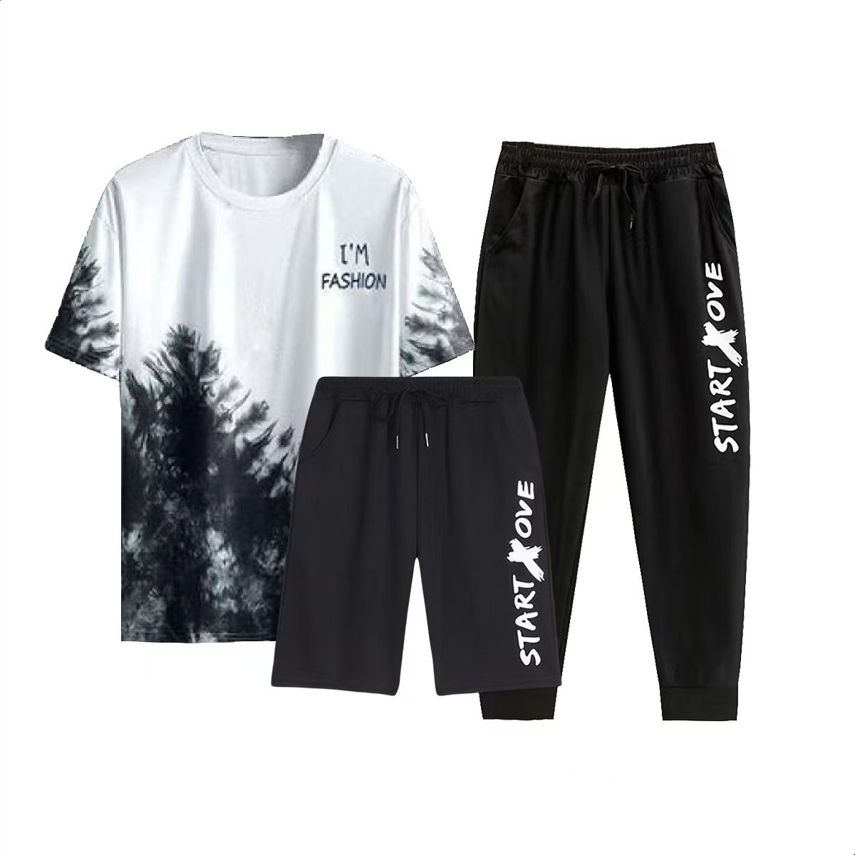 남성용 티셔츠 정장 2025 새로운 얼음 실크 여름 캐주얼 다목적 그라데이션 3 피스 세트와 잘 생긴 남성복