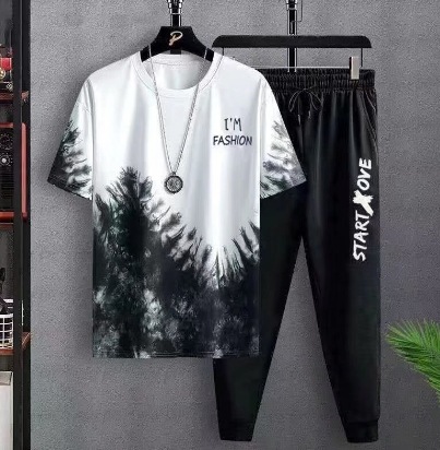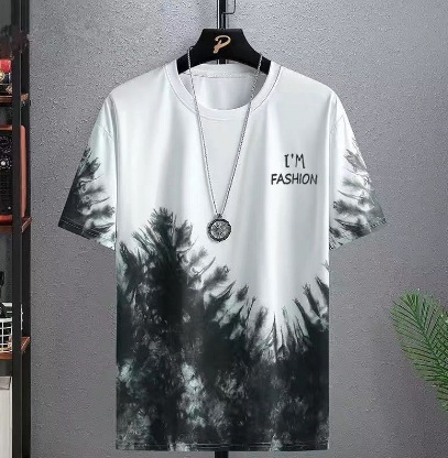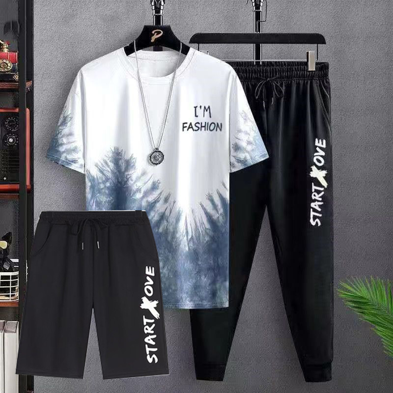 남성용 티셔츠 정장 2025 새로운 얼음 실크 여름 캐주얼 다목적 그라데이션 3 피스 세트와 잘 생긴 남성복스토어 가기