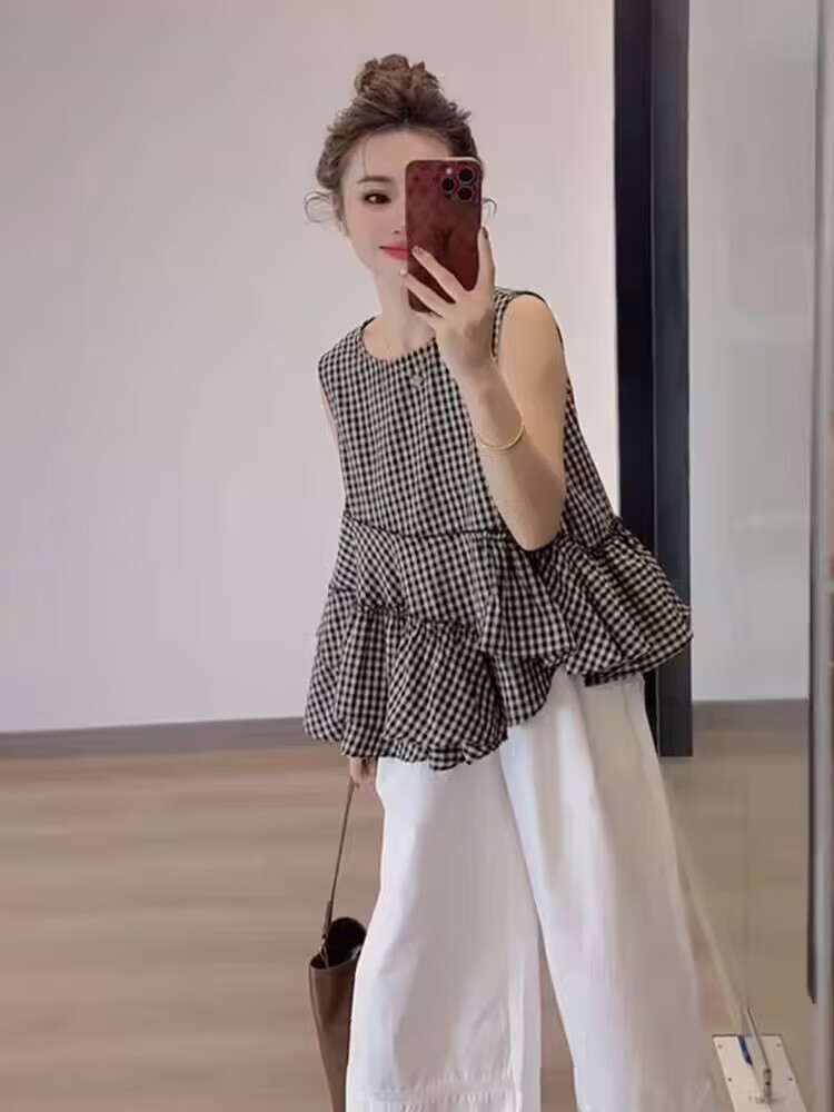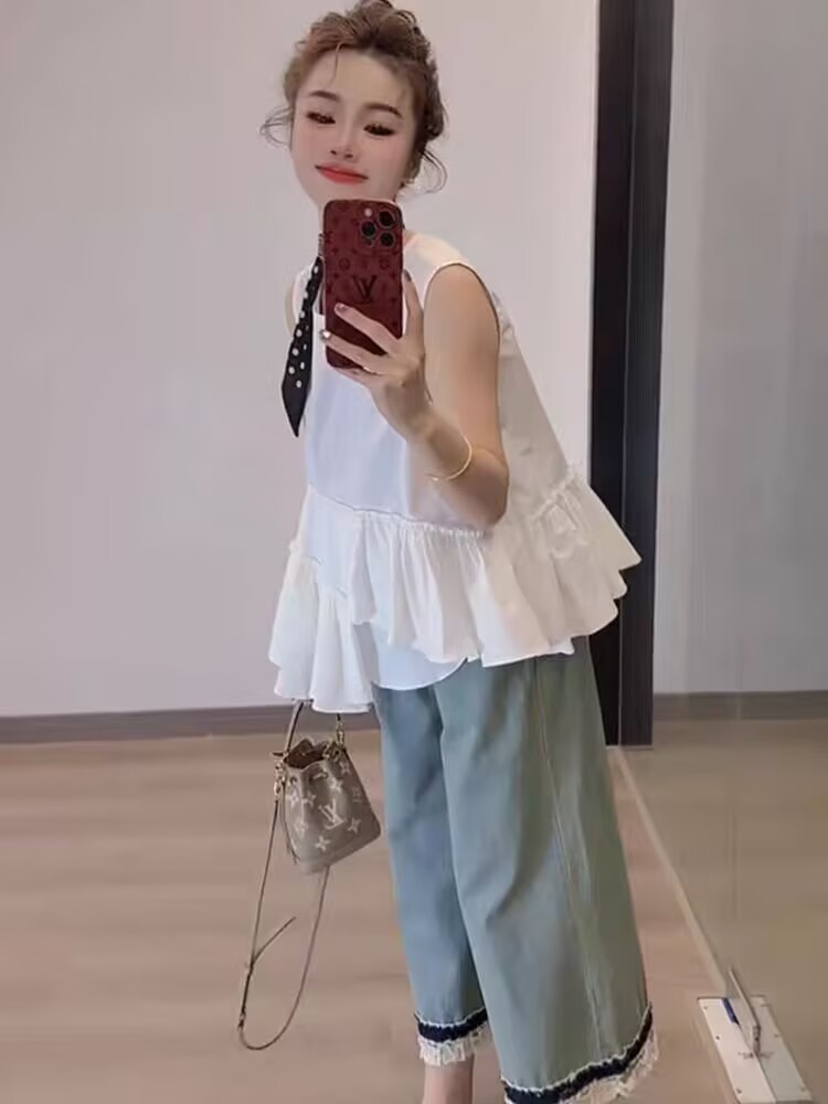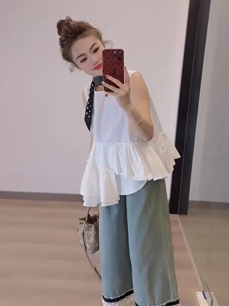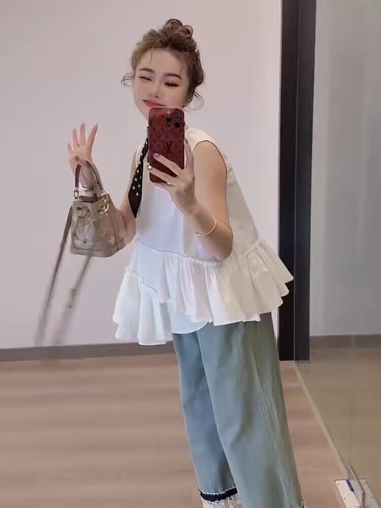공장 직접 민소매 조끼 주름 장식 경사진 셔츠 여성 여름 한국 부드러운 스타일 인형 셔츠 탑 조수