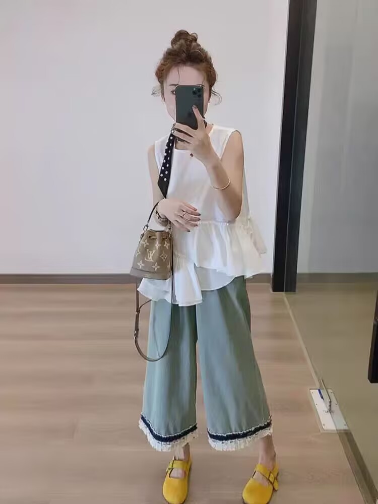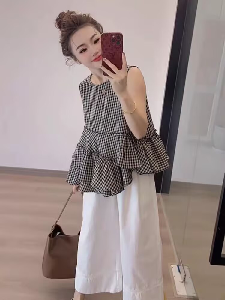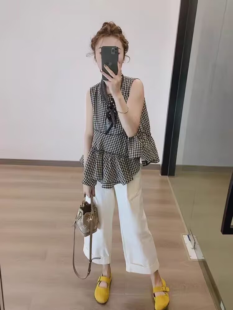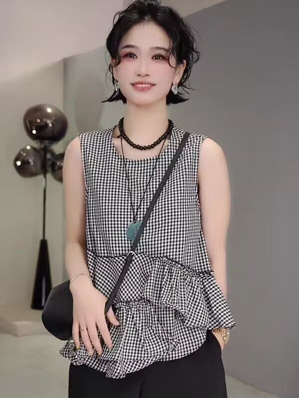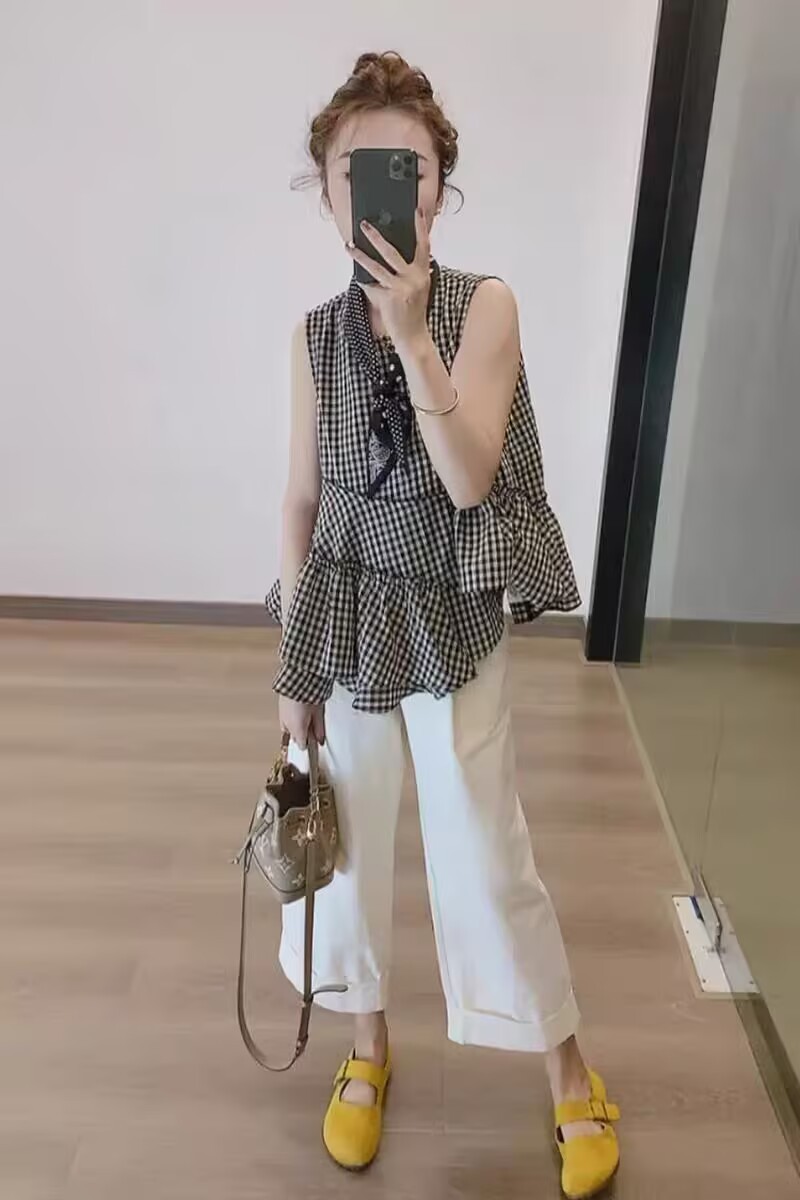 공장 직접 민소매 조끼 주름 장식 경사진 셔츠 여성 여름 한국 부드러운 스타일 인형 셔츠 탑 조수