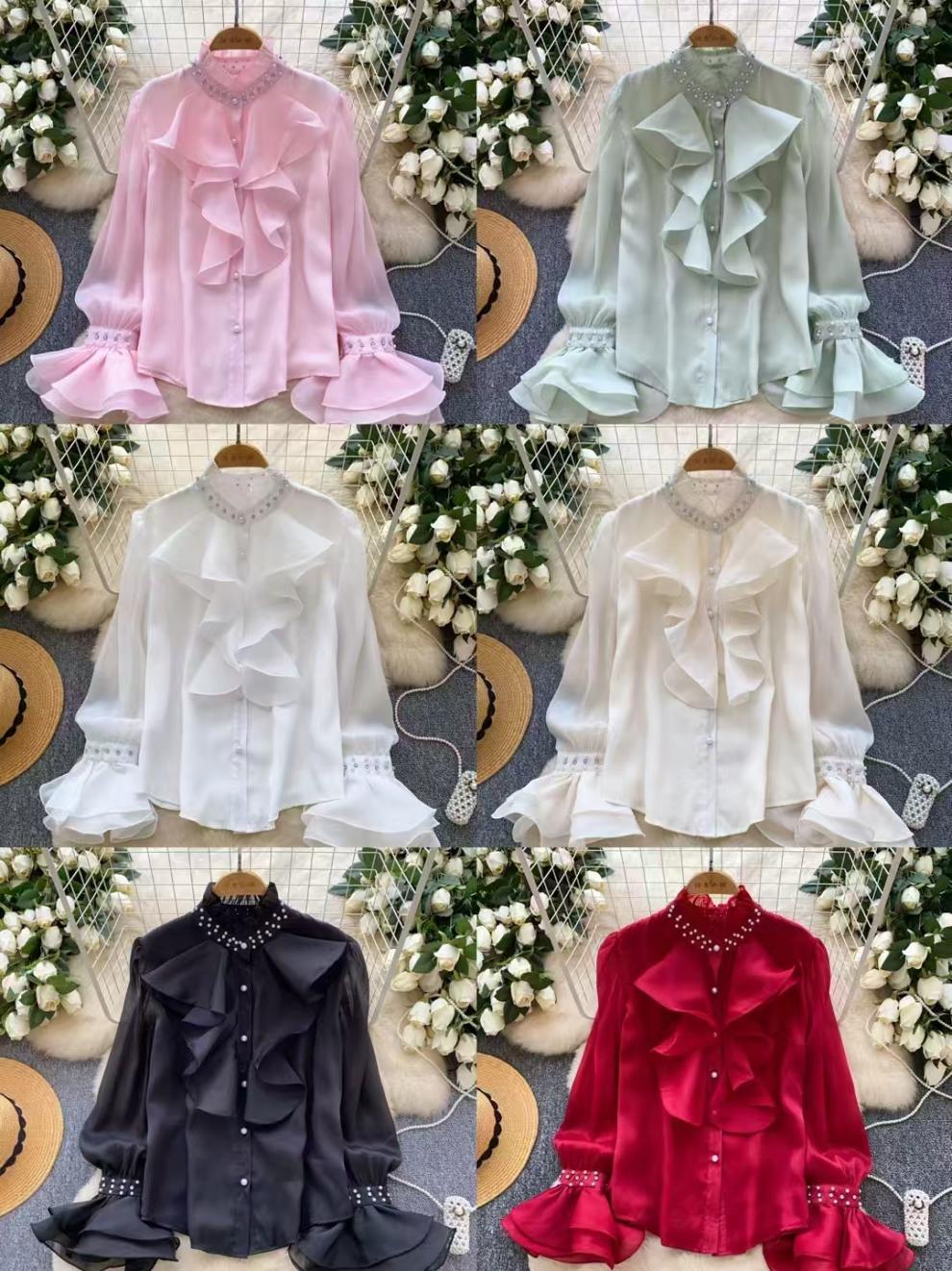 다이아몬드로 장식 된 프릴 칼라 긴팔 셔츠 여성의 가을 허리 길이 우아한 쉬폰 셔츠 디자인 아름답고 황금색 탑스토어 가기