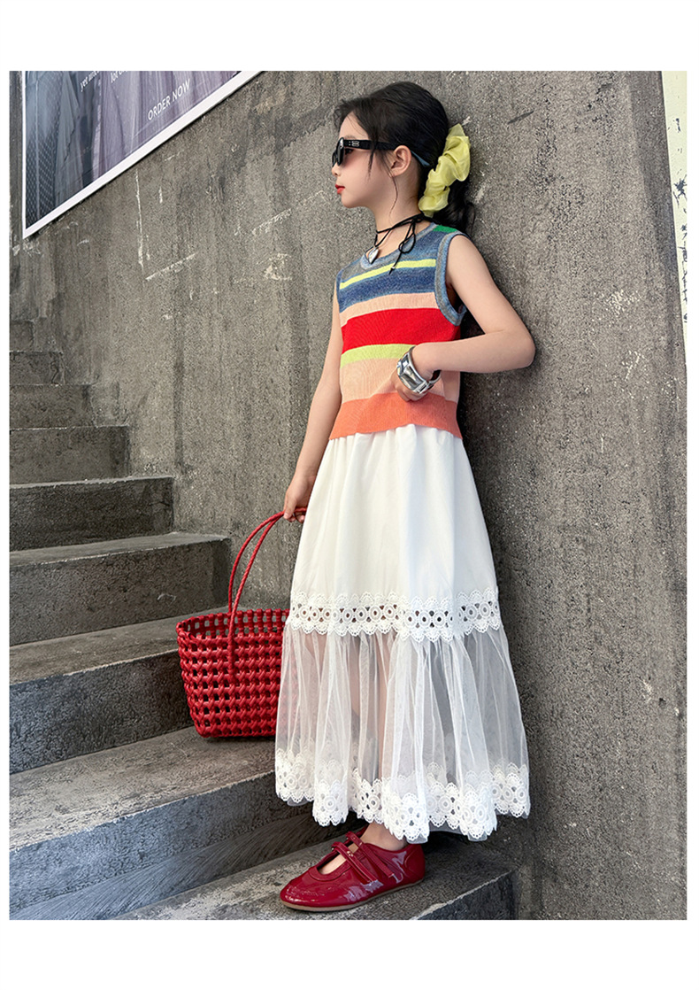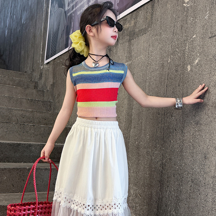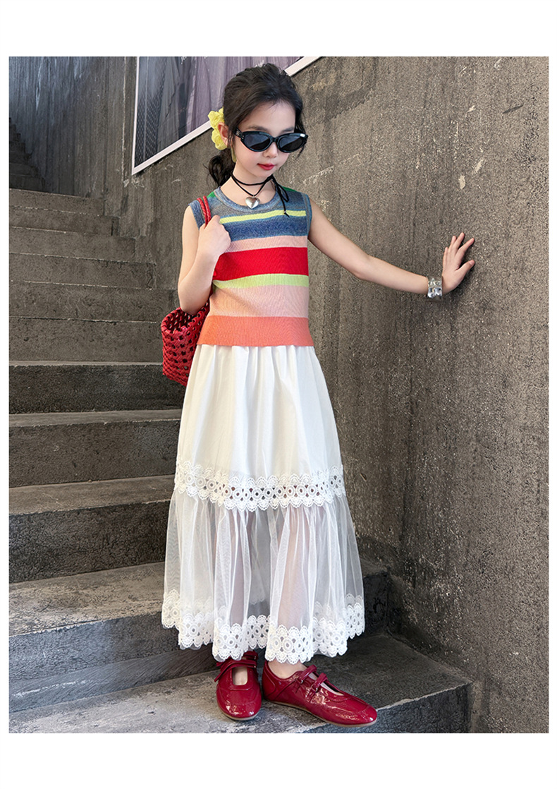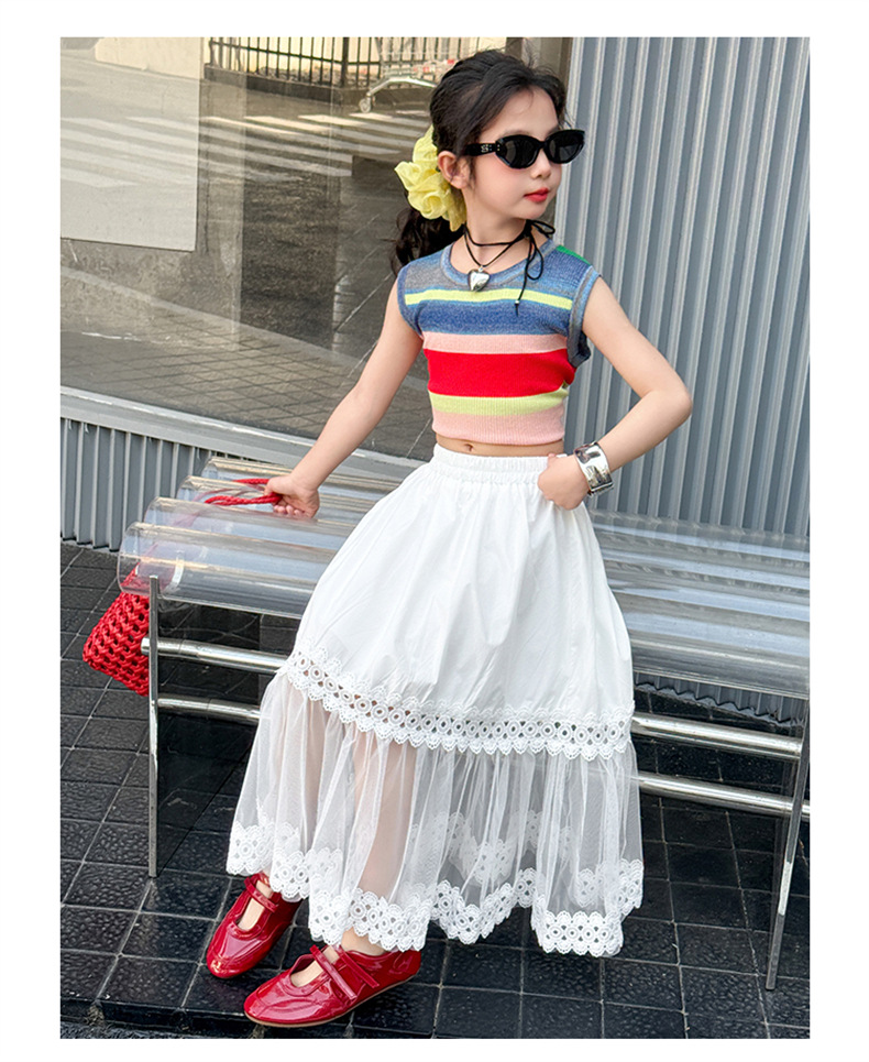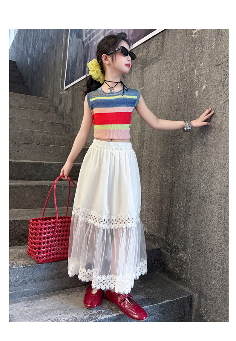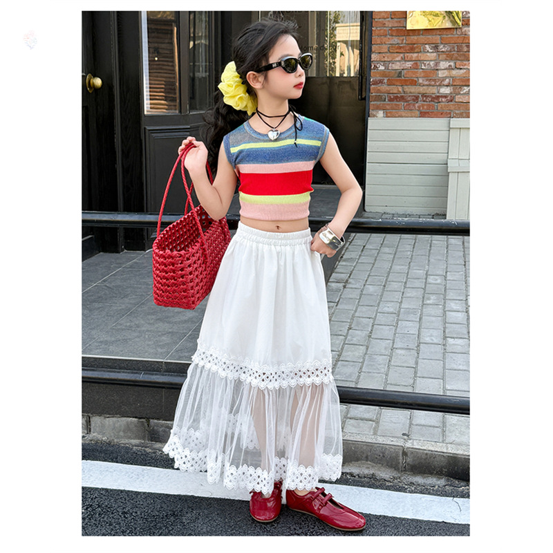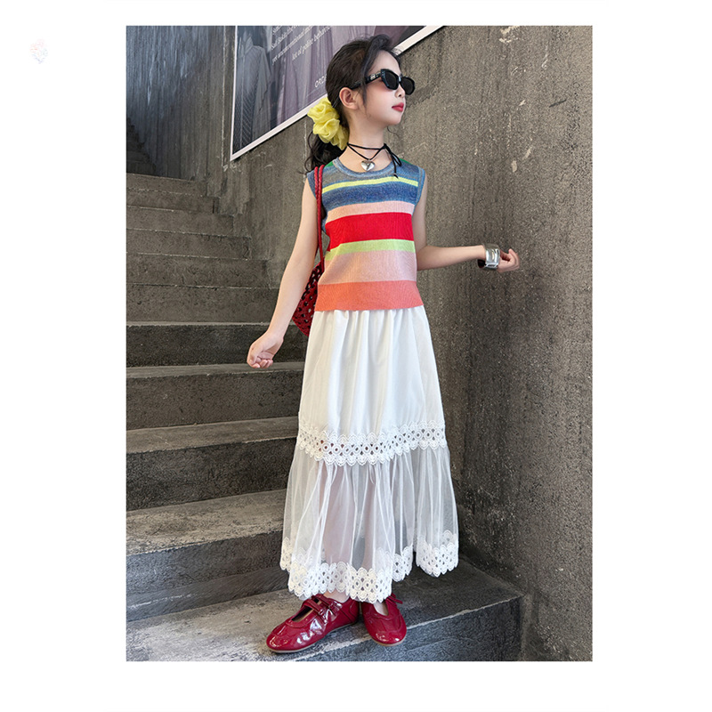 여자 한국식 도파민 아이스 실크 조끼 중공 거즈 스커트 세트 큰 아이들 2025 여름 새로운 민소매 T