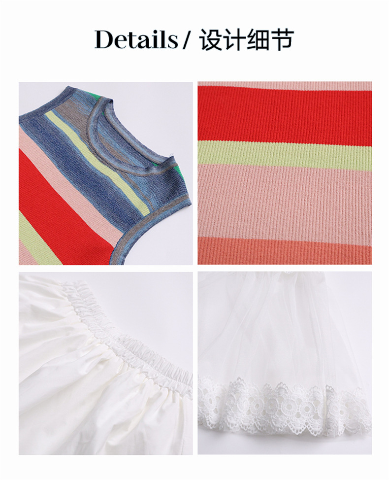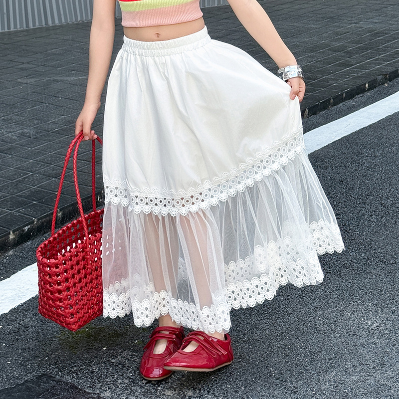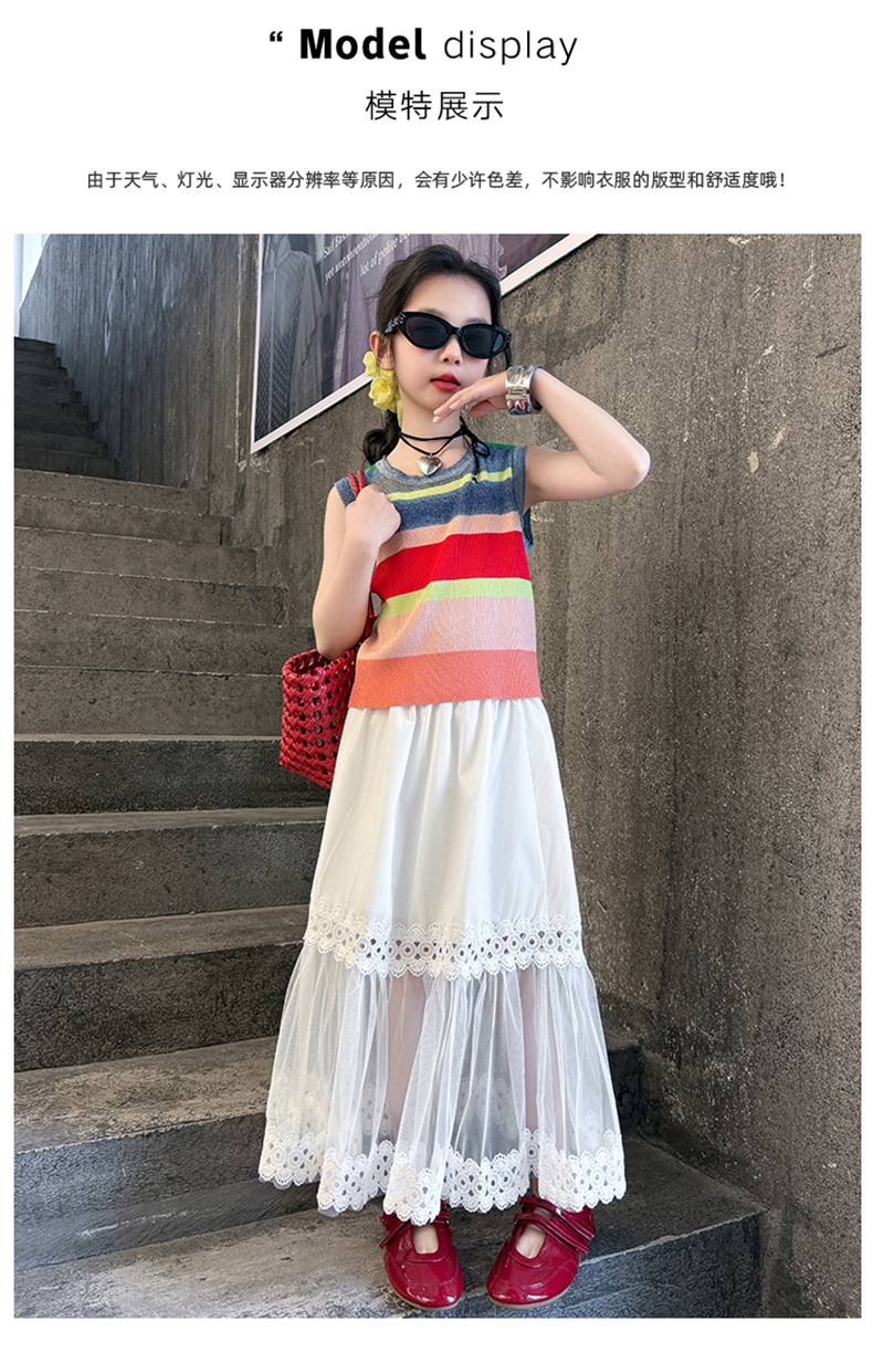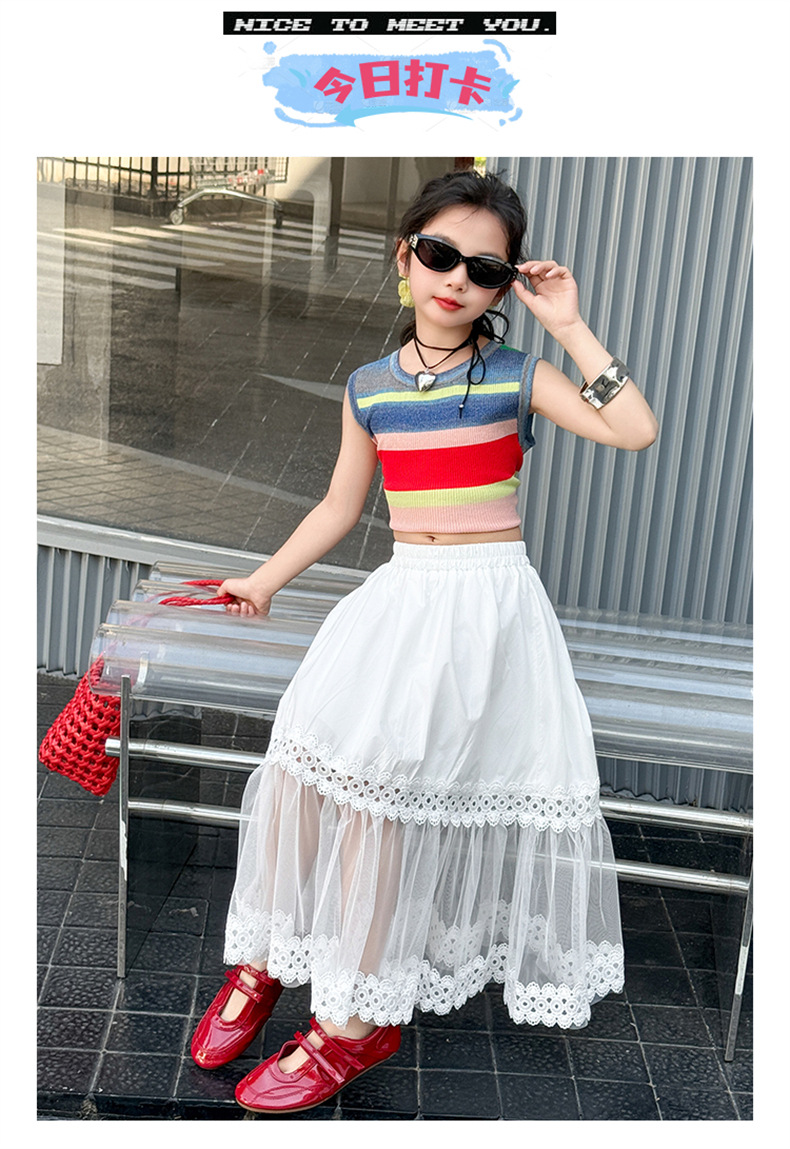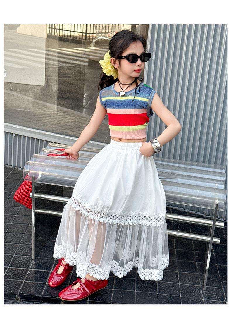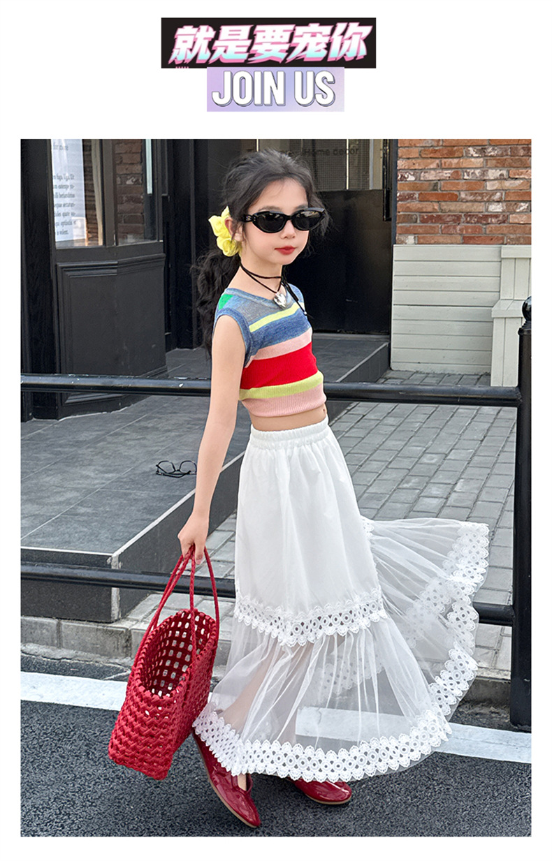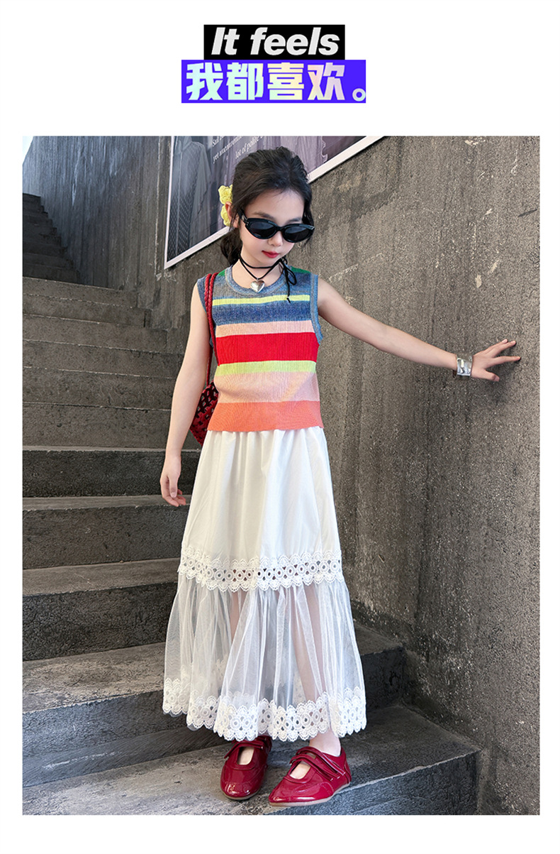 여자 한국식 도파민 아이스 실크 조끼 중공 거즈 스커트 세트 큰 아이들 2025 여름 새로운 민소매 T
