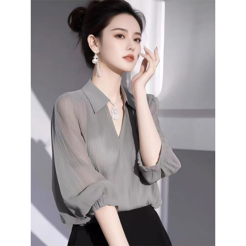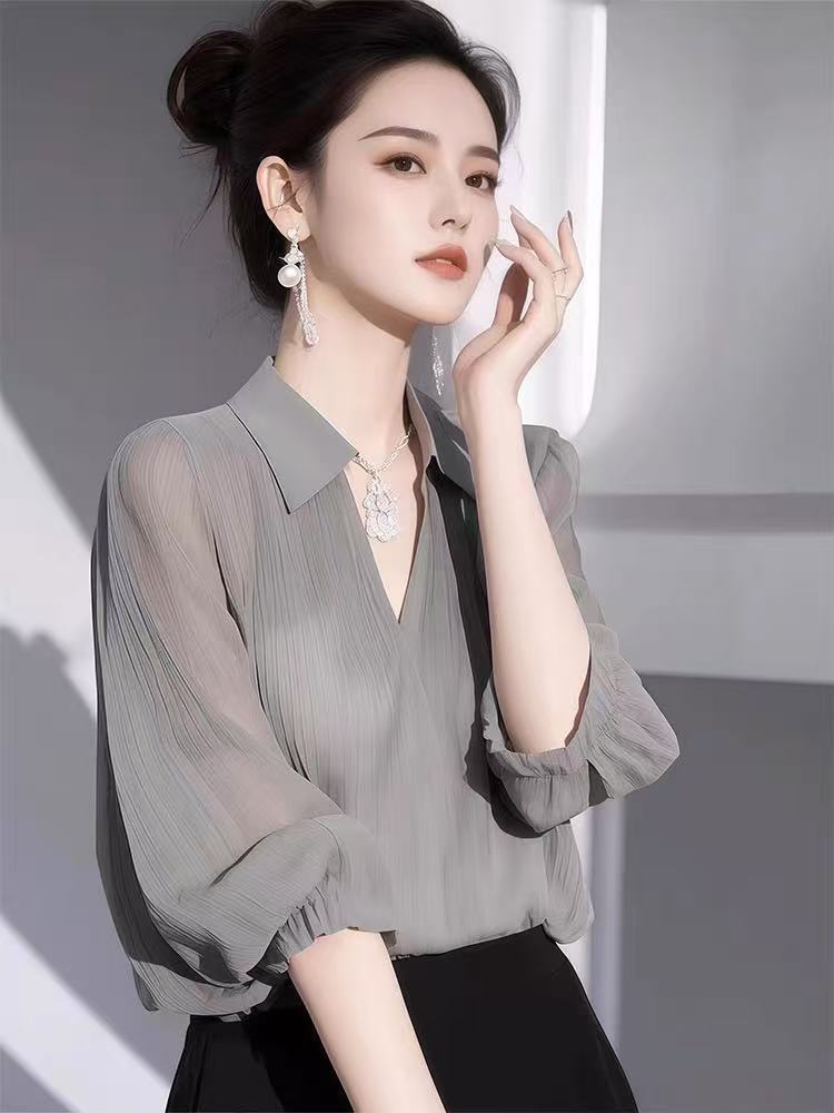연기 회색 시폰 셔츠 여성의 2025 여름 새로운 반팔 셔츠 빛 럭셔리 하이 엔드 독특한 아름다운 우아한 탑스토어 가기