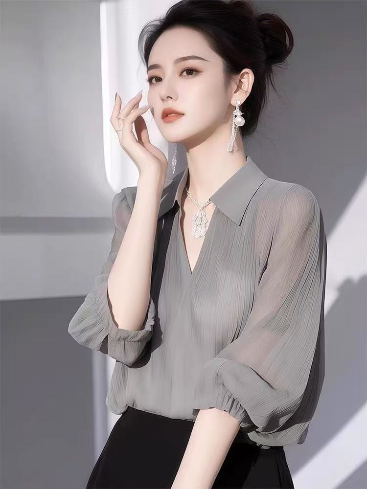 연기 회색 시폰 셔츠 여성의 2025 여름 새로운 반팔 셔츠 빛 럭셔리 하이 엔드 독특한 아름다운 우아한 탑