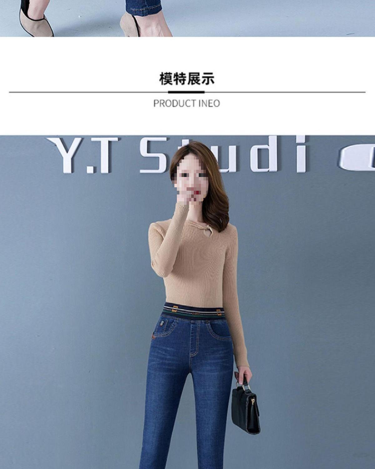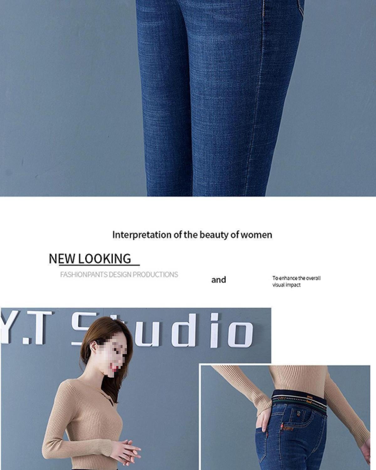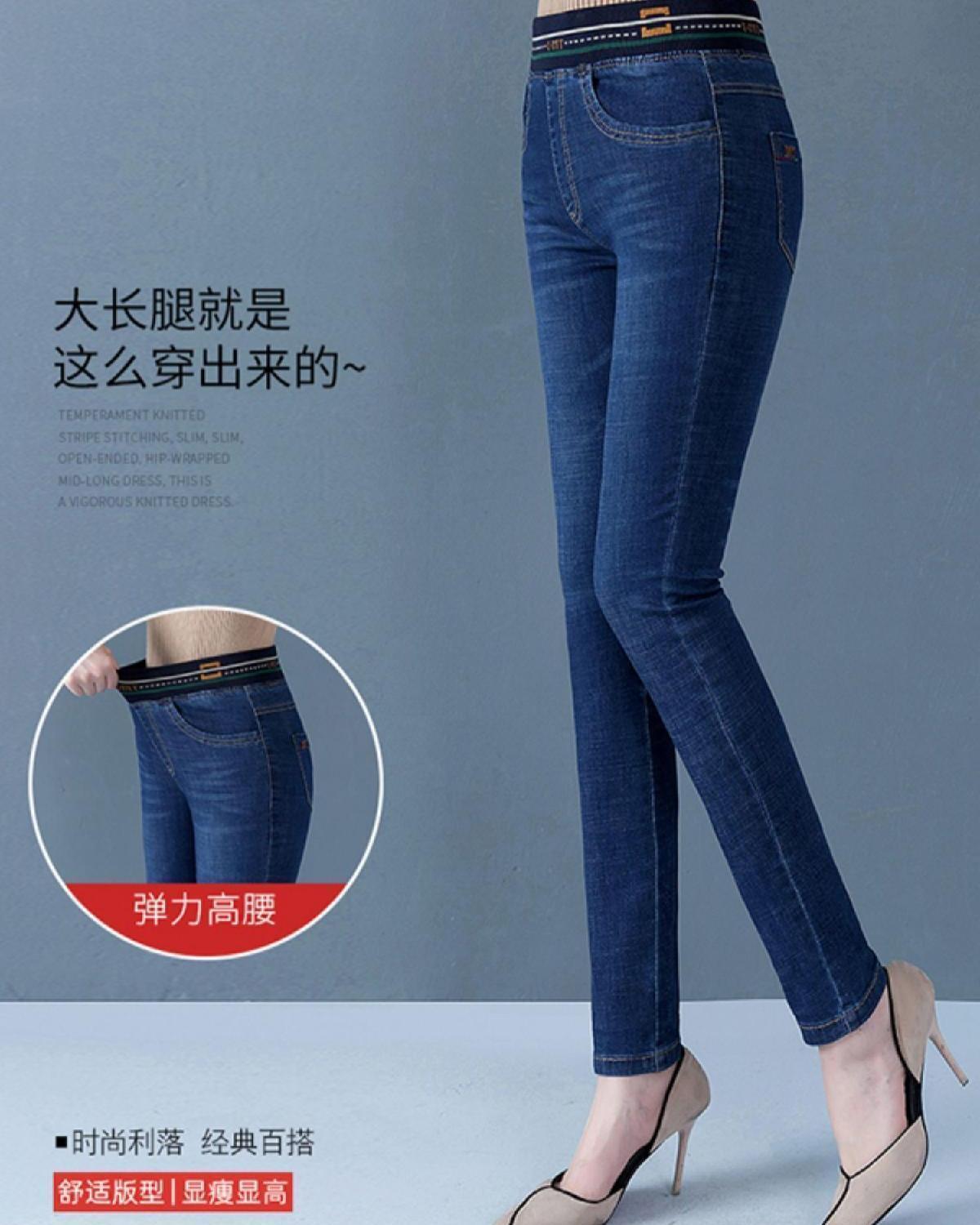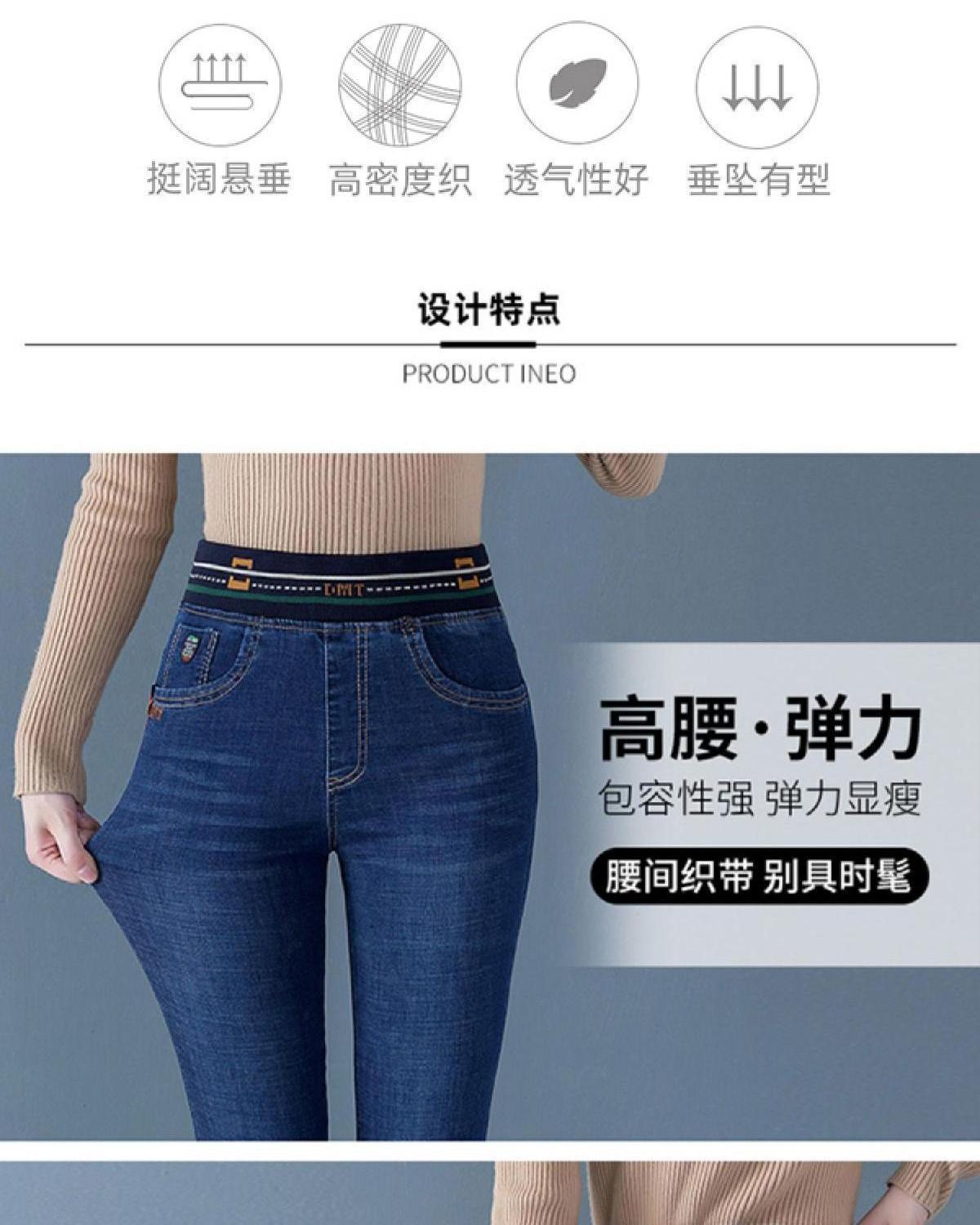 여성용 신축성 있는 허리 청바지 봄 신상 하이웨이스트 중년 엄마 바지 슬림 바지 작은 발 펜슬 팬츠 봄, 가을