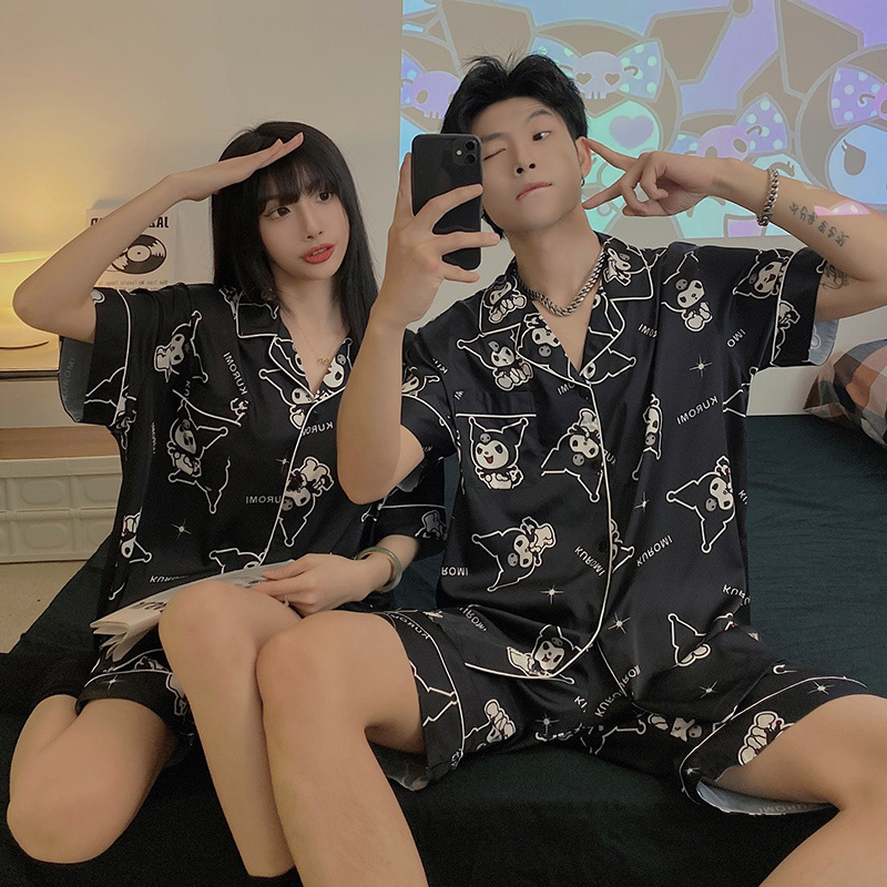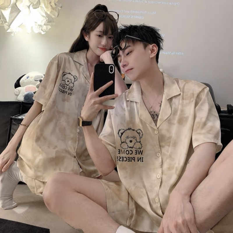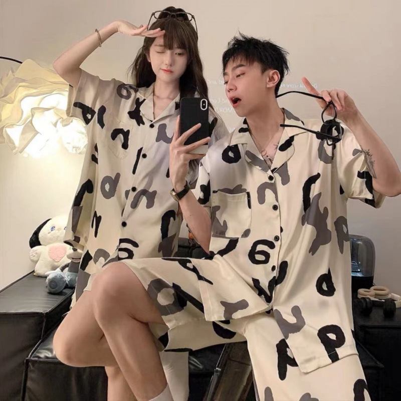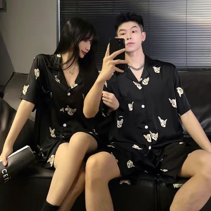 커플 잠옷 여성 봄, 여름 얇은 얼음 실크 하이 엔드 반팔 반바지 인터넷 연예인 스타일 남성 홈웨어 정장 여름스토어 가기