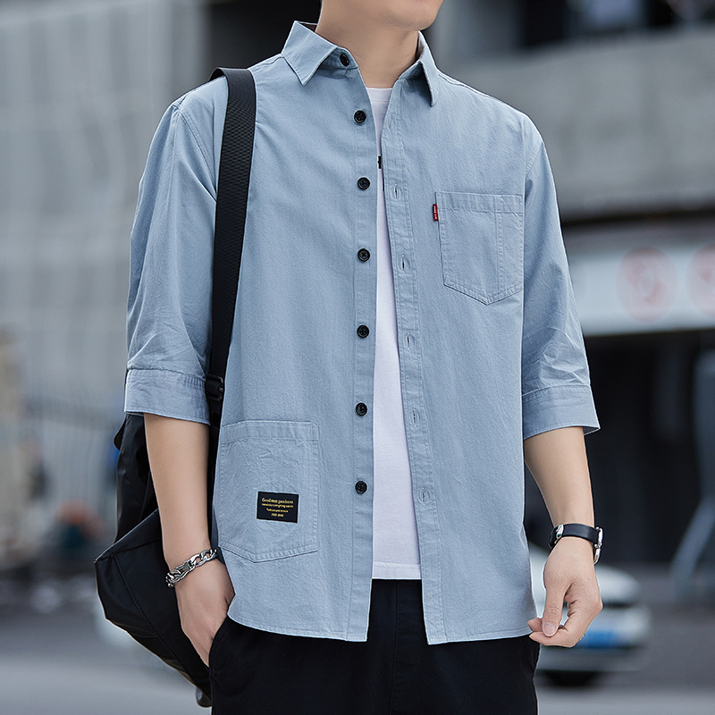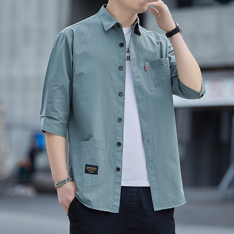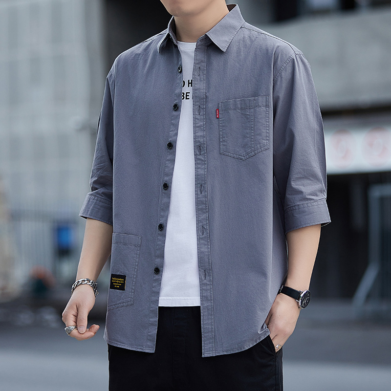 남성용 드롭 배송 코튼 셔츠 7부 소매 반소매 코튼 작업복 솔리드 컬러 루즈하고 핸섬한 미드 슬리브 셔츠스토어 가기