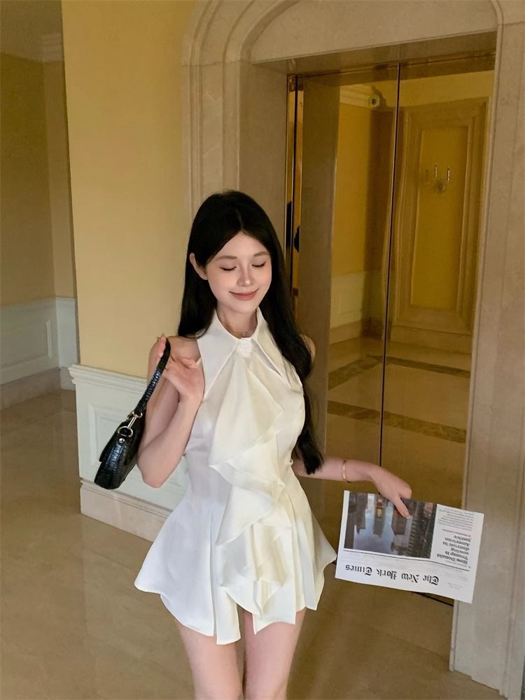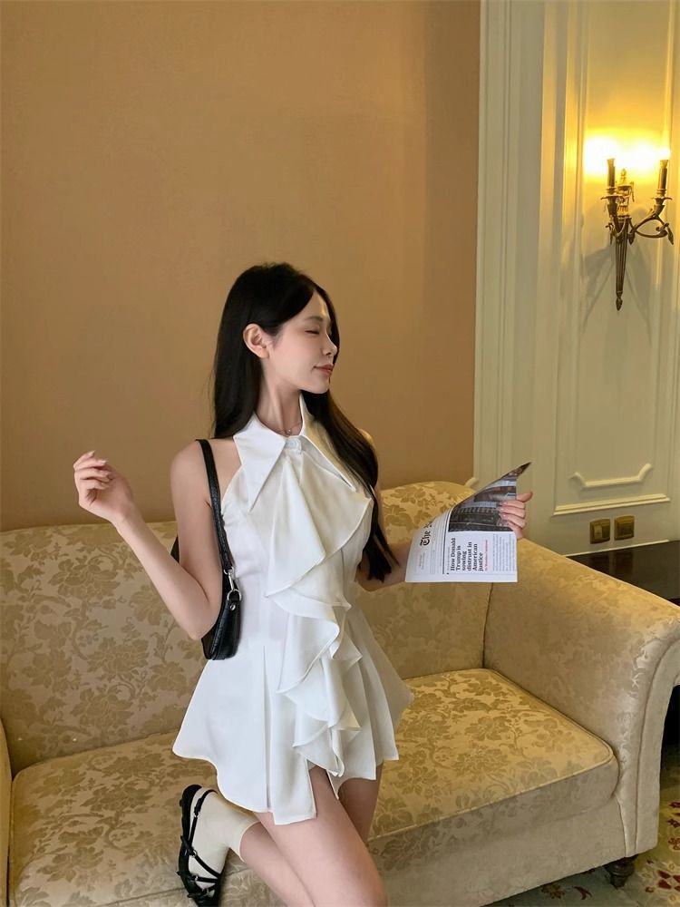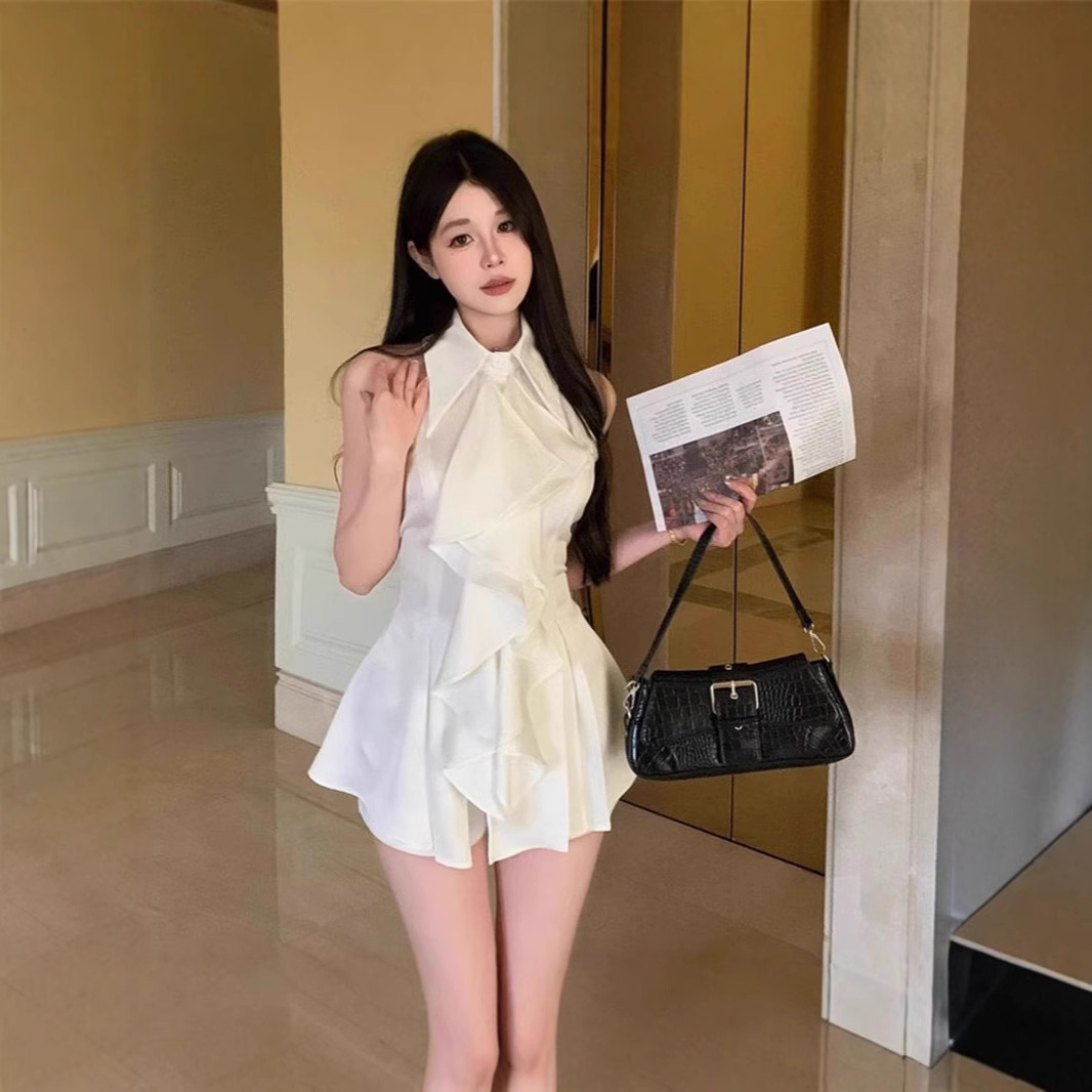 프랑스 틈새 목 달콤한 매운 어깨 요정 최고 여성 여름 디자인 슬리밍 러플 민소매 셔츠스토어 가기