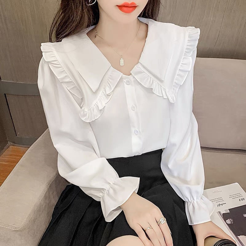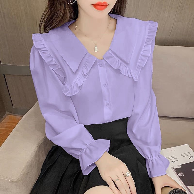 솔리드 컬러 셔츠 여성의 봄 원피스 2025 새로운 스타일 디자인 센스 틈새 달콤한 귀 인형 칼라 쉬폰 탑 트렌디스토어 가기