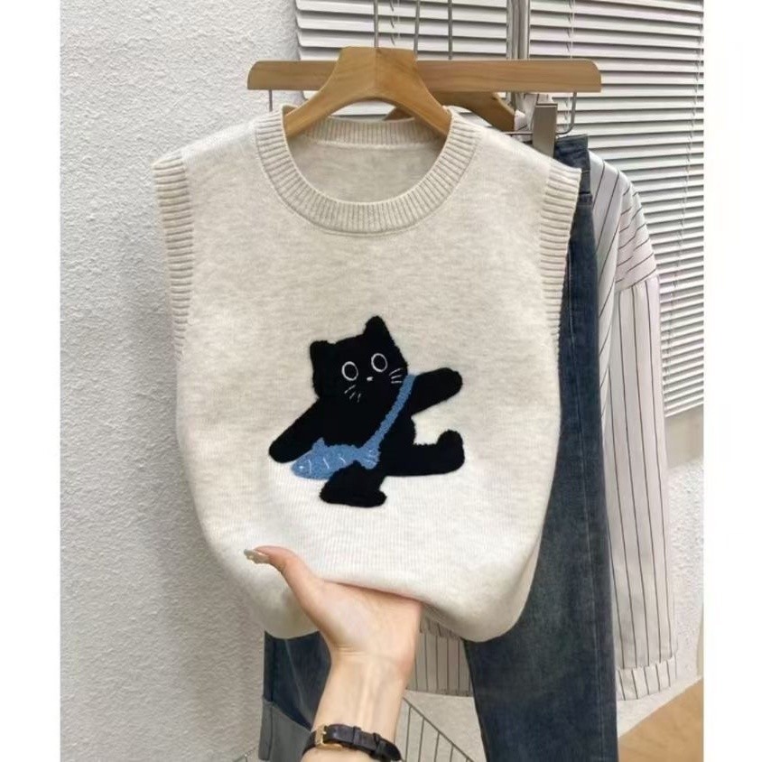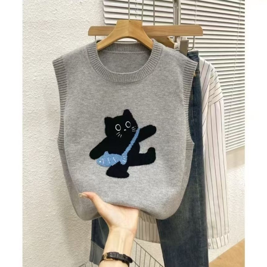 여성을 위한 귀여운 연령 감소 가을 니트 스웨터 조끼, 고양이를 자수한 클래식, 패셔너블하고 다재다능한 가을용 이너 조끼스토어 가기