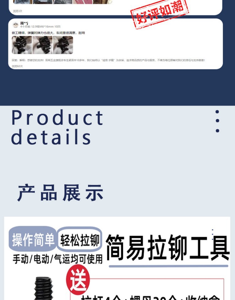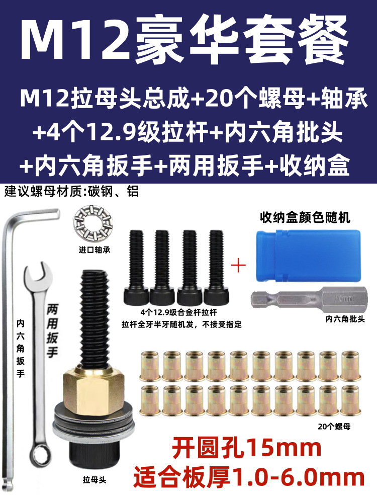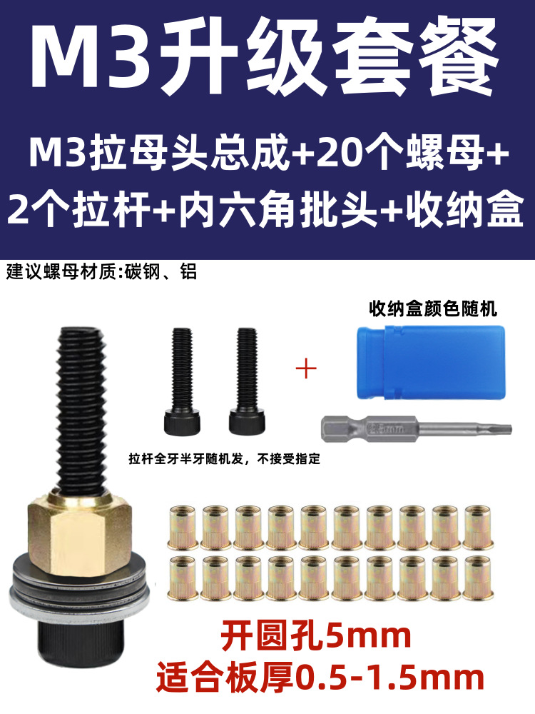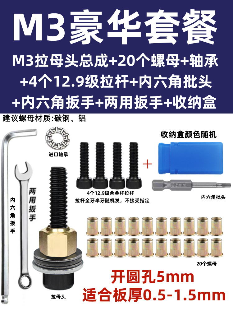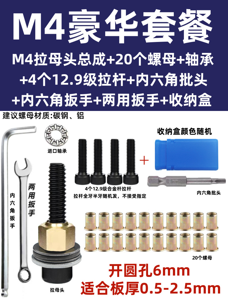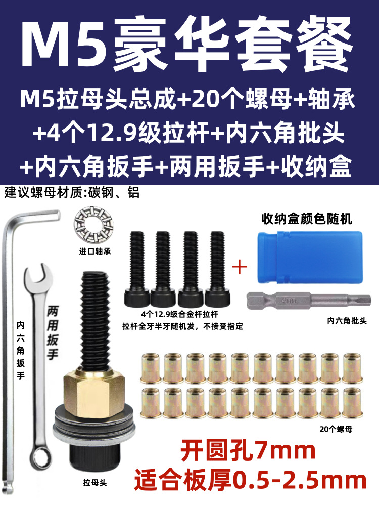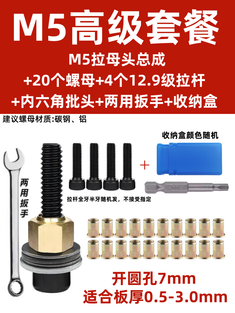 • M5 암 풀 헤드에는 전기 드릴 비트 + 타이 로드 2개 + 리벳 너트 20개가 함께 제공됩니다.