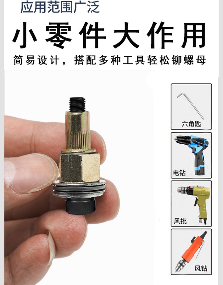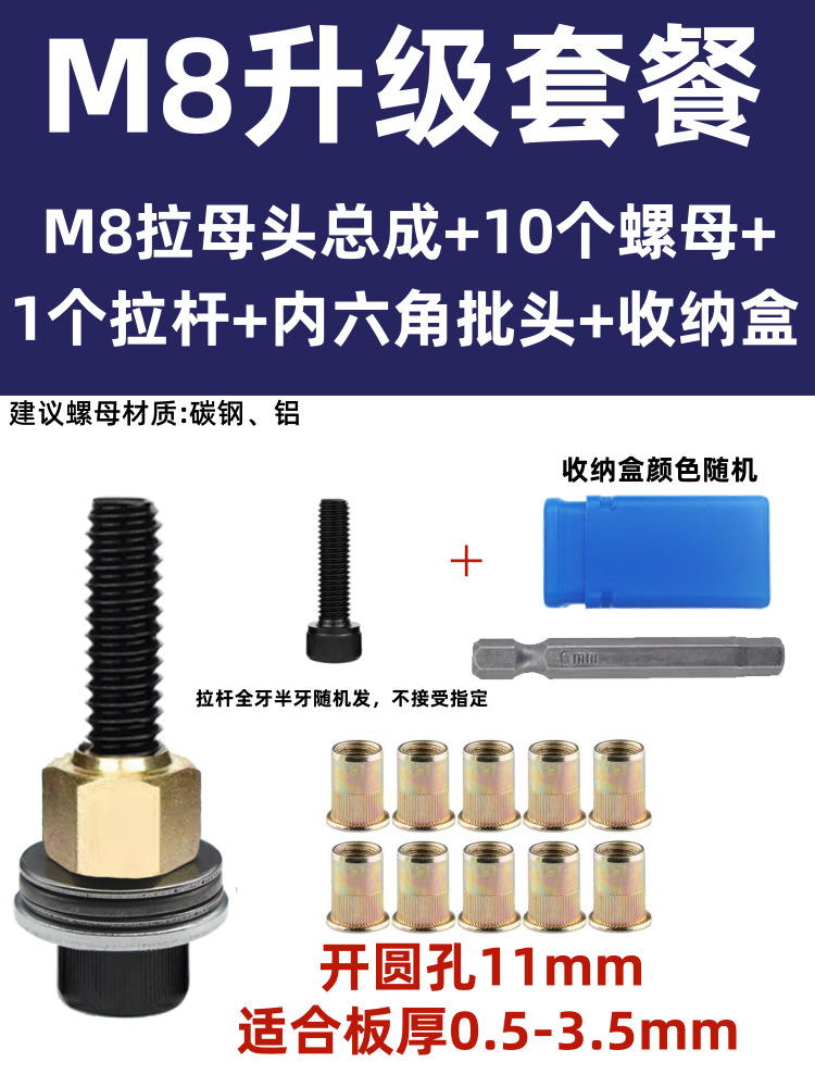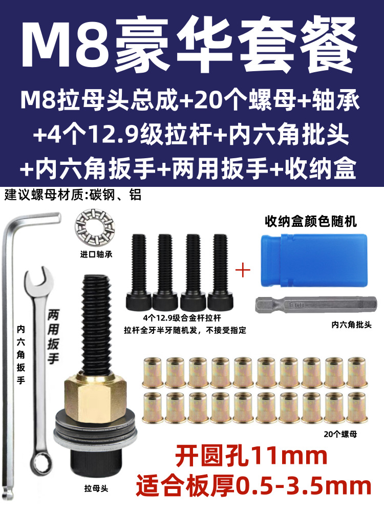 • M8 암 풀 헤드에는 전기 드릴 비트 + 타이 로드 1개 + 리벳 너트 10개가 함께 제공됩니다.