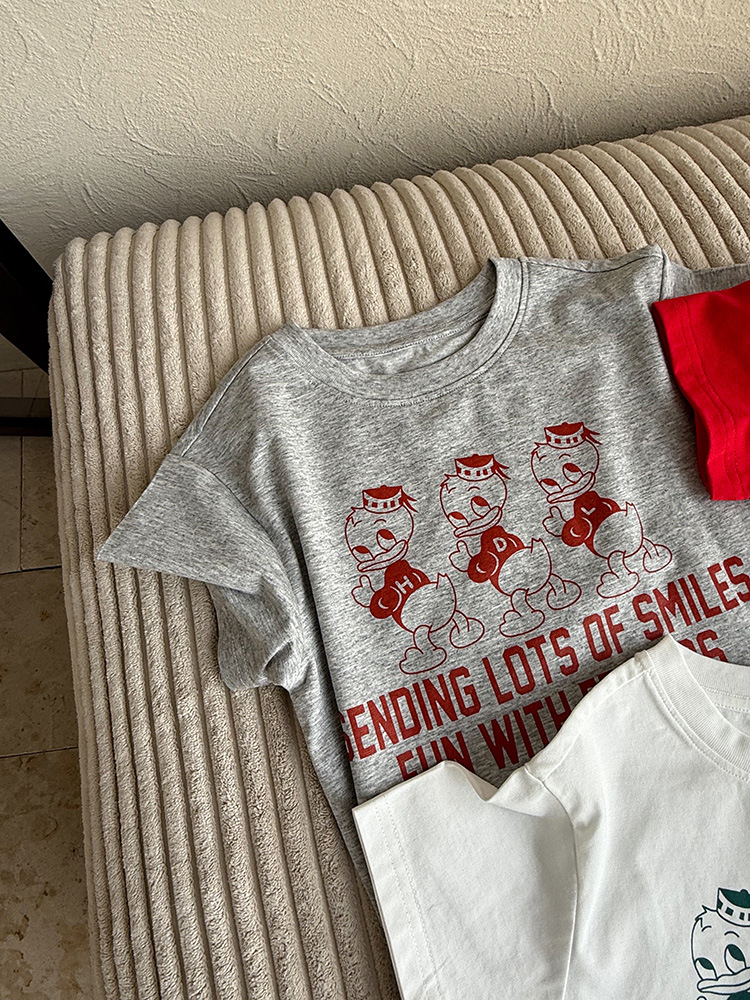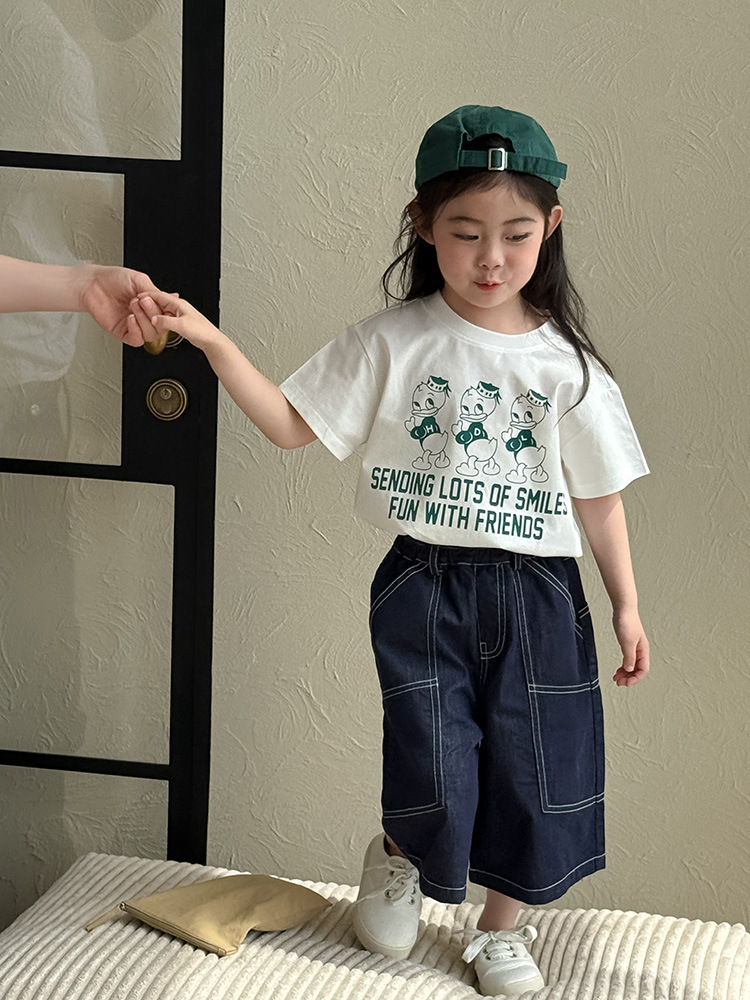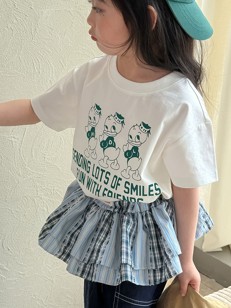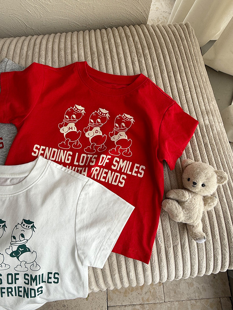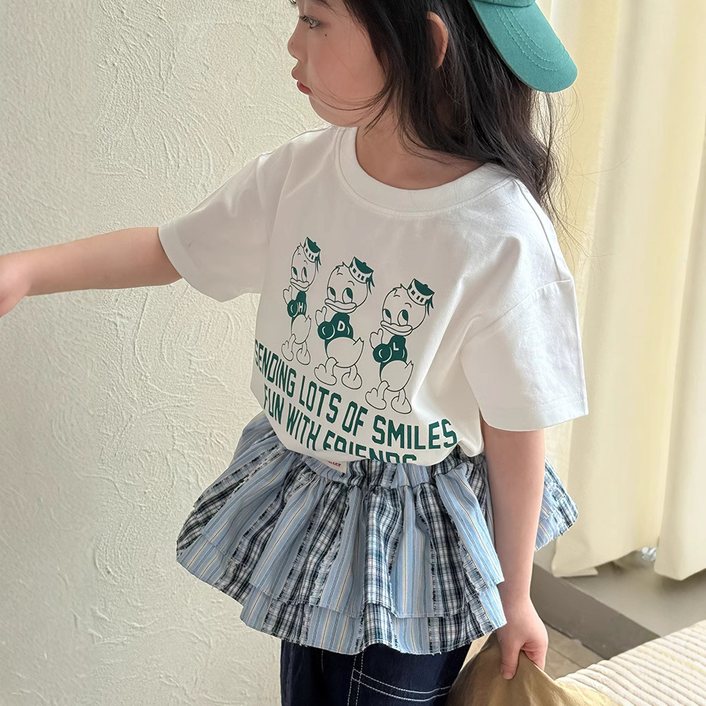 DD 같은 스타일 오리 티셔츠 2025 여름 새로운 일본 아동복 만화 소년 소녀를위한 귀여운 반팔 크루 넥 티셔츠스토어 가기