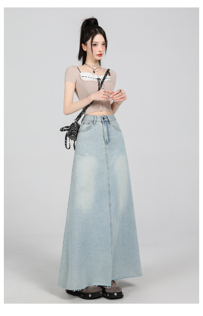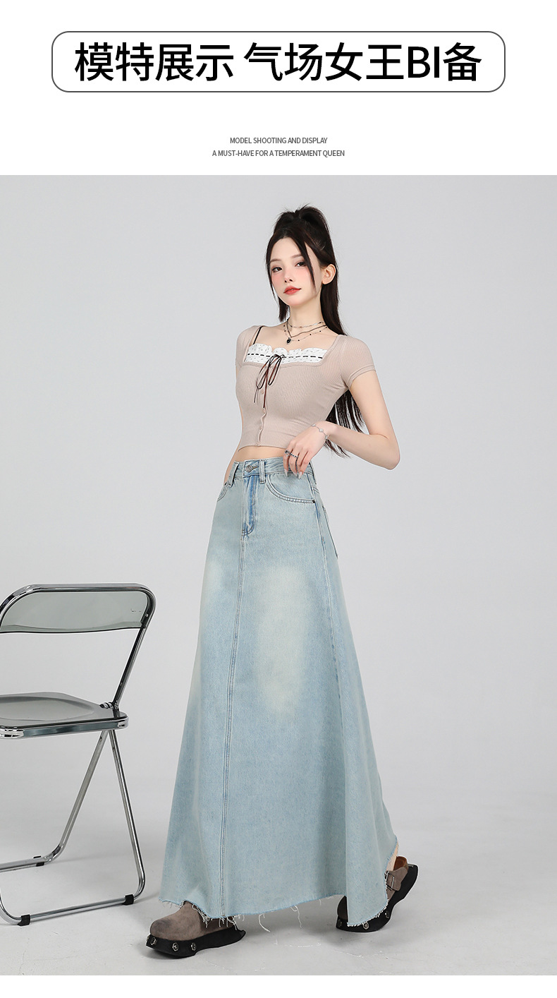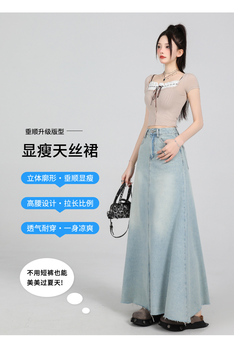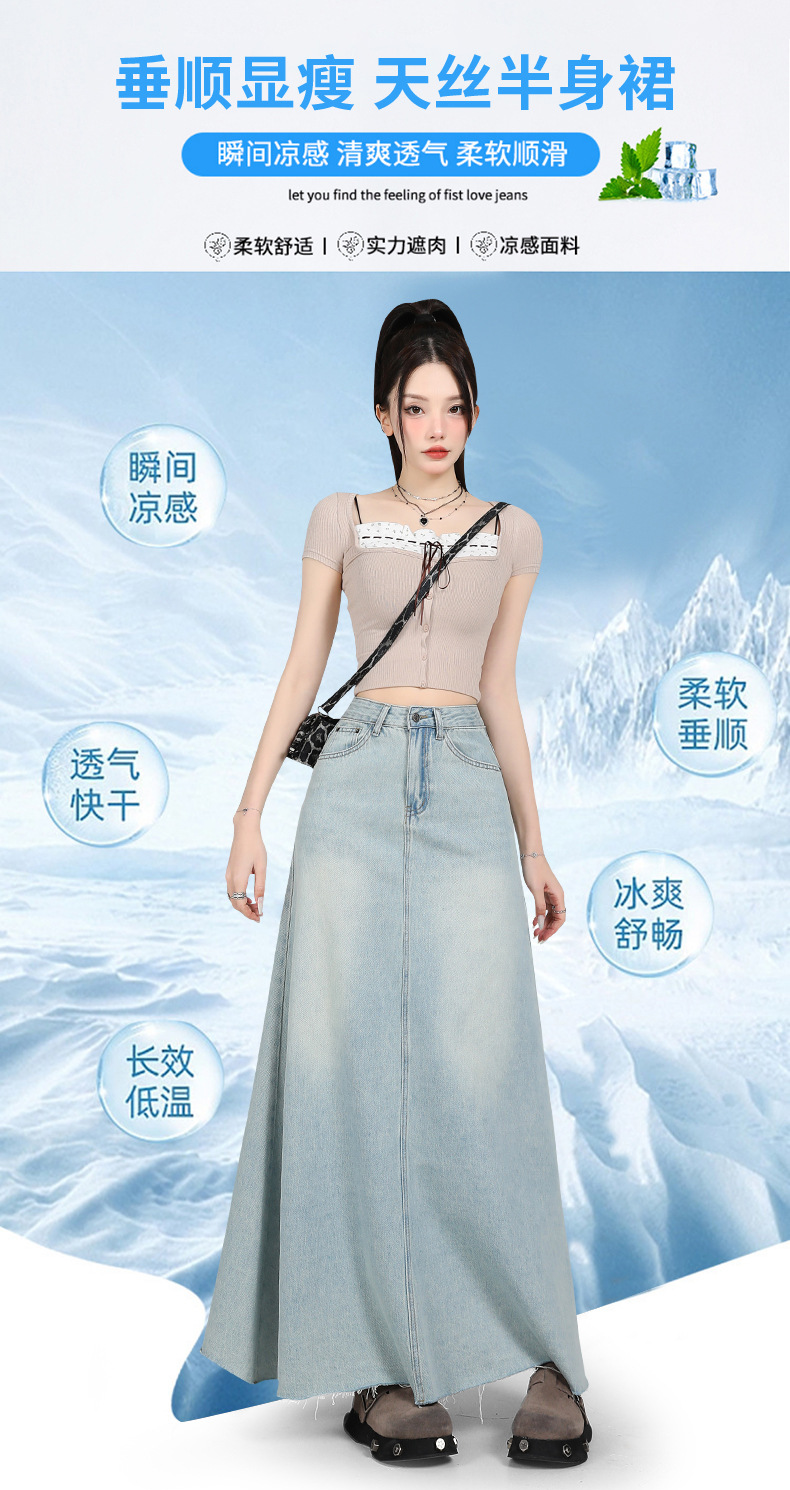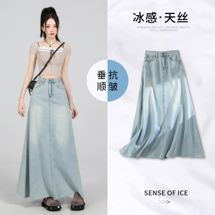 2318 텐셀 데님 스커트 여자 하이 웨이스트 2025 여름 얇은 A 라인 배 모양의 슬림 모양의 미드 길이 스커트