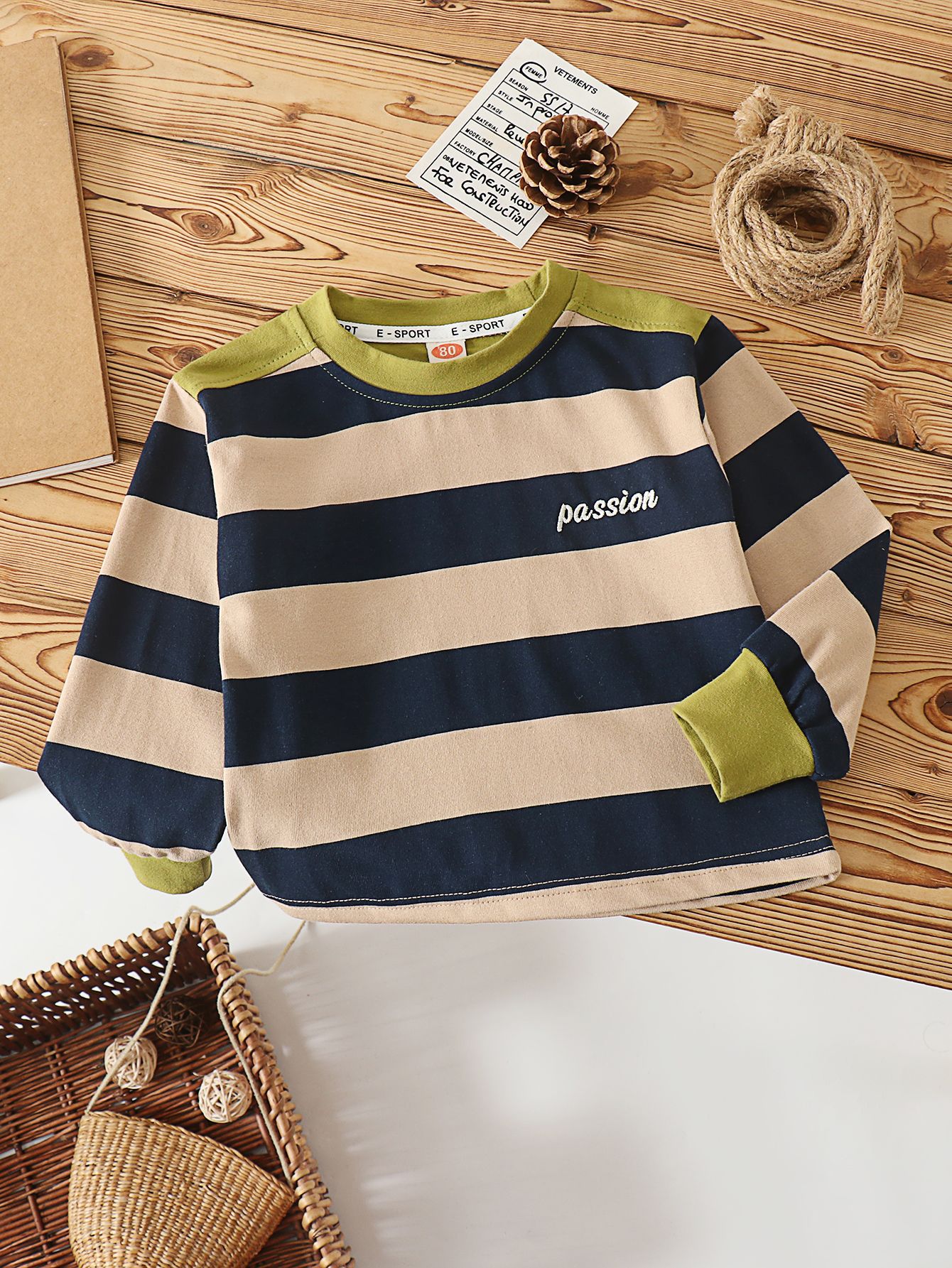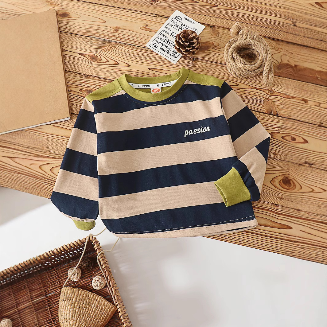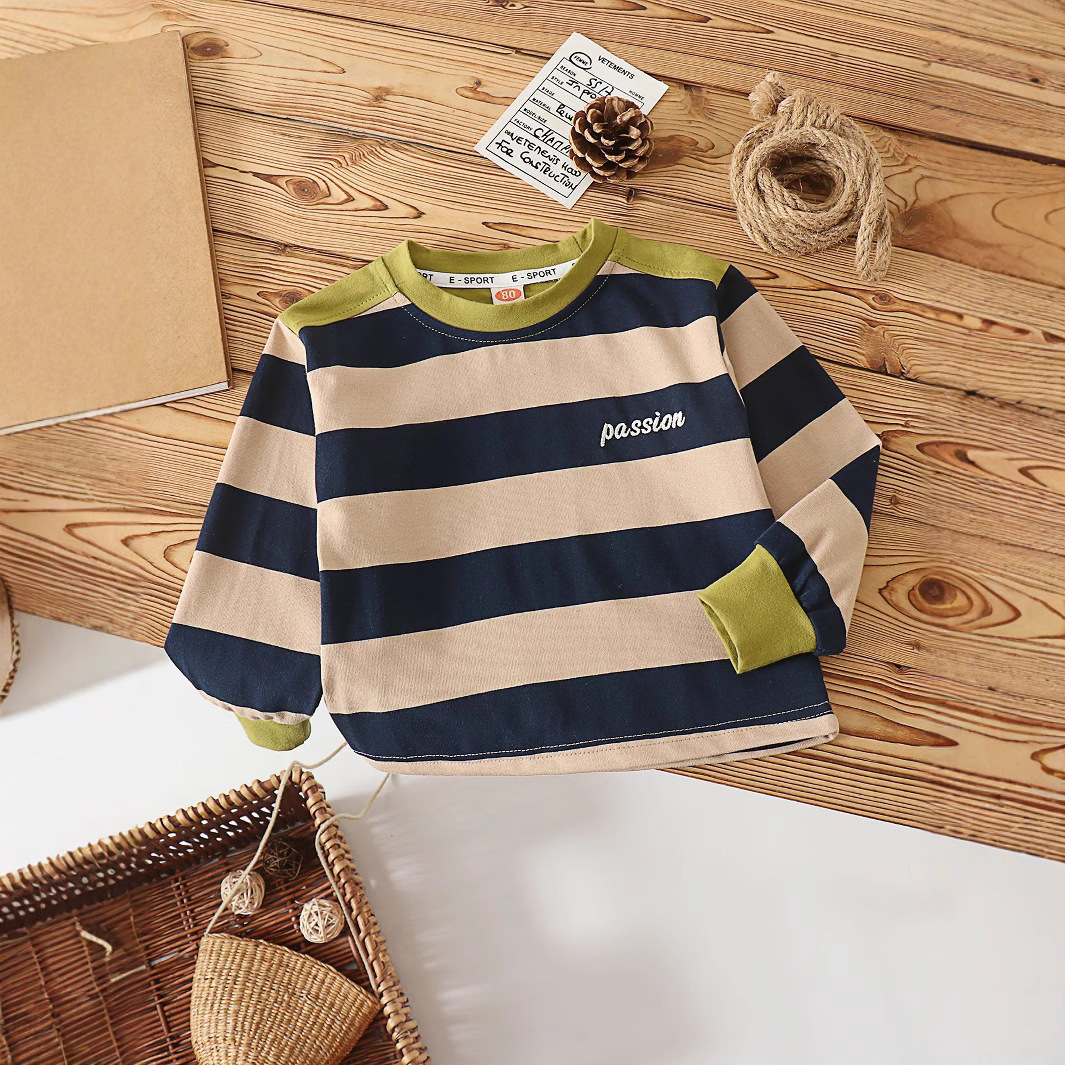 2025 봄과 가을 어린이 느슨한 편지 톱 소년의 산 잘 생긴 코튼 컬러 블록 스트라이프 스트레치 티셔츠 트렌디스토어 가기