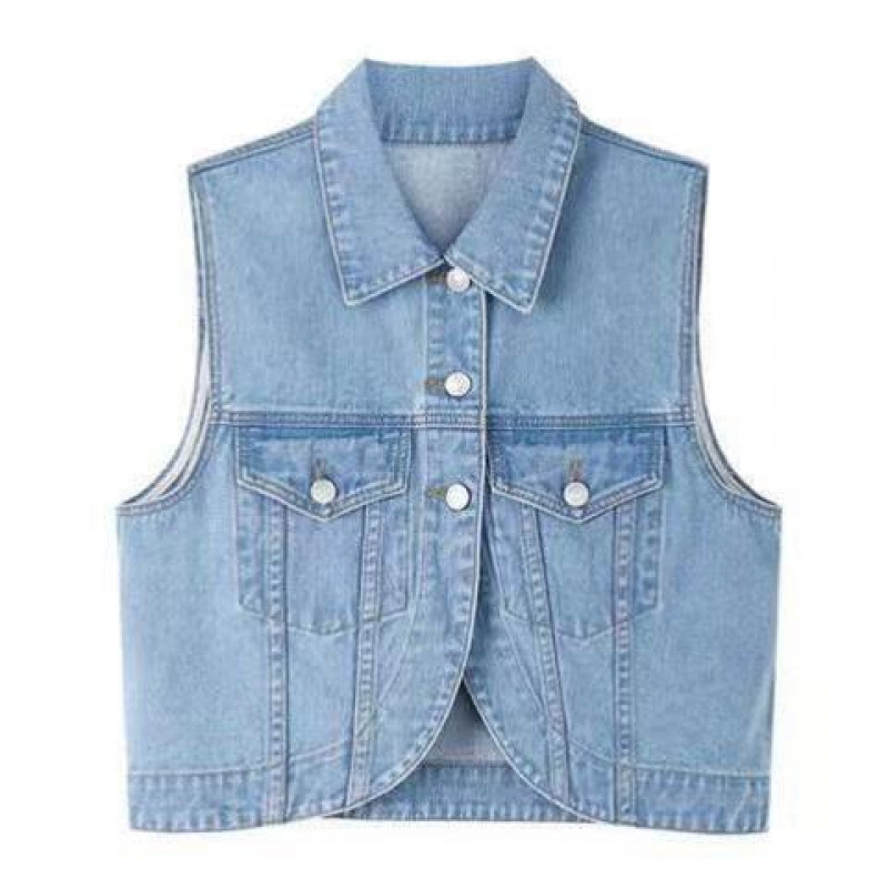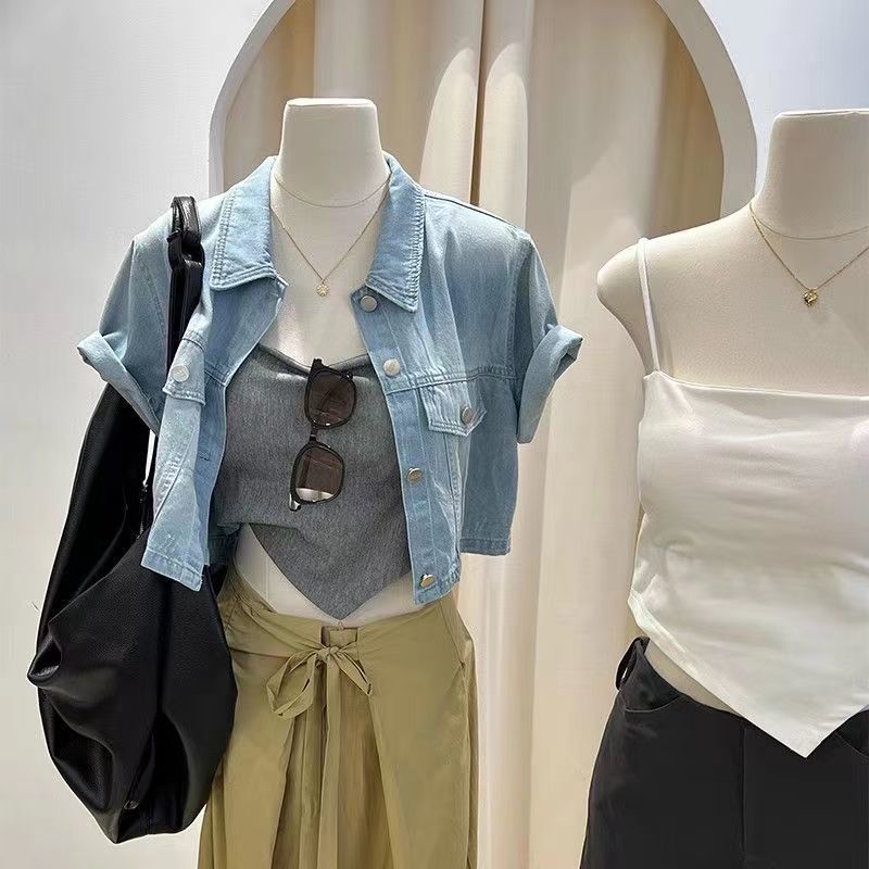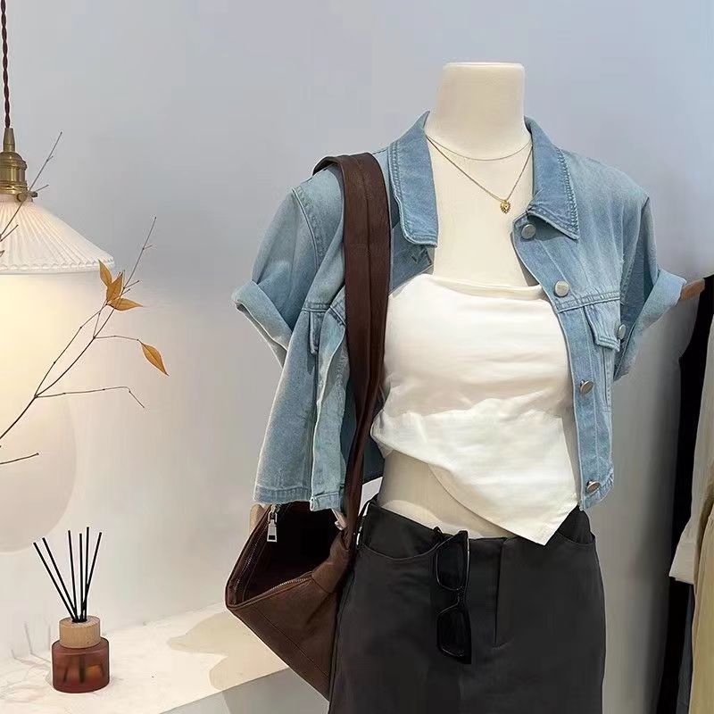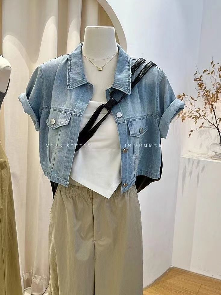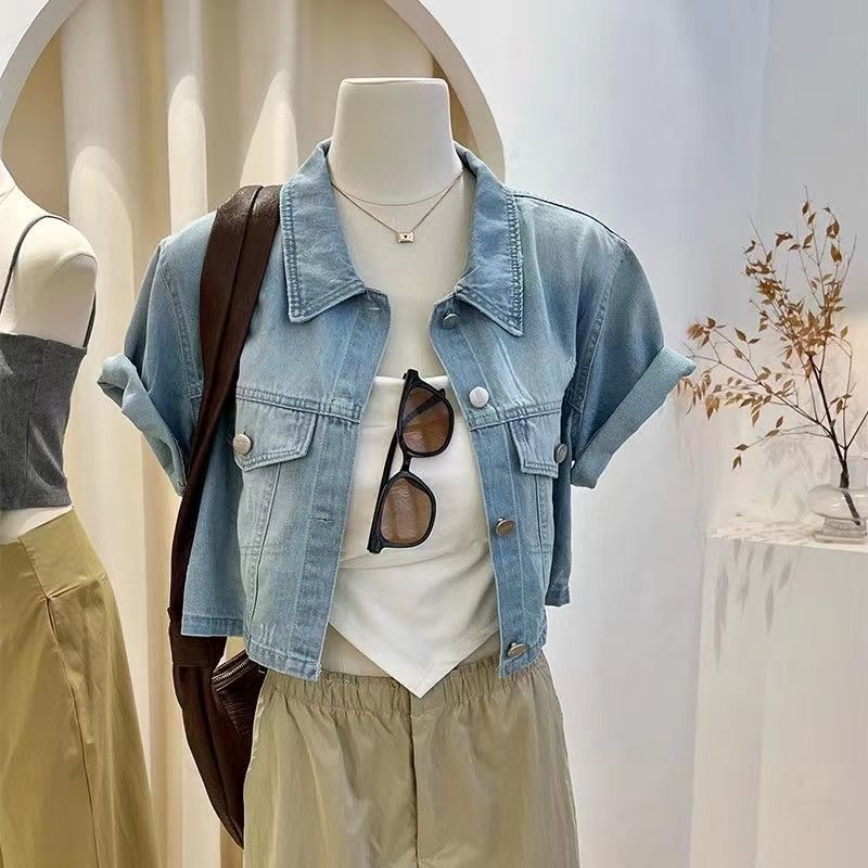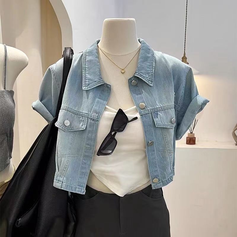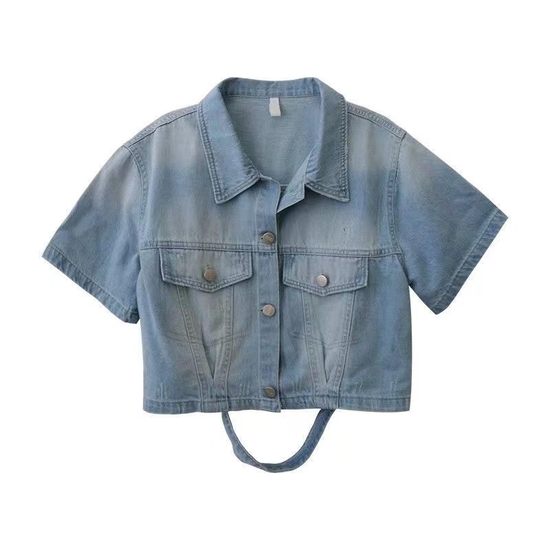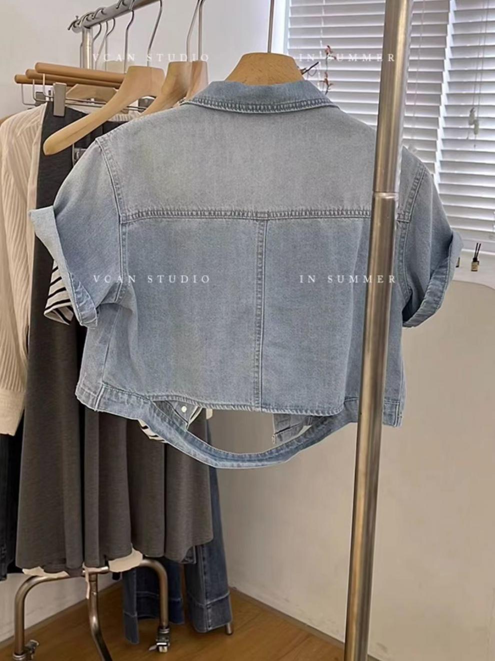 라이트 블루 데님 코트 여성용 여름 얇은 반팔 디자인 센스 세탁 된 느슨한 짧은 셔츠스토어 가기