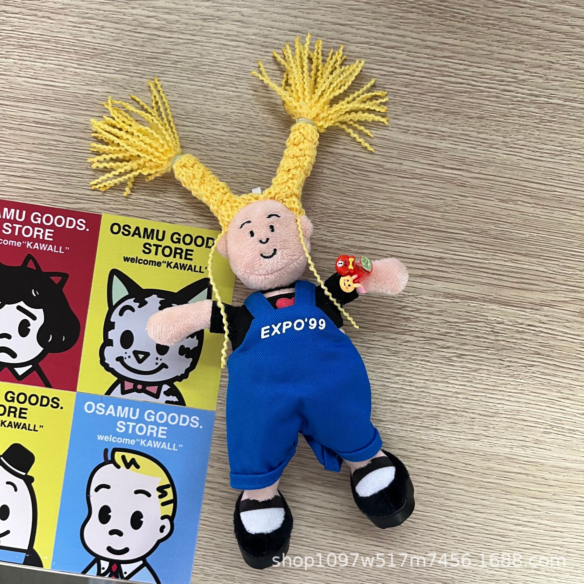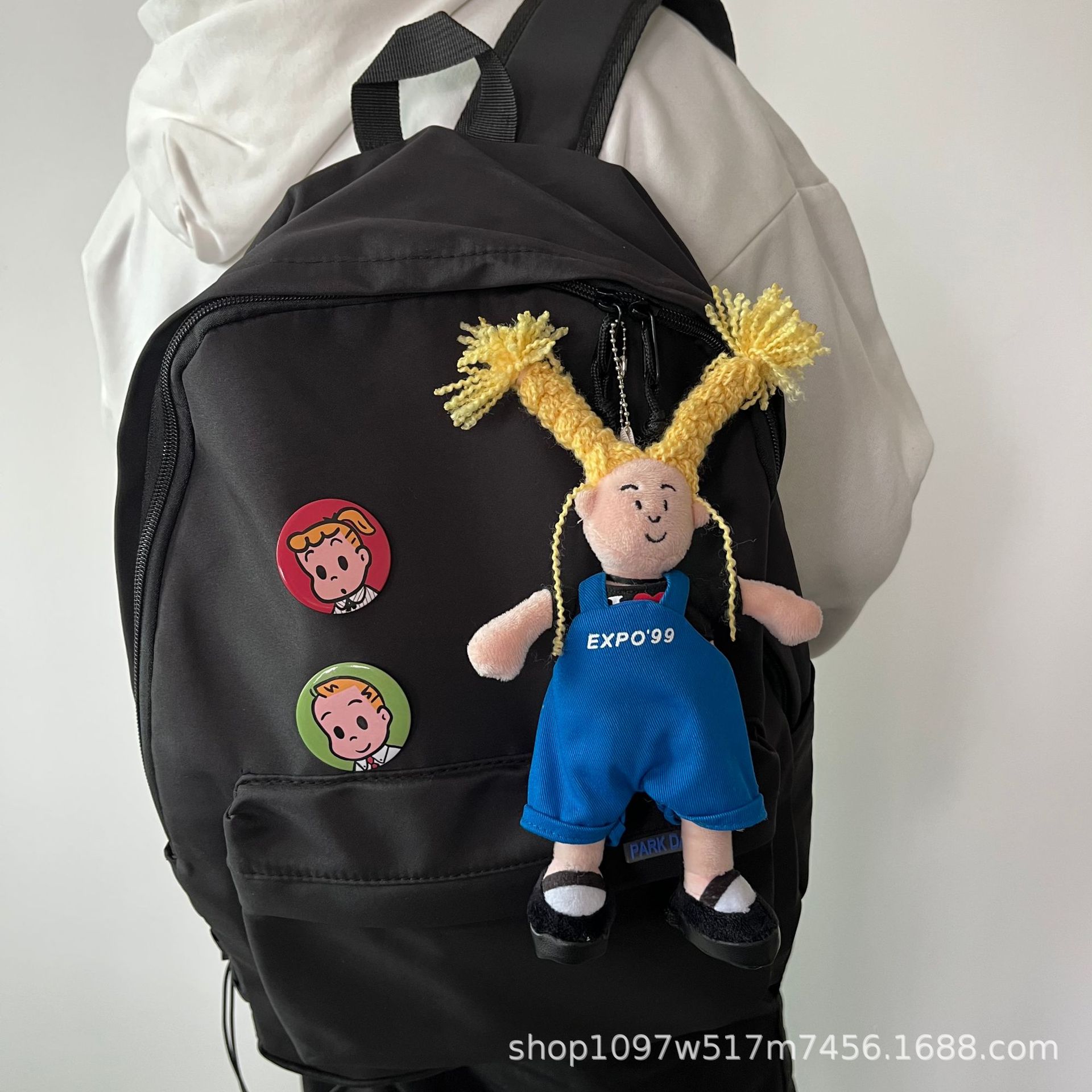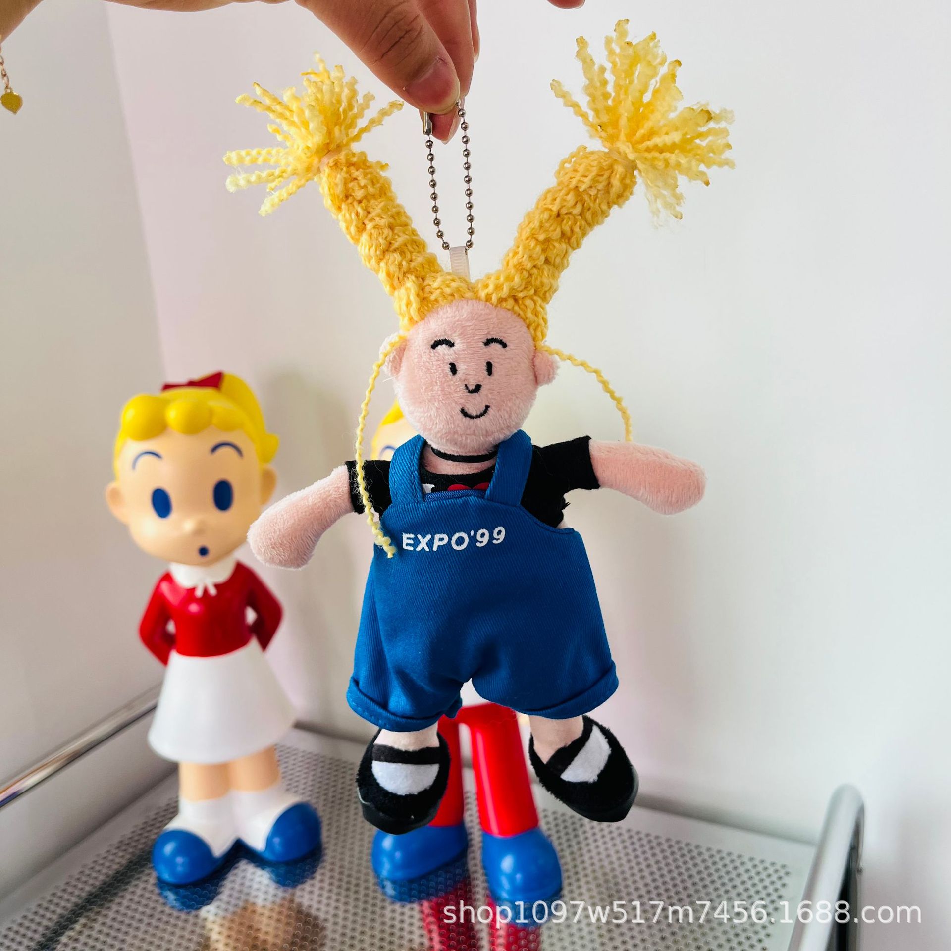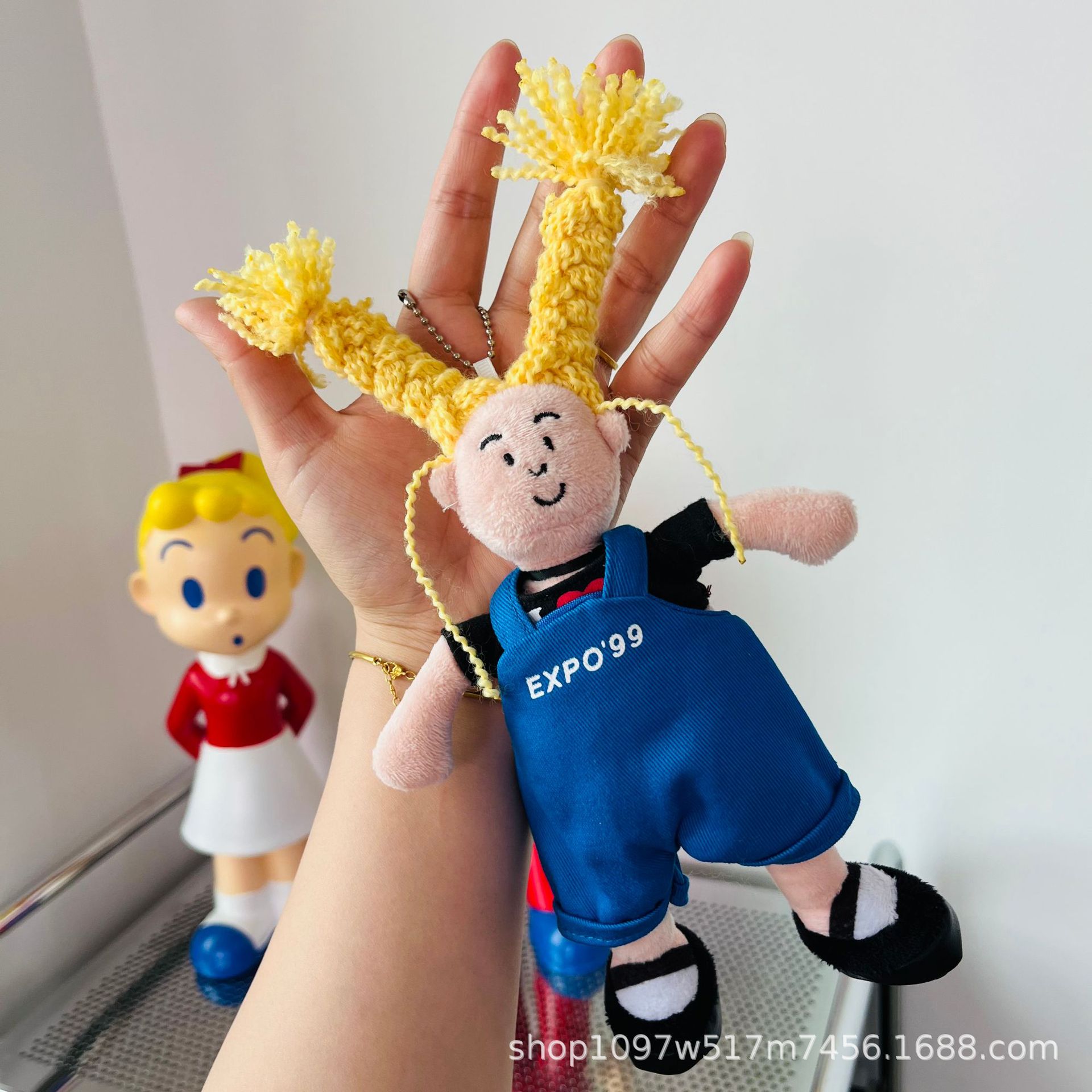 창조적 인 노란색 튀긴 머리 소녀 펜던트 브로치 못생긴 귀여운 인형 키 체인 블루 서스펜더 소녀 가방 교수형 액세서리스토어 가기