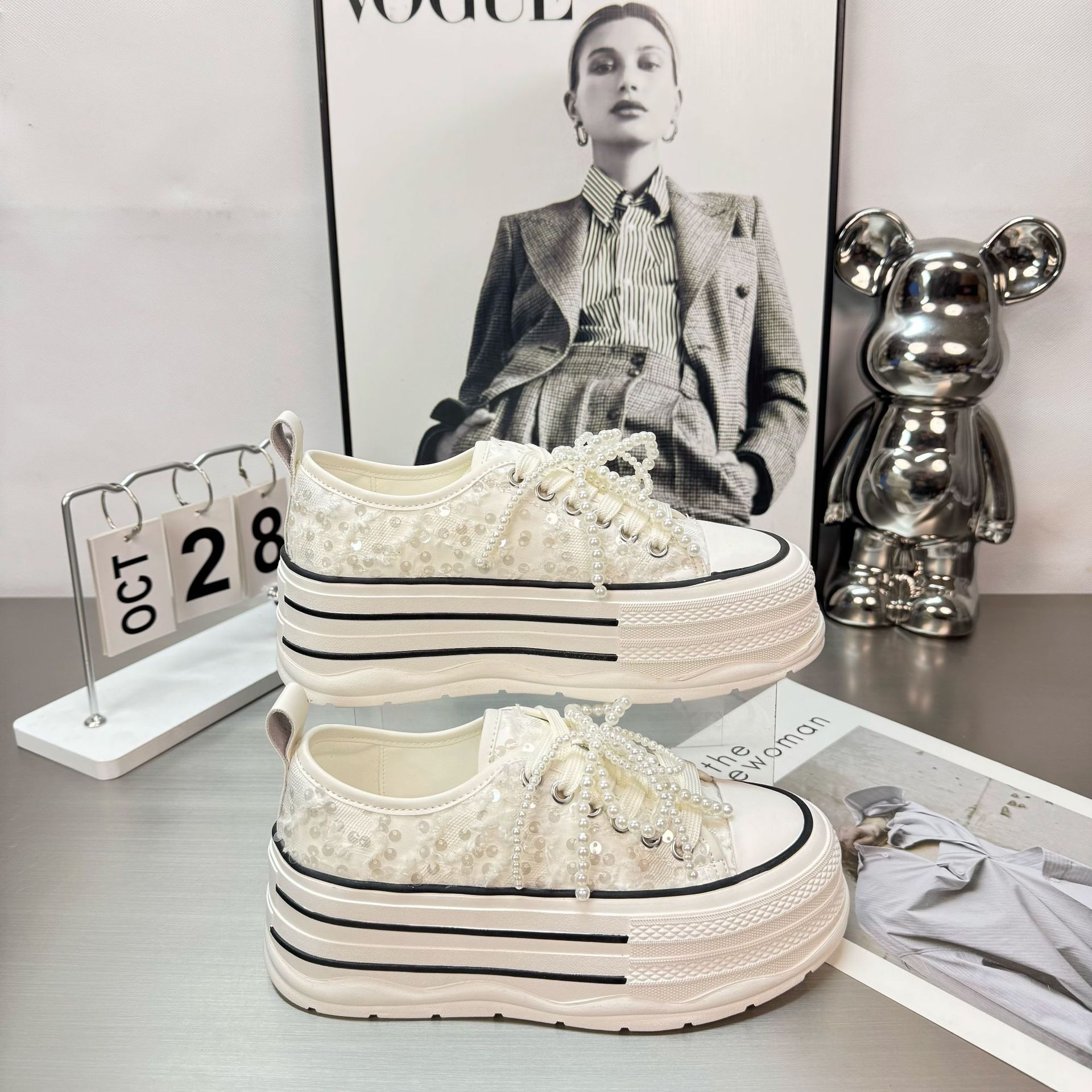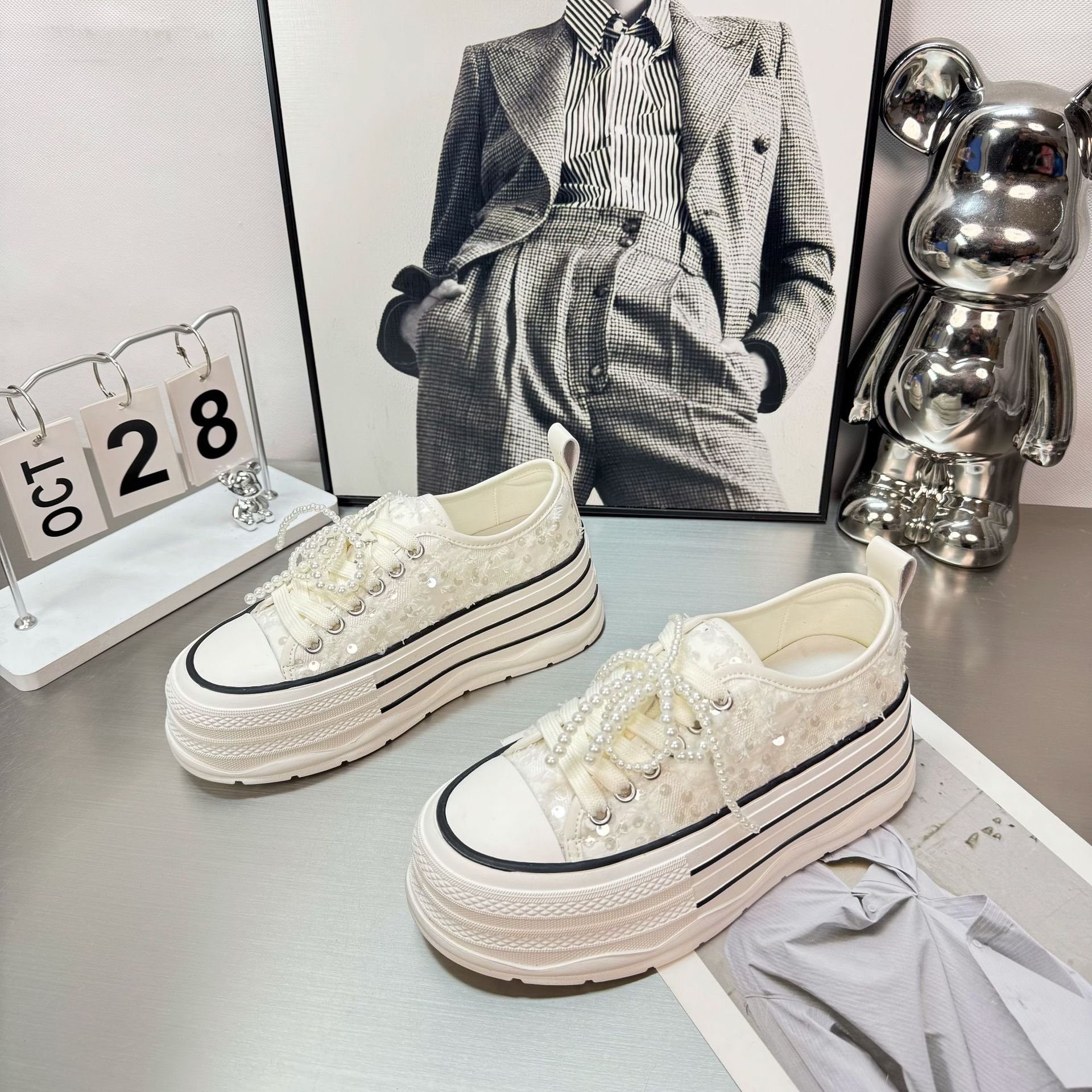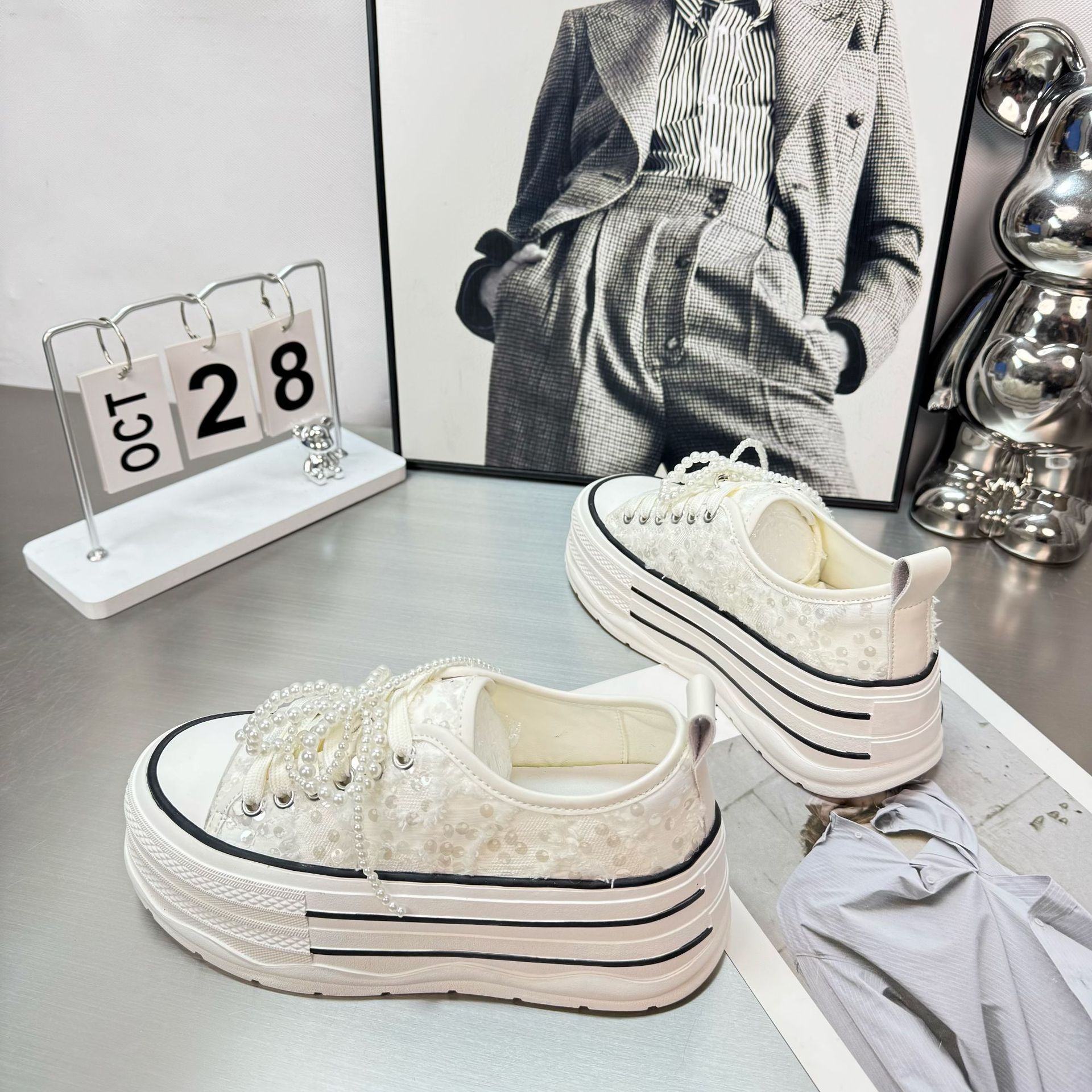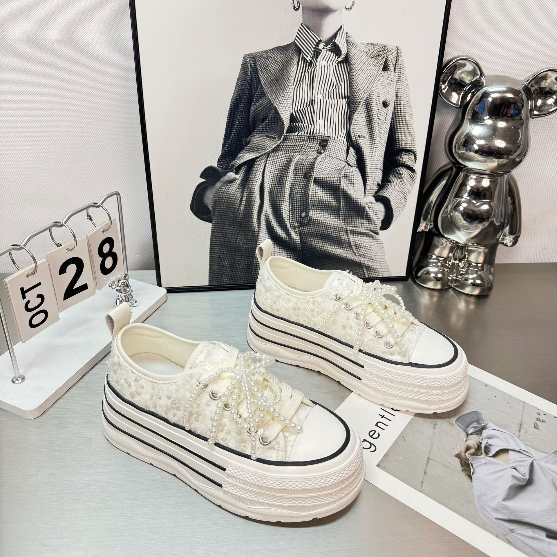 2025 봄 새로운 유럽 세퀸 캔버스 화이트 슈즈 여성 한국식 플랫폼 하이 솔 진주 캐주얼 슈즈스토어 가기