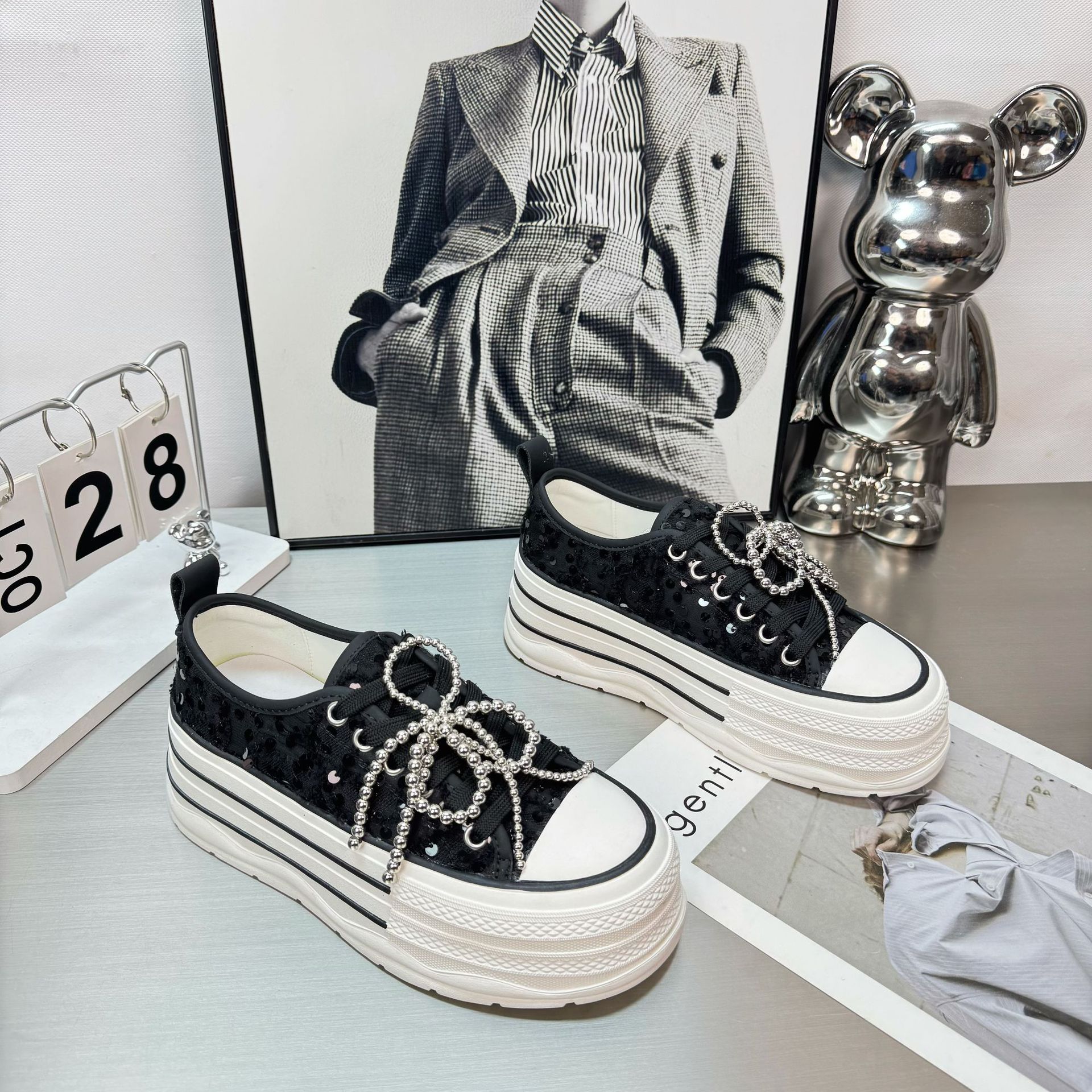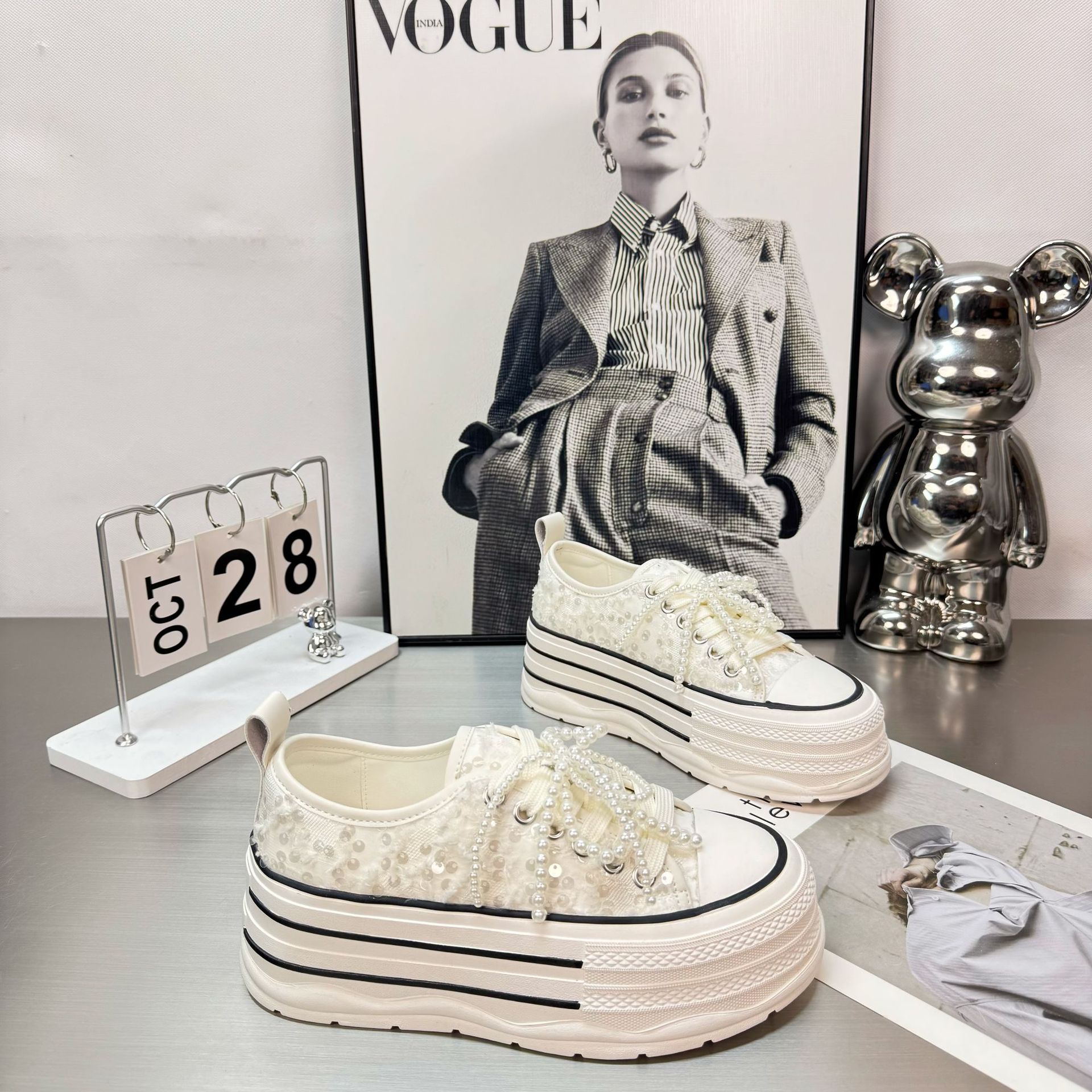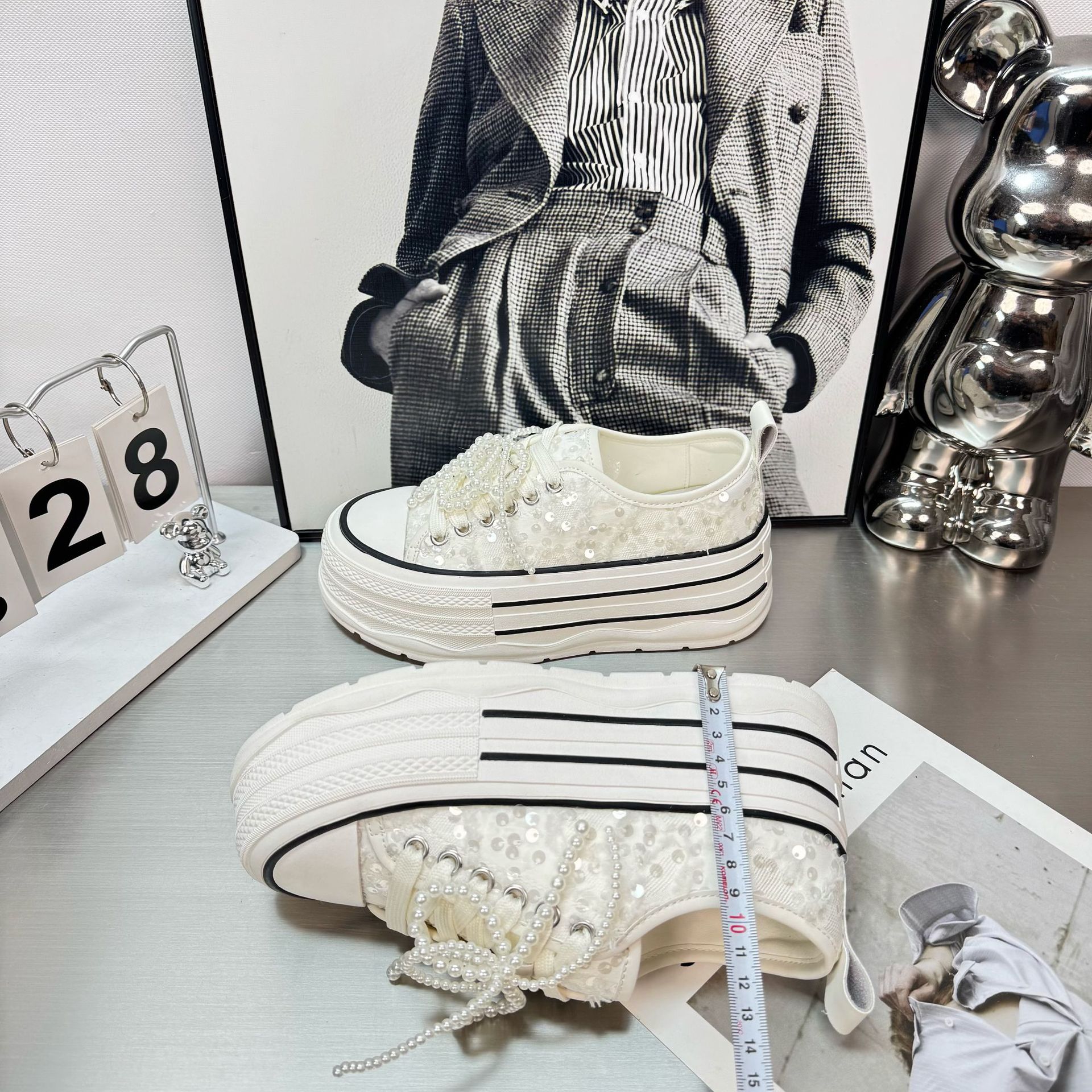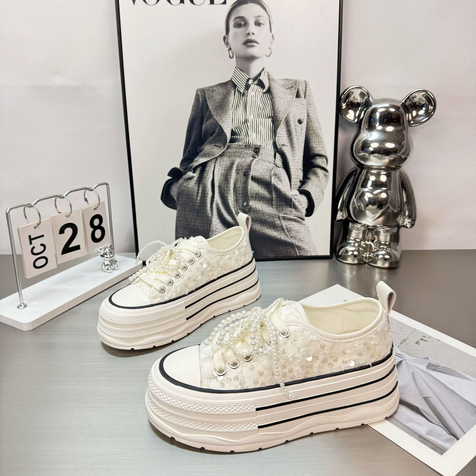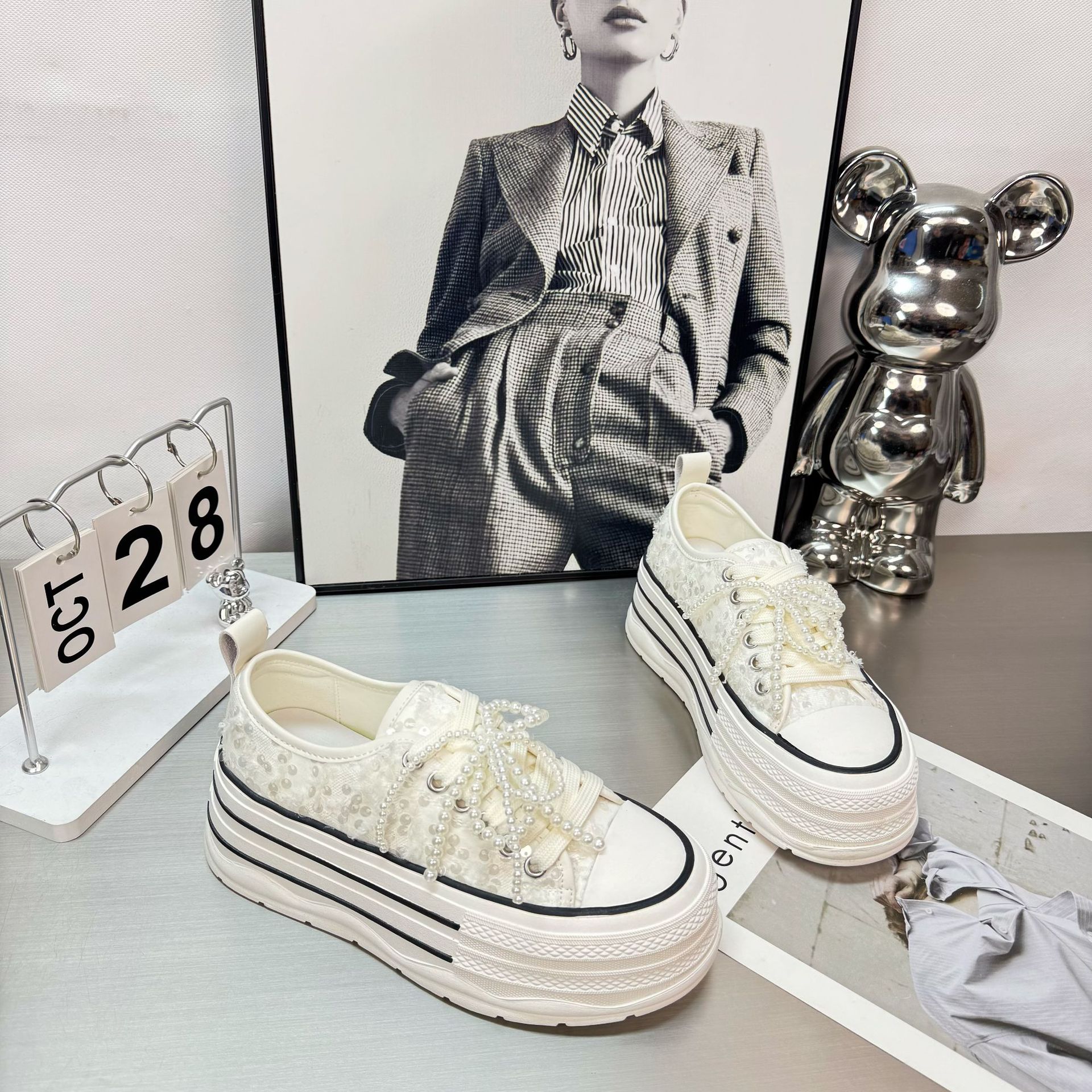 2025 봄 새로운 유럽 세퀸 캔버스 화이트 슈즈 여성 한국식 플랫폼 하이 솔 진주 캐주얼 슈즈스토어 가기