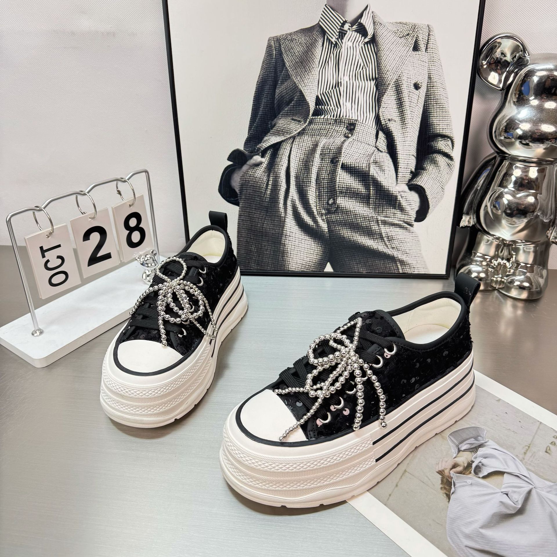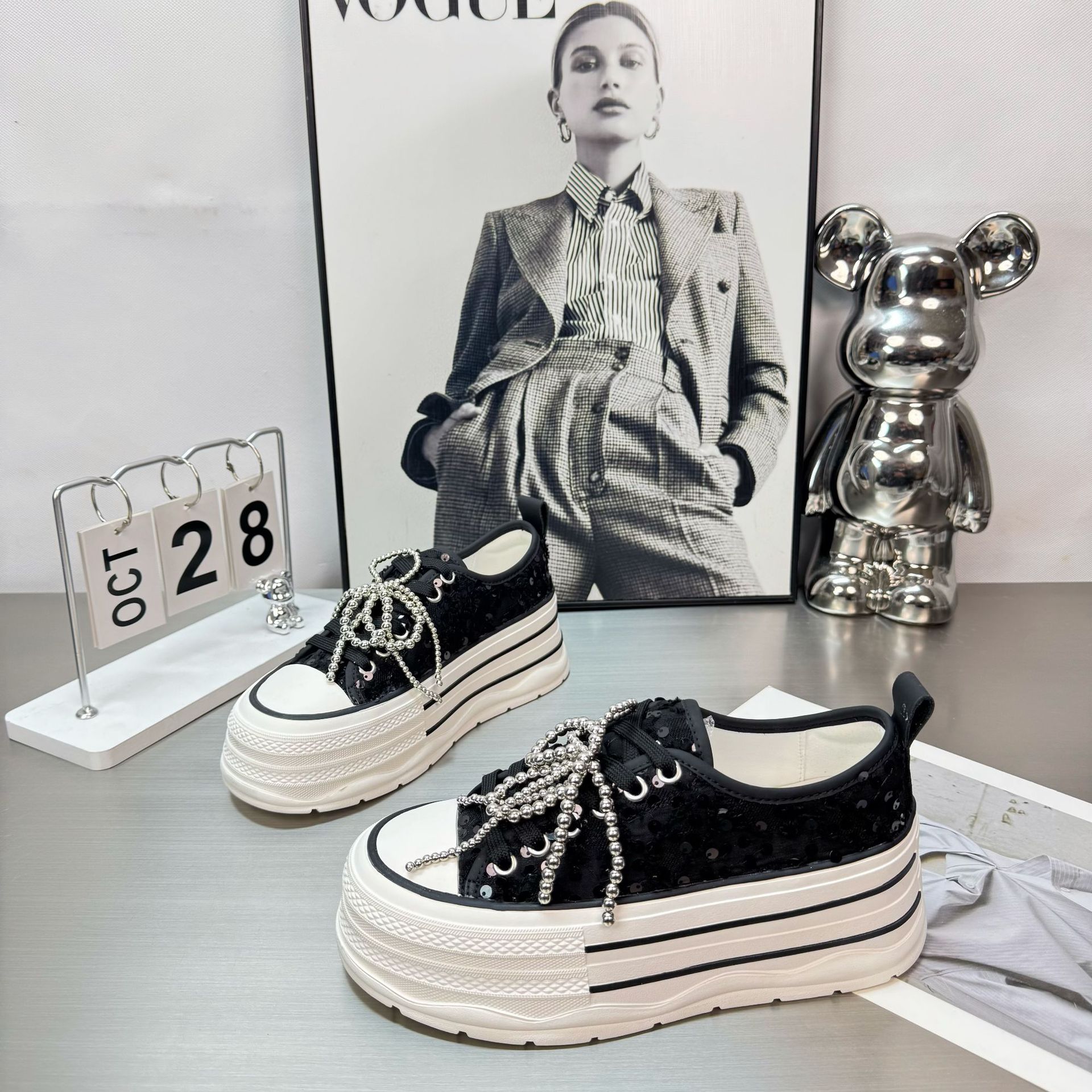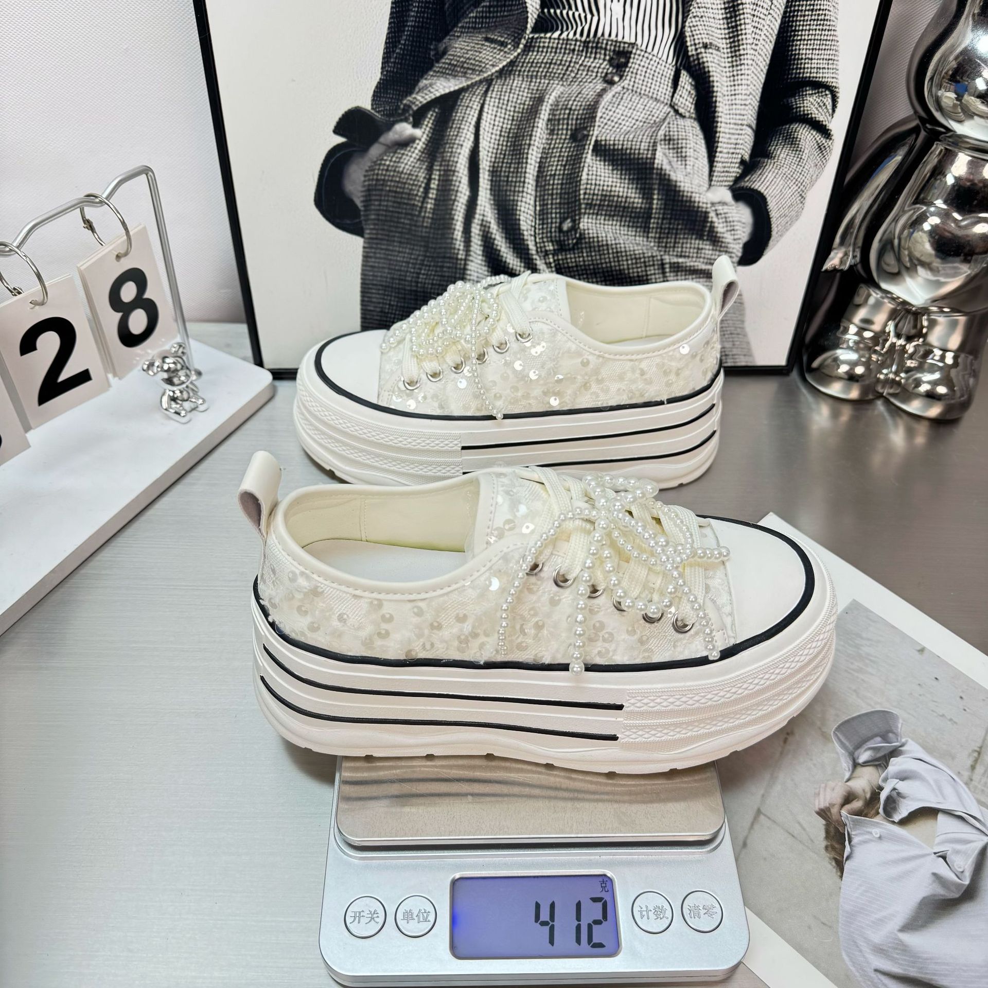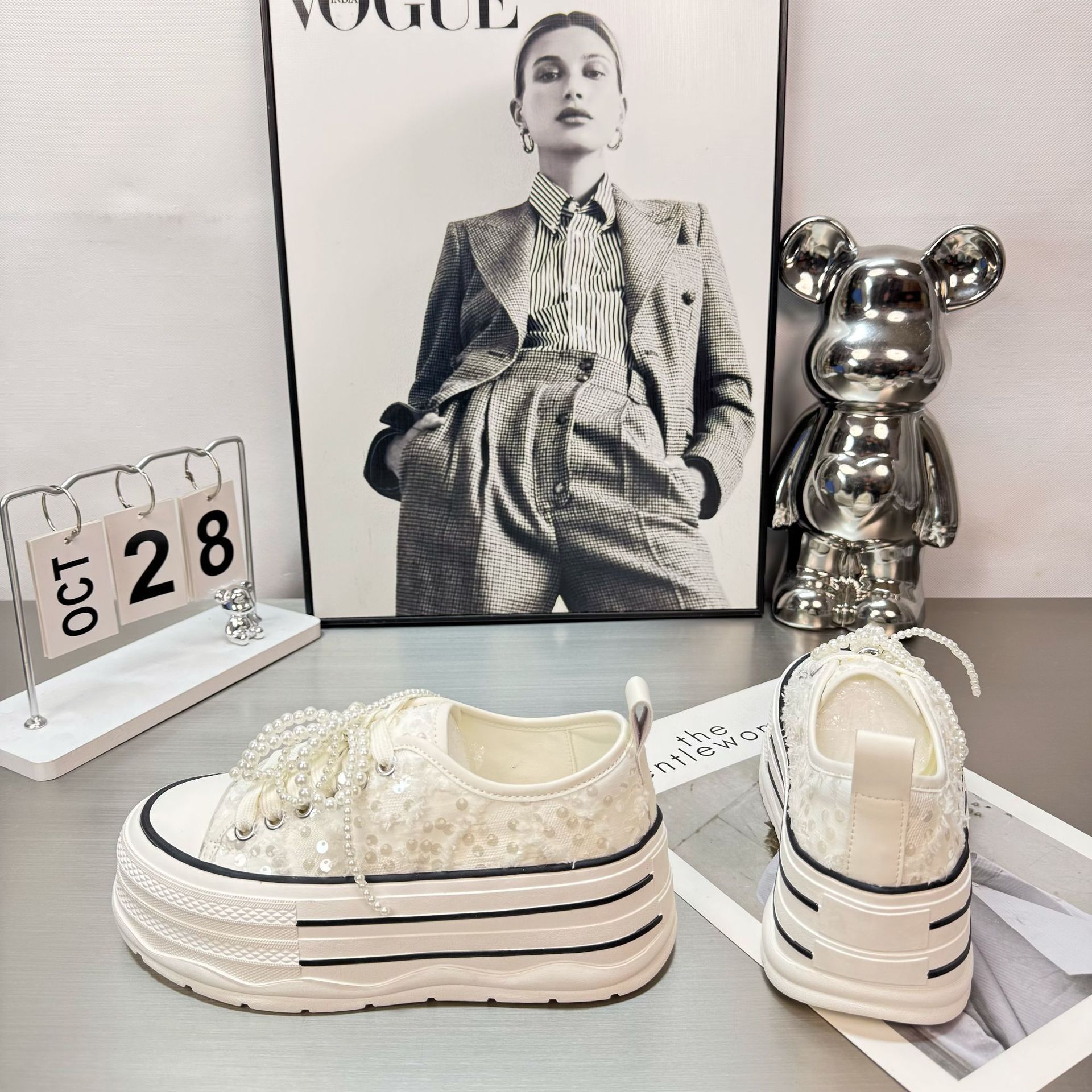 2025 봄 새로운 유럽 세퀸 캔버스 화이트 슈즈 여성 한국식 플랫폼 하이 솔 진주 캐주얼 슈즈스토어 가기