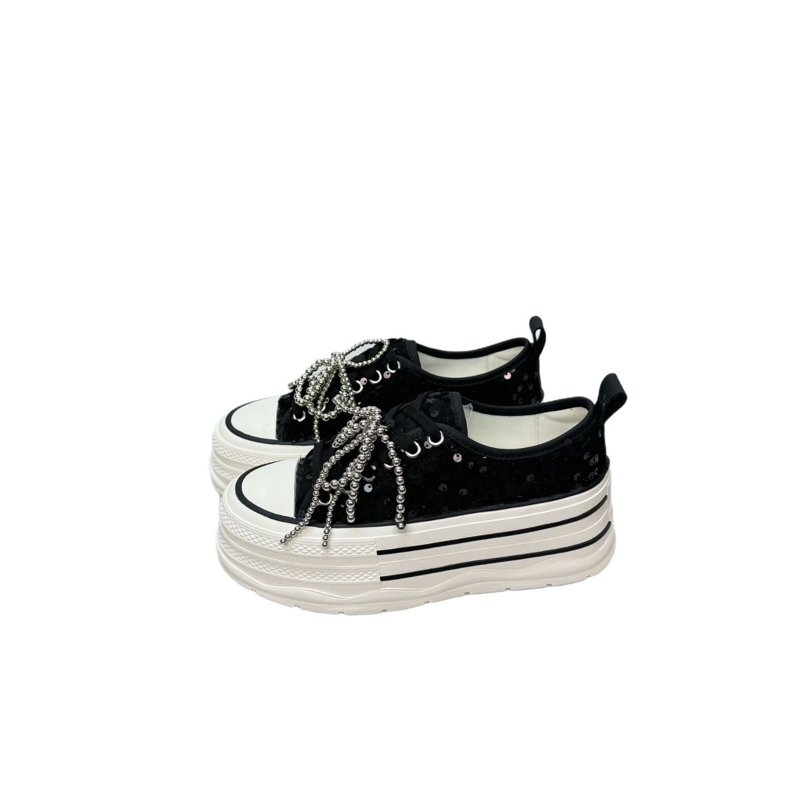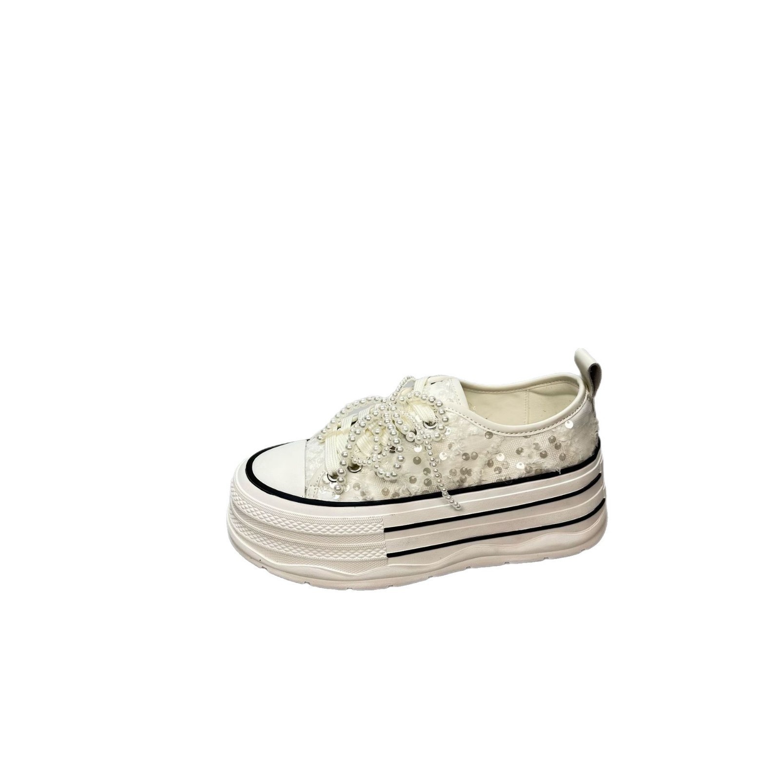2025 봄 새로운 유럽 세퀸 캔버스 화이트 슈즈 여성 한국식 플랫폼 하이 솔 진주 캐주얼 슈즈