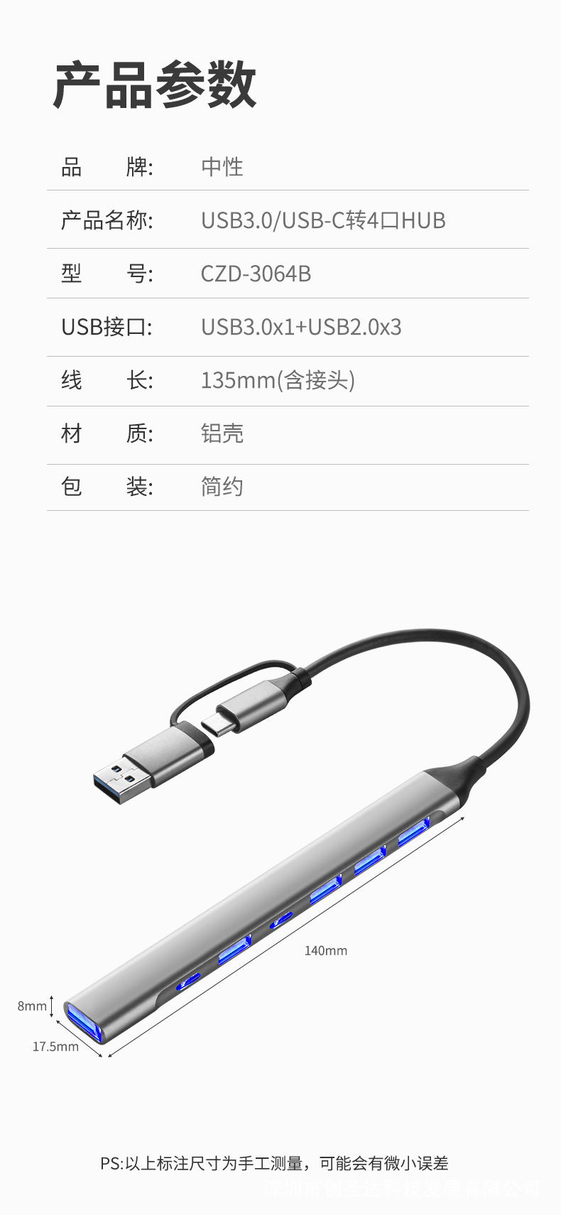 • 0.15M USB3.0 인터페이스 [USB3.0x4+Type-C 전원 공급 포트] 플라스틱 쉘 사각형 검정색