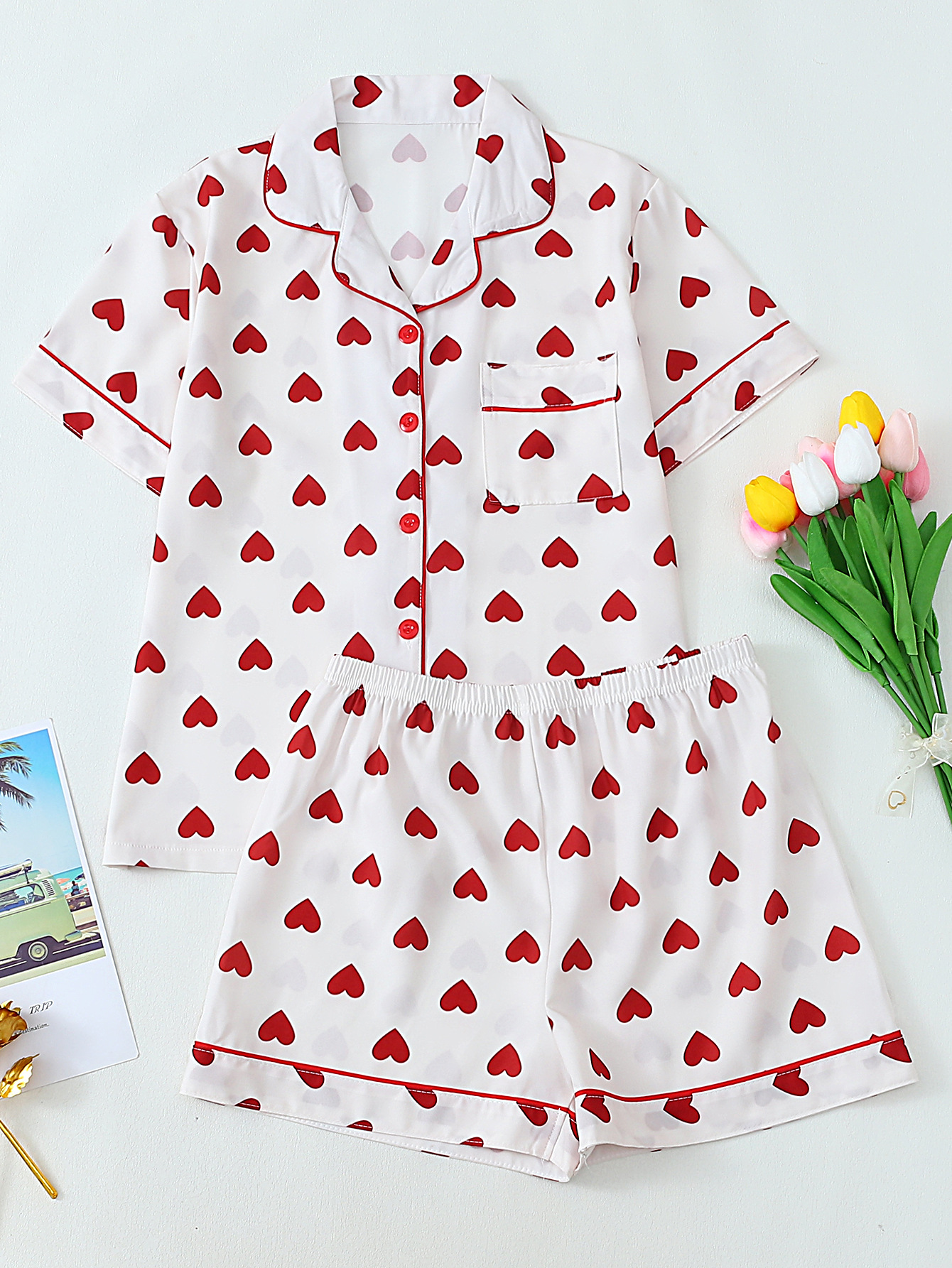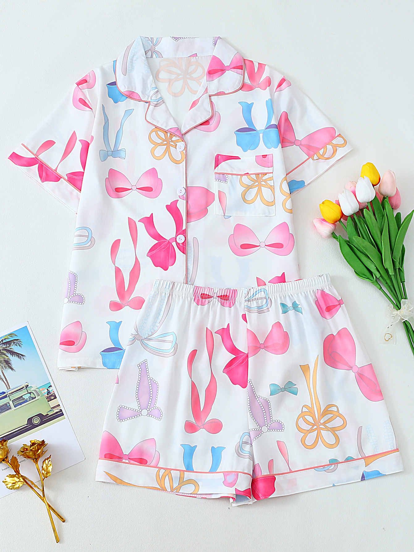 크로스-국경 느슨한 캐주얼 카디건 파자마 유럽과 미국의 패션 디자인 센스 멀티 컬러 인쇄 반팔 반바지 투피스 세트 여성