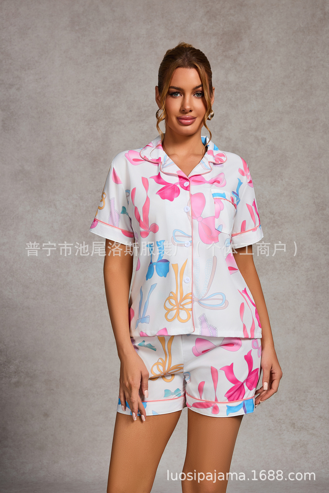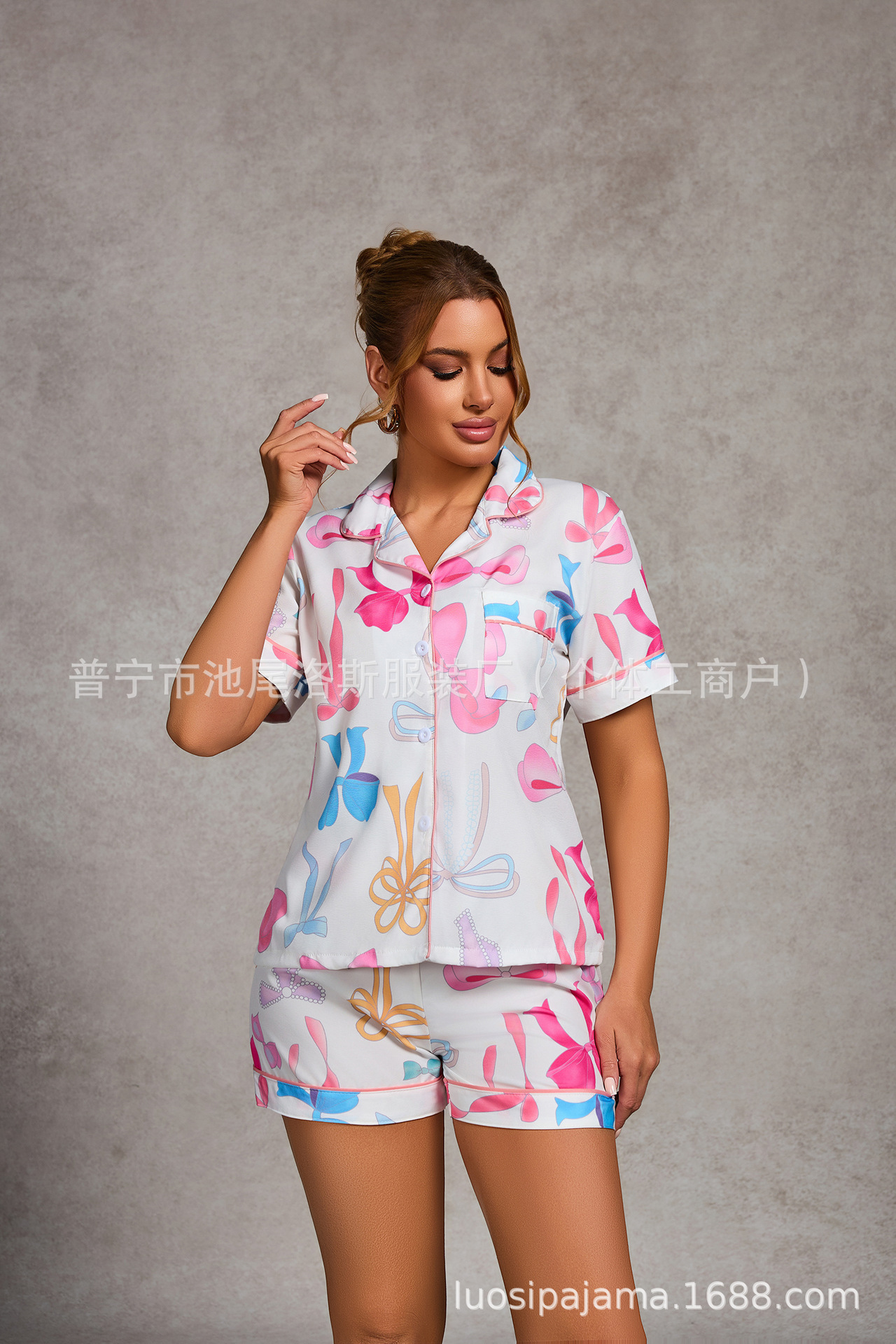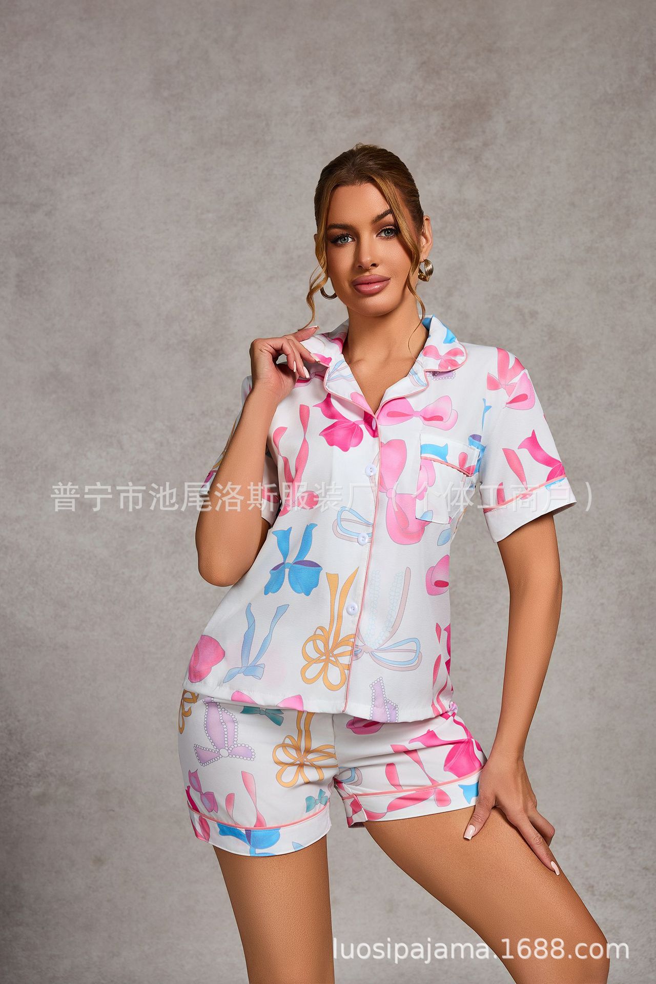 크로스-국경 느슨한 캐주얼 카디건 파자마 유럽과 미국의 패션 디자인 센스 멀티 컬러 인쇄 반팔 반바지 투피스 세트 여성스토어 가기